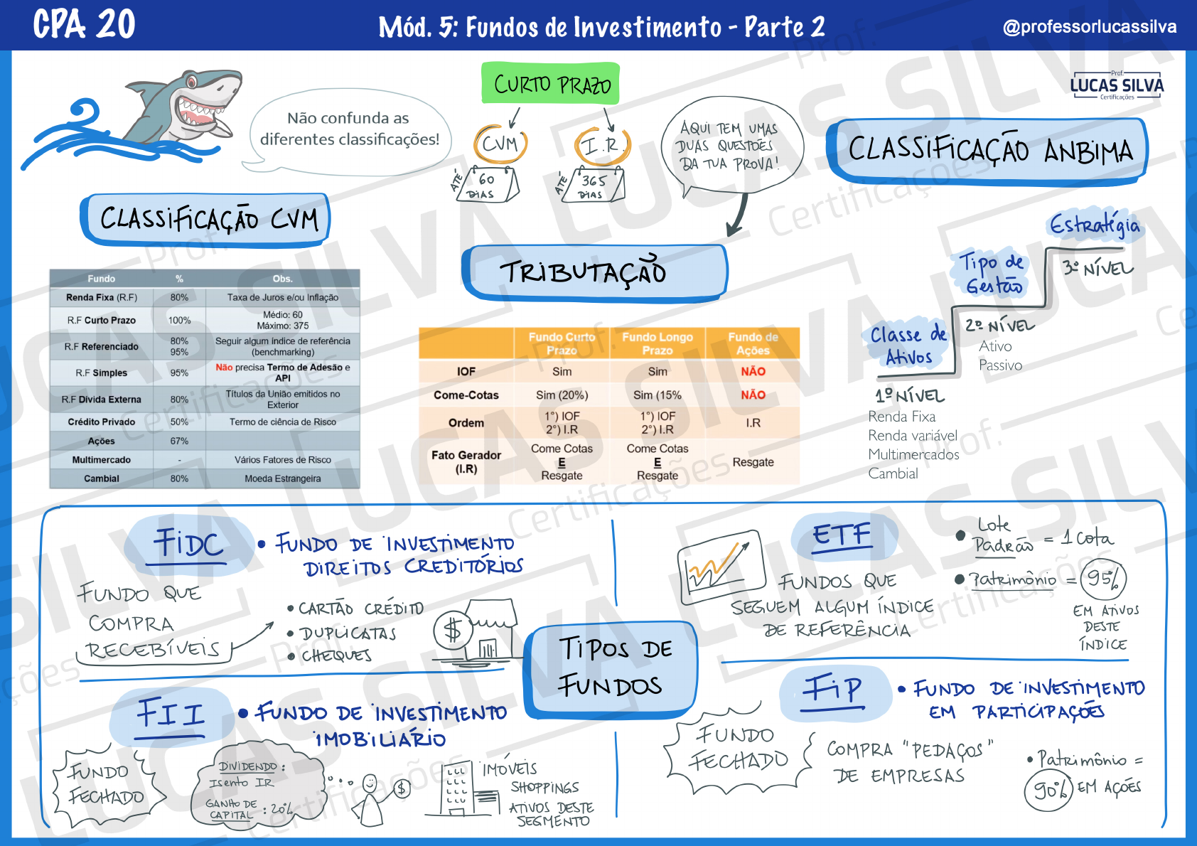 CPA 20 Mód. 5: Fundos de Investimento - Parte 2 @professorlucassilva SIL CURTO PRAZO LUCAS SILVA Certificações Não confunda as AQUI TEM UMAS diferentes classificações! CVM DUAS QUESTOES CLASSIFICAÇÃO ANBIMA DA TUA PROVA! 60 365 DIAS DIAS CVM Fundo % Obs. TRIBUTAÇÃO Tipo de 30 NÍVEL Gestas Renda Fixa (R.F) 80% Taxa de Juros e/ou Inflação R.F Curto Prazo 100% Médio: 60 Máximo: 375 NÍVEL 80% Seguir algum indice de referência Fundo Curto Fundo Longo Fundo de Classe de R.F Referenciado 95% (benchmarking) Prazo Prazo Ações Ativo Ativos R.F Simples 95% Não precisa Termo de Adesão e IOF Sim Sim NÃO Passivo API R.F Dívida Externa da União emitidos no 80% Come-Cotas Sim (20%) Sim (15% NÍVEL Exterior Crédito Privado 50% Termo de ciência de Risco Ordem 1°) IOF 1°) IOF I.R Renda Fixa 2°) I.R 2°) I.R Ações 67% Renda variável Come Cotas Come Cotas Multimercado Vários Fatores de Risco Fato Gerador Multimercados of (I.R) E E Cambial 80% Moeda Estrangeira Resgate Resgate Resgate Cambial ETF Lote FUNDO DE INVESTIMENTO Padraw = 1 cota DIREITOS CREDITORIOS W FUNDO QUE FUNDOS QUE SEGUEM ALGUM ÍNDICE Patrimonio = CARTAO CREDITO EM ATIVOS COMPRA DUPLICATAS $ DE DESTE RECEBÍVEIS CHEQUES TiPos DE FUNDOS FUNDO DE INVESTIMENTO FII FUNDO DE INVESTIMENTO EM PARTICIPAÇÕES FUNDO FUNDO DIVIDENDO : IMOVEIS FECHADO COMPRA "PEDAÇOS" Patrimonio = Isento IR DE EMPRESAS FECHADO $ SHOPPINGS 90% EM GANHO DE CAPITAL ATIVOS DESTE SEGMENTO