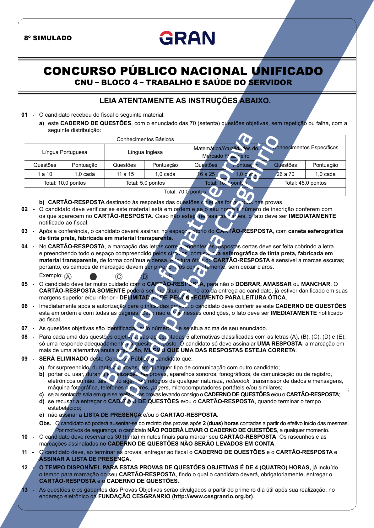 CONCURSO PÚBLICO NACIONAL UNIFICADO CNU – BLOCO 4 – TRABALHO E SAÚDE DO SERVIDOR LEIA ATENTAMENTE AS INSTRUÇÕES ABAIXO. 01 - O candidato recebeu do fiscal o seguinte material: a) este CADERNO DE QUESTÕES, com o enunciado das 70 (setenta) questões objetivas, sem repetição ou falha, com a seguinte distribuição: Conhecimentos Básicos Conhecimentos Específicos Língua Portuguesa Língua Inglesa Matemática/Atualidades do Mercado Financeiro Questões Pontuação Questões Pontuação Questões Pontuação Questões Pontuação 1 a 10 1,0 cada 11 a 15 1,0 cada 16 a 25 1,0 cada 26 a 70 1,0 cada Total: 10,0 pontos Total: 5,0 pontos Total: 10,0 pontos Total: 45,0 pontos Total: 70,0 pontos b) CARTÃO-RESPOSTA destinado às respostas das questões objetivas formuladas nas provas. 02 - O candidato deve verificar se este material está em ordem e se o seu nome e número de inscrição conferem com os que aparecem no CARTÃO-RESPOSTA. Caso não esteja nessas condições, o fato deve ser IMEDIATAMENTE notificado ao fiscal. 03 - Após a conferência, o candidato deverá assinar, no espaço próprio do CARTÃO-RESPOSTA, com caneta esferográfica de tinta preta, fabricada em material transparente. 04 - No CARTÃO-RESPOSTA, a marcação das letras correspondentes às respostas certas deve ser feita cobrindo a letra e preenchendo todo o espaço compreendido pelos círculos, com caneta esferográfica de tinta preta, fabricada em material transparente, de forma contínua e densa. A leitura ótica do CARTÃO-RESPOSTA é sensível a marcas escuras; portanto, os campos de marcação devem ser preenchidos completamente, sem deixar claros. Exemplo: 05 - O candidato deve ter muito cuidado com o CARTÃO-RESPOSTA, para não o DOBRAR, AMASSAR ou MANCHAR. O CARTÃO-RESPOSTA SOMENTE poderá ser substituído se, no ato da entrega ao candidato, já estiver danificado em suas margens superior e/ou inferior - DELIMITADOR DE RECONHECIMENTO PARA LEITURA ÓTICA. 06 - Imediatamente após a autorização para o início das provas, o candidato deve conferir se este CADERNO DE QUESTÕES está em ordem e com todas as páginas. Caso não esteja nessas condições, o fato deve ser IMEDIATAMENTE notificado ao fiscal. 07 - As questões objetivas são identificadas pelo número que se situa acima de seu enunciado. 08 - Para cada uma das questões objetivas, são apresentadas 5 alternativas classificadas com as letras (A), (B), (C), (D) e (E); só uma responde adequadamente ao quesito proposto. O candidato só deve assinalar UMA RESPOSTA: a marcação em mais de uma alternativa anula a questão, MESMO QUE UMA DAS RESPOSTAS ESTEJA CORRETA. 09 - SERÁ ELIMINADO deste Concurso Público o candidato que: a) for surpreendido, durante as provas, em qualquer tipo de comunicação com outro candidato; b) portar ou usar, durante a realização das provas, aparelhos sonoros, fonográficos, de comunicação ou de registro, eletrônicos ou não, tais como agendas, relógios de qualquer natureza, notebook, transmissor de dados e mensagens, máquina fotográfica, telefones celulares, pagers, microcomputadores portáteis e/ou similares; c) se ausentar da sala em que se realizam as provas levando consigo o CADERNO DE QUESTÕES e/ou o CARTÃO-RESPOSTA; d) se recusar a entregar o CADERNO DE QUESTÕES e/ou o CARTÃO-RESPOSTA, quando terminar o tempo estabelecido; e) não assinar a LISTA DE PRESENÇA e/ou o CARTÃO-RESPOSTA. Obs. O candidato só poderá ausentar-se do recinto das provas após 2 (duas) horas contadas a partir do efetivo início das mesmas. Por motivos de segurança, o candidato NÃO PODERÁ LEVAR O CADERNO DE QUESTÕES, a qualquer momento. 10 - O candidato deve reservar os 30 (trinta) minutos finais para marcar seu CARTÃO-RESPOSTA. Os rascunhos e as marcações assinaladas no CADERNO DE QUESTÕES NÃO SERÃO LEVADOS EM CONTA. 11 - O candidato deve, ao terminar as provas, entregar ao fiscal o CADERNO DE QUESTÕES e o CARTÃO-RESPOSTA e ASSINAR A LISTA DE PRESENÇA. 12 - O TEMPO DISPONÍVEL PARA ESTAS PROVAS DE QUESTÕES OBJETIVAS É DE 4 (QUATRO) HORAS, já incluído o tempo para marcação do seu CARTÃO-RESPOSTA, findo o qual o candidato deverá, obrigatoriamente, entregar o CARTÃO-RESPOSTA e o CADERNO DE QUESTÕES. 13 - As questões e os gabaritos das Provas Objetivas serão divulgados a partir do primeiro dia útil após sua realização, no endereço eletrônico da FUNDAÇÃO CESGRANRIO (http://www.cesgranrio.org.br). 8º SIMULADO Bas ea do n o fo rm at o de p ro va ap lic ad o pe la b an ca C es gr an rio FOLHA DE ROSTO ORIENTATIVA PARA PROVA OBJETIVA LEIA AS ORIENTAÇÕES COM CALMA E ATENÇÃO! INSTRUÇÕES GERAIS ● Atenção ao tempo de duração da prova, que já inclui o preenchimento da folha de respostas. ● Cada uma das questões da prova objetiva está vinculada ao comando que imediatamente a antecede e contém orientação necessária para resposta. Para cada questão, existe apenas UMA resposta válida e de acordo com o gabarito. ● Faltando uma hora para o término do simulado, você receberá um e-mail para preencher o cartão-resposta, a fim de avaliar sua posição no ranking. Basta clicar no botão vermelho de PREENCHER GABARITO, que estará no e-mail, ou acessar a página de download da prova. Você deve fazer o cadastro em nossa plataforma para participar do ranking. Não se preocupe: o cadastro é grátis e muito simples de ser realizado. – Se a sua prova for estilo Certo ou Errado (CESPE/CEBRASPE): marque o campo designado com o código C, caso julgue o item CERTO; ou o campo designado com o código E, caso julgue o item ERRADO. Se optar por não responder a uma determinada questão, marque o campo “EM BRANCO”. Lembrando que, neste estilo de banca, uma resposta errada anula uma resposta certa. Obs.: Se não houver sinalização quanto à prova ser estilo Cespe/Cebraspe, apesar de ser no estilo CERTO e ERRADO, você não terá questões anuladas no cartão-resposta em caso de respostas errada