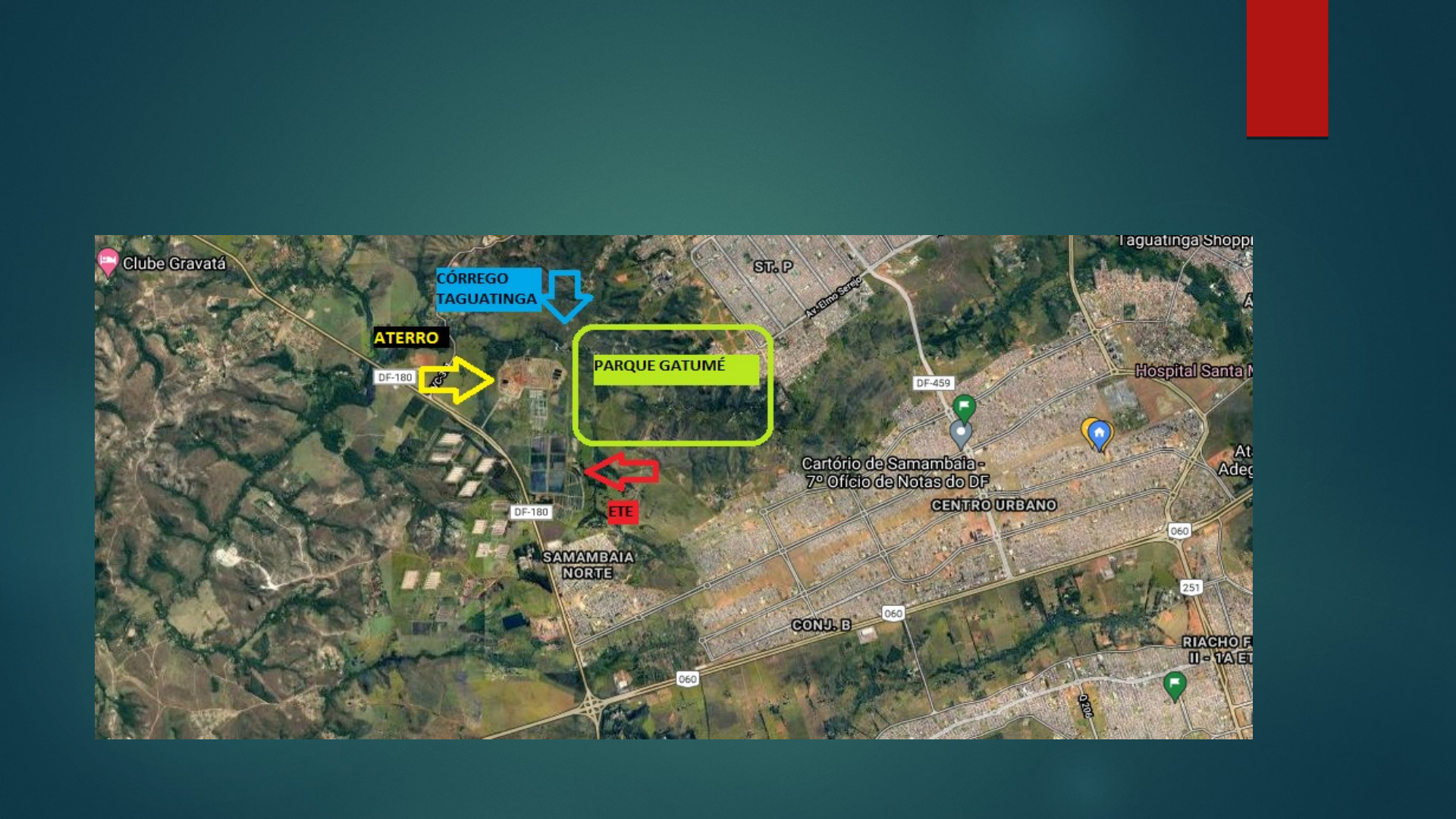 IMPACTOS AMBIENTAIS DO ATERRO SANITÁRIO E DA ETE EM SAMAMBAIA Cidade Satélite de Samambaia Samambaia é uma cidade satélite distante 25 quilômetros de Brasília e com aproximadamente 220.806 habitantes, situada a 25 quilômetros de Brasília, que estabelece fronteira com as cidades de Taguatinga, Ceilândia, Recanto das Emas e Riacho Fundo. O nome origina-se do córrego que a atravessa, o qual abriga em suas margens este tipo de vegetação. ATERRO SANITÁRIO ESTAÇÃO DE TRATAMENTO DE ESGOTO (ETE) ESTAÇÃO DE TRATAMENTO DE ESGOTO (ETE) Esta é uma Estação de Tratamento de Esgoto (ETE) da Companhia de Saneamento Ambiental do Distrito Federal (CAESB), construída para atender parte da cidade de Samambaia. CÓRREGO TAGUATINGA CÓRREGO TAGUATINGA O córrego Taguatinga percorre uma distância total de 12 km, e apenas alguns metros a jusante do ponto de chegada do córrego do Valo, recebe, pela margem oposta, o córrego Gatumé; a partir daí, o curso d'água principal passa a ser denominado rio Melchior. Vazamentos O chorume é estocado em "lagoas", que são reservatórios à céu aberto. Com as fortes chuvas, esse volume dos reservatórios pode aumentar e causar transbordamentos, e chegar até o rio. LAGOAS Entrada do aterro. Vazamento chorume ACESSOS Os acessos ao Aterro e a ETE são por dentro da cidade de Samambaia, pela DF 180 ou pela BR 060. Dentro da cidade o trânsito de caminhões pode prejudicar o asfalto e gerar bastante poeira que pode ser prejudicial à população. ACESSOS image6.PNG image7.PNG image8.PNG image9.PNG image10.png image11.png image12.jpeg image13.jpeg image14.png image2.png image3.png image4.png image5.png
