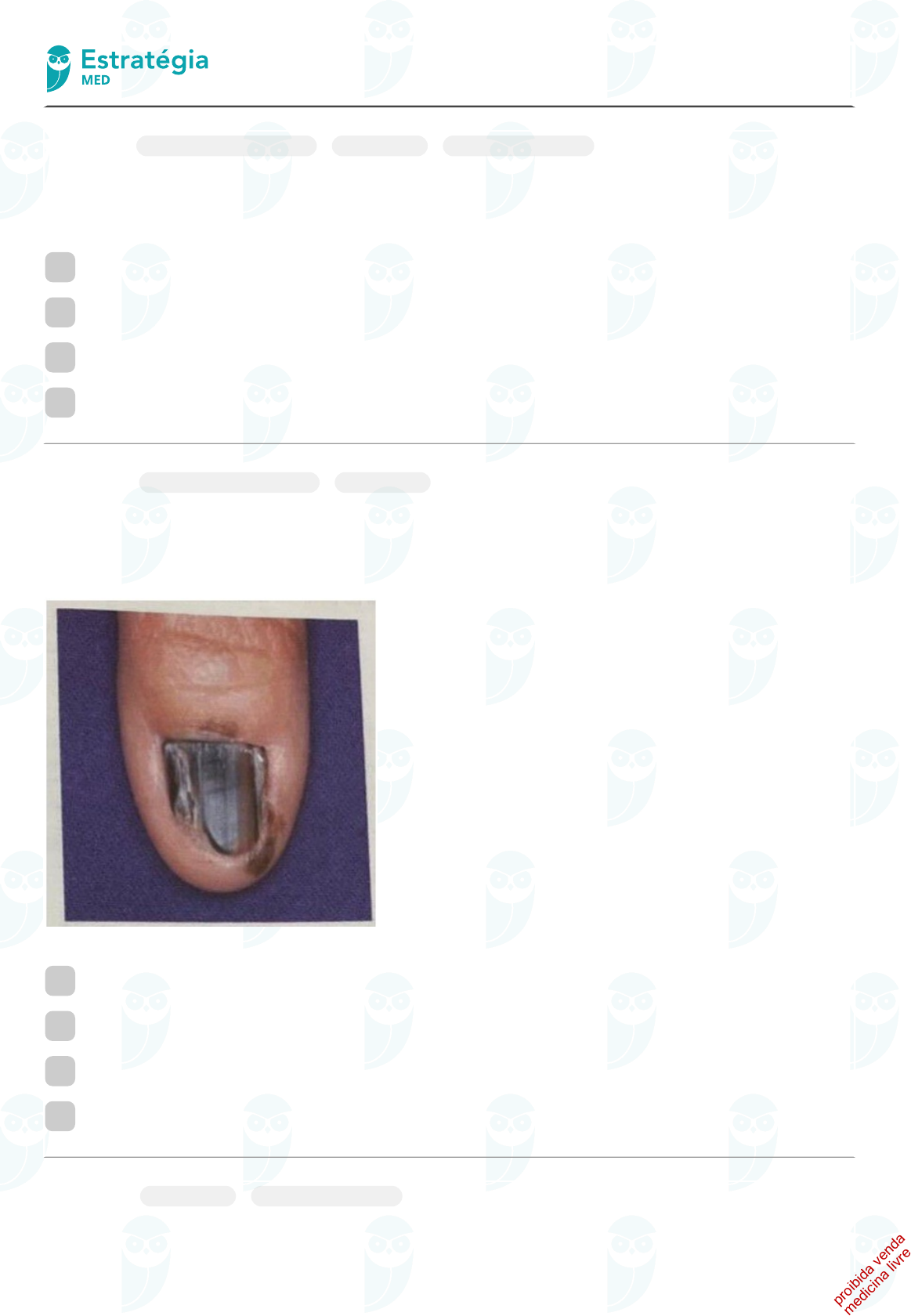 Câncer de pele At.me/medicinalivre cessar Lista Questão 1 Clínica e tipos histológicos Dermatologia Tratamento e conduta Mulher de 50 anos procura cirurgião plástico preocupada com lesão papular hipercrômica na face, com cerca de 2 mm de espessura, simétrica, bordos regulares, coloração homogênea, diâmetro de 5 mm e crescimento lento. Qual a melhor conduta? A Exérese com margem de 5 mm e pesquisa do linfonodo sentinela cervical. B Eletrocauterização. C Crioterapia. D Exérese com margem de 2 mm e exame anatomopatológico. Essa questão possui comentário do professor no site 4000182185 Questão 2 Clínica e tipos histológicos Dermatologia Mulher, 62 anos, parda, diabética e hipertensa controlada, portadora de lúpus sistêmico em uso de cloroquina e azatioprina há 8 anos. Refere trauma na unha do 1º quirodáctilo da mão esquerda há 1 ano. Desde então notou escurecimento da unha (Figura). Qual diagnóstico mais provável? A Melanoníquia traumática. B Melanoma ungueal. C Nevo melanocítico. D Melanoníquia medicamentosa. Essa questão possui comentário do professor no site 4000182154 Questão 3 Dermatologia Tratamento e conduta Uma mulher de 54 anos de idade é encaminhada pela dermatologista, após biópsia excisional de lesão cutânea enegrecida de cerca de 2,2 cm de extensão em face anterior do braço direito. A análise histológica revelou melanoma nodular de 2,8 med ici na liv re pro ibi da ve nd a https://med.estrategia.com/cadernos-e-simulados/cadernos/7791a25c-5d41-4558-ab81-68264cb7170c mm de profundidade, com ulceração. Após o estadiamento adequado, a melhor conduta, entre as seguintes, é: A Ampliação de margens em 2 cm, com pesquisa de linfonodo sentinela. B Ampliação de margens em 0,5 cm, com pesquisa de linfonodo sentinela. C Seguimento clínico, com nova avaliação em 4 meses. D Ampliação de margens em 2 cm. Essa questão possui comentário do professor no site 4000181706 Questão 4 Dermatologia Tratamento e conduta Um paciente de 27 anos possui uma lesão pigmentada e assimétrica, de aproximadamente 7mm, localizada em pele do dorso. Procurou um médico que indicou biópsia. Qual é o melhor tipo de biópsia a ser indicada para esse paciente? A Biópsia incisional. B Biópsia excisional. C Biópsia em shaving superficial. D Biópsia com agulha fina. E Biópsia com agulha grossa. Essa questão possui comentário do professor no site 4000181587 Questão 5 Diagnóstico estadiamento e f atores prognósticos Dermatologia Diante de uma lesão suspeita de melanoma cutâneo, a conduta inicial CORRETA é: A Realizar biópsia excisional com margens amplas. B Realizar biópsia incisional. C Realizar biópsia excisional com margens exíguas. D Realizar biópsia pela técnica de saucerização (shaving). Essa questão possui comentário do professor no site 4000169536 Questão 6 Diagnóstico estadiamento e f atores prognósticos Dermatologia Tratamento e conduta KS, sexo masculino, 45 anos, retorna ao serviço de cirurgia ambulatorial com o resultado do exame histopatológico de cirurgia realizada anteriormente. Segundo a descrição cirúrgica foi ressecado nevo pigmentado, irregular, assimétrico e multicolorido em face, com margem de 1cm. O exame anatomopatológico con rma melanoma com células neoplásicas, con nadas à epiderme e ao epitélio anexial com margens cirúrgicas livres. De acordo com as características da lesão e o exame histopatológico, assinale a alternativa que apresenta uma conduta ERRADA: med ici na liv re pro ibi da ve nd a A Deve-se ampliar as margens de segurança. B Independentemente do tratamento realizado, o paciente deve ser acompanhado regularmente. C Não há indicação para pesquisa de linfonodo sentinela. D Não há necessidade de nova intervenção cirúrgica, pelas características histopatológicas. Essa questão possui comentário do professor no site 4000168788 Questão 7 Diagnóstico estadiamento e f atores prognósticos Dermatologia Paciente masculino, de 56 anos, consultou por lesão de pele no dorso (imagem abaixo) que já vinha sendo observada há muitos anos, mas que, nos últimos meses, apresentou crescimento e mudança de cor. Negou prurido ou sangramento. Não tinha histórico pessoal ou familiar de melanoma. O maior diâmetro da lesão é de 8 mm. Diante desse quadro clínico, qual a conduta mais adequada? A Biópsia excisional da lesão com margem mínima de pele aparentemente normal ( 1-2 mm ). B Biópsia incisional com navete cirúrgica, incluindo borda aparentemente mais ativa. C Biópsias incisionais com punch em pelo menos 3 áreas mais suspeitas (borda e transição de cor). D Exérese da lesão com margem mínima de pele aparentemente normal (1-2 cm). Essa questão possui comentário do professor no site 4000168316 Questão 8 Diagnóstico estadiamento e f atores prognósticos O fator mais importante na avaliação histopatológica do melanoma é: A número de mitoses. B presença de regressão. C índice de Breslow. D localização da lesão. Essa questão possui comentário do professor no site 4000166865 Questão 9 Dermatologia Tratamento e conduta Mulher, 63 anos de idade, com antecedente de ressecção de melanoma no dorso, operado há 3 anos, com Breslow de 0,76mm. Em seguimento dermatológico de rotina, foi realizada dermatoscopia que evidenciou lesão no antebraço direito. Foi indicada a ressecção da lesão para diagnóstico. Qual é a alternativa que apresenta a linha de incisão na pele que deve ser realizada? med ici na liv re pro ibi da ve nd a A B C D Essa questão possui comentário do professor no site 4000165604 Questão 10 Tratamento Apresentação clínica Mulher de 62 anos, trabalhadora rural, procurou unidade básica de saúde queixando-se de lesão cutânea em nariz ( gura), com crescimento progressivo nos últimos 6 meses. med ici na liv re pro ibi da ve nd a Baseado na principal hipótese diagnóstica, qual o tratamento mais indicado? A Terapia fotodinâmica. B Cur