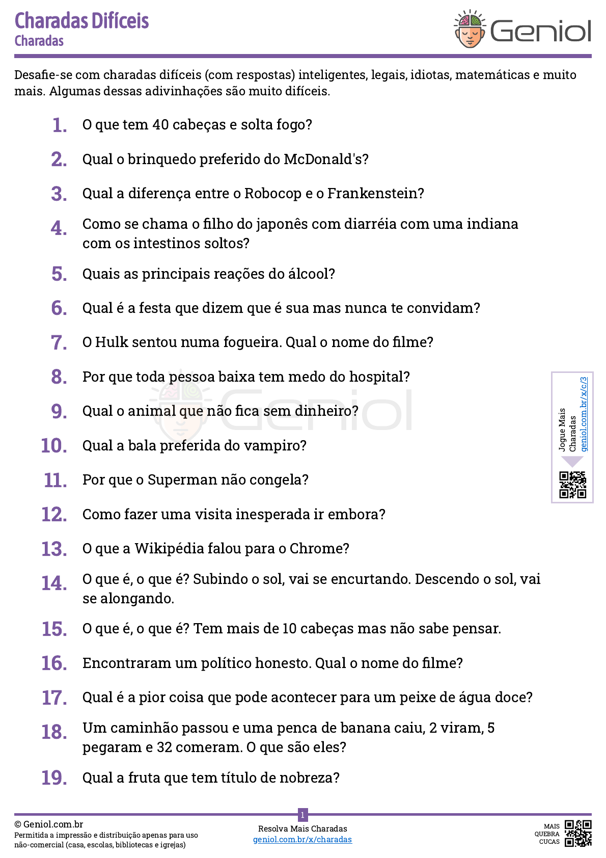 © Geniol.com.br Permitida a impressão e distribuição apenas para uso não-comercial (casa, escolas, bibliotecas e igrejas) MAIS QUEBRA CUCAS Charadas Difíceis Charadas J o g u e M a is C h a ra d a s g e n io l. c o m .b r/ x /c /3 Resolva Mais Charadas geniol.com.br/x/charadas 1 Desa�e-se com charadas difíceis (com respostas) inteligentes, legais, idiotas, matemáticas e muito mais. Algumas dessas adivinhações são muito difíceis. 1. O que tem 40 cabeças e solta fogo? 2. Qual o brinquedo preferido do McDonald's? 3. Qual a diferença entre o Robocop e o Frankenstein? 4. Como se chama o �lho do japonês com diarréia com uma indiana com os intestinos soltos? 5. Quais as principais reações do álcool? 6. Qual é a festa que dizem que é sua mas nunca te convidam? 7. O Hulk sentou numa fogueira. Qual o nome do �lme? 8. Por que toda pessoa baixa tem medo do hospital? 9. Qual o animal que não �ca sem dinheiro? 10. Qual a bala preferida do vampiro? 11. Por que o Superman não congela? 12. Como fazer uma visita inesperada ir embora? 13. O que a Wikipédia falou para o Chrome? 14. O que é, o que é? Subindo o sol, vai se encurtando. Descendo o sol, vai se alongando. 15. O que é, o que é? Tem mais de 10 cabeças mas não sabe pensar. 16. Encontraram um político honesto. Qual o nome do �lme? 17. Qual é a pior coisa que pode acontecer para um peixe de água doce? 18. Um caminhão passou e uma penca de banana caiu, 2 viram, 5 pegaram e 32 comeram. O que são eles? 19. Qual a fruta que tem título de nobreza? https://www.geniol.com.br/x/main/home/?src=GRTG3&evt=copyright-footer/click https://www.geniol.com.br/x/main/home/?src=GRTG3&evt=logo/click https://www.geniol.com.br/x/c/3/?src=GRTG3&evt=link-widget/click https://www.geniol.com.br/x/charadas/?src=GRTG3&evt=play-more/click © Geniol.com.br Permitida a impressão e distribuição apenas para uso não-comercial (casa, escolas, bibliotecas e igrejas) MAIS QUEBRA CUCAS Charadas Difíceis Charadas J o g u e M a is C h a ra d a s g e n io l. c o m .b r/ x /c /3 Resolva Mais Charadas geniol.com.br/x/charadas 2 20. Membros do exército foram para uma festa Junina, em qual cidade eles estão? 21. O que é que só tem seis letras mas leva 36 assentos? 22. O que é verde mas não é folha, é branco mas não é algodão, é vermelho mas não é sangue, é preto mas não é carvão? 23. Qual é a cor que não anda direito? 24. Qual a fruta que é parente da porta? 25. Qual videogame �ca dentro do banheiro? 26. Por que a loira não amamenta seu �lho? 27. Qual animal é o rei das charadas? 28. O que é uma velha sem relógio? 29. O que é um pontinho verde, amarela, vermelho e azul tudo misturado? 30. Qual o pote que toca música? 31. Tem a boca na barriga e os dentes na cabeça? 32. Como se faz água destilada no laboratório? 33. O que é, o que é? À direita sou um homem, facilmente acharás. Às avessas só à noite e nem sempre encontrarás. 34. Qual a cantora que está bem e sempre pergunta sobre você? 35. É nome de mulher e nome de homem. Ia mas acabou não indo. Quem é? 36. O que é um pontinho preto no fundo da geladeira? 37. Qual é a dispersão de London? 38. Um homem se casa com a mulher da sua vida, a sogra se muda para uma tribo africana e deixa toda a herança para ele. Qual é o nome do �lme? https://www.geniol.com.br/x/main/home/?src=GRTG3&evt=copyright-footer/click https://www.geniol.com.br/x/main/home/?src=GRTG3&evt=logo/click https://www.geniol.com.br/x/c/3/?src=GRTG3&evt=link-widget/click https://www.geniol.com.br/x/charadas/?src=GRTG3&evt=play-more/click © Geniol.com.br Permitida a impressão e distribuição apenas para uso não-comercial (casa, escolas, bibliotecas e igrejas) MAIS QUEBRA CUCAS Charadas Difíceis Charadas J o g u e M a is C h a ra d a s g e n io l. c o m .b r/ x /c /3 Resolva Mais Charadas geniol.com.br/x/charadas 3 39. Por que os portugueses treinam futebol numa piscina? 40. Por que a loira comprou mil torneiras? 41. Qual o instrumento musical que está sempre ligado? 42. O que é que você ri pra ganhar e sofre para perder? 43. O que é um pontinho vermelho na árvore? 44. Como é que a ostra cai do morro? 45. Você sabe como o português apanha frutas? 46. O que tem barriga de pau, espinhaço de ferro e se puxa dá um berro? 47. Quem é o dono da horta? 48. Por que os �lhos do Bin Laden são felizes? 49. Qual é o nome da peça de roupa que os anões mais usam? 50. O que o "c" disse para o "ç"? 51. Qual animal mais escorregadio? 52. Como os portugueses descobriram o pau-brasil? 53. O que uma nuvem disse pra outra? 54. Marina fugiu do hospital, mas foi atropelada por um trenó puxado por 20 mil éguas. Qual o nome do �lme? 55. Qual a música preferida do Sérgio Reis? 56. O que o Antônio e o anônimo são um do outro? 57. O que o verão disse pro outro? 58. Qual a semelhança entre o Goku e um gripado? 59. Um homem iria comprar uma bola. Havia uma azul e uma vermelha. Ele comprou a vermelha. Qual o nome do �lme? https://www.geniol.com.br/x/main/home/?src=GRTG3&evt=copyright-footer/click https://www.geniol.com.br/x/main/home/?src=GRTG3&evt=logo/click https://www.geniol.com.br/x/c/3/?src=GRTG3&evt=link-widget/click https://www.geniol.com.br/x/charadas/?src=GRTG3&evt=play-more/click © Geniol.com.br Permitida a impressão e distribuição apenas para uso não-comercial (casa, escolas, bibliotecas e igrejas) MAIS QUEBRA CUCAS Charadas Difíceis Charadas J o g u e M a is C h a ra d a s g e n io l. c o m .b r/ x /c /3 Resolva Mais Charadas geniol.com.br/x/charadas 4 60. Como um português desinfeta a água? 61. Onde a mulher tem o cabelo mais crespo? 62. O que você faz quando uma loira te joga uma granada? 63. O que é, o que é? É bonitinho, risca o vidro e chora. 64. Amigo silencioso, alma aberta a toda a gente. O que diz nunca desmente. 65. Qual a miss que foi escolhida por engano? 66. Qual o país onde todos tem a bunda branca? 67. Qual é o grão que é crente? 68. Quando