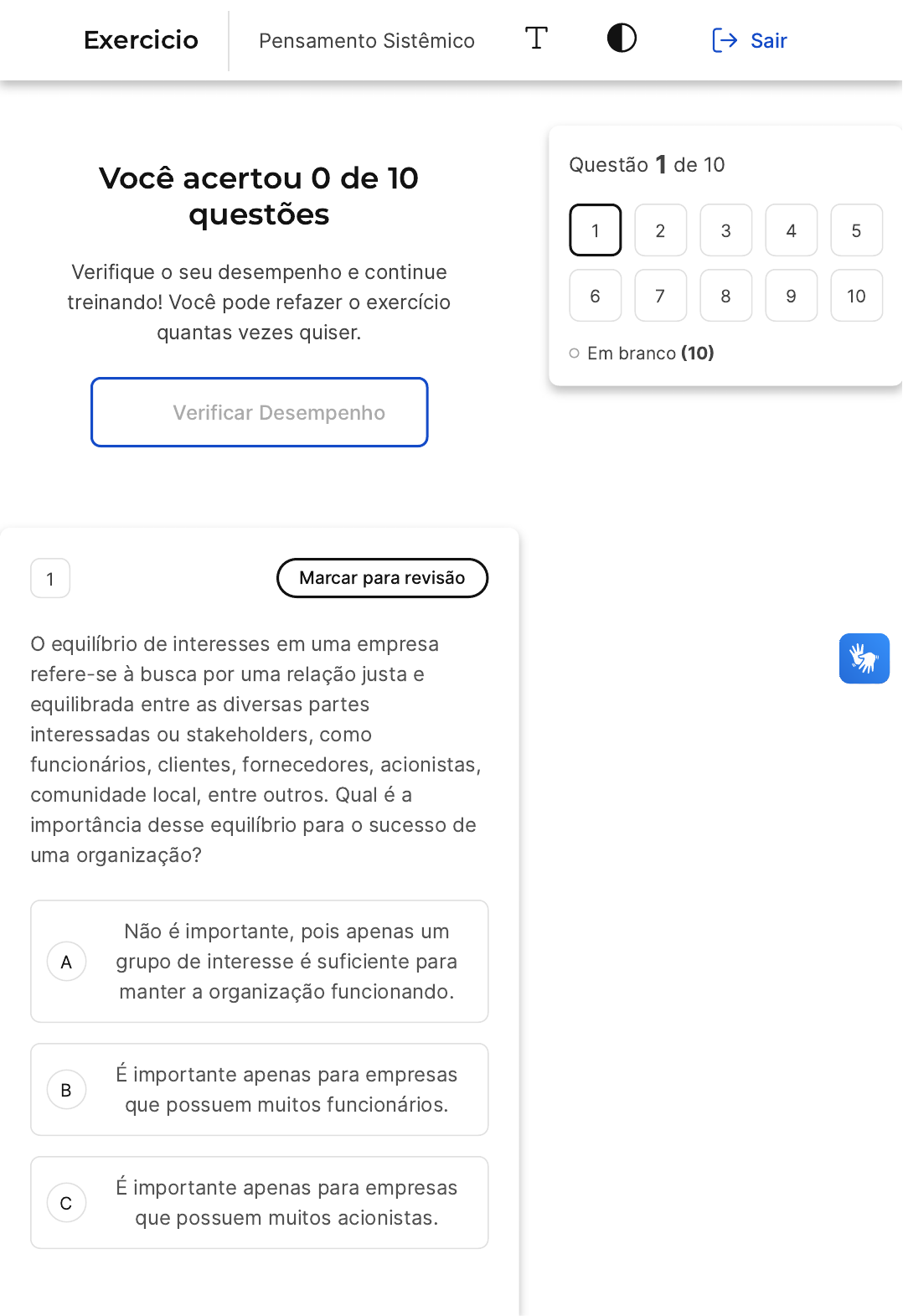 Você acertou 0 de 10 questões Verifique o seu desempenho e continue treinando! Você pode refazer o exercício quantas vezes quiser. Verificar Desempenho A B C 1 Marcar para revisão O equilíbrio de interesses em uma empresa refere-se à busca por uma relação justa e equilibrada entre as diversas partes interessadas ou stakeholders, como funcionários, clientes, fornecedores, acionistas, comunidade local, entre outros. Qual é a importância desse equilíbrio para o sucesso de uma organização? Não é importante, pois apenas um grupo de interesse é suficiente para manter a organização funcionando. É importante apenas para empresas que possuem muitos funcionários. É importante apenas para empresas que possuem muitos acionistas. Questão 1 de 10 Em branco �10� 1 2 3 4 5 6 7 8 9 10 Exercicio Pensamento Sistêmico Sair D E É importante para garantir conexões positivas entre stakeholders e melhores resultados. É importante apenas para empresas que atuam em mercados muito competitivos. Questão não respondida Opa! A alternativa correta é a letra D. Confira o gabarito comentado! Gabarito Comentado Um dos fatores de sucesso de uma organização está no alcance do equilíbrio de interesses entre seus públicos. A balança não deve pender somente para um dos lados, caso contrário, sempre haverá na relação alguém com a impressão de que está sendo prejudicado e, como consequência, pensando em formas de não mais se relacionar com aquele que está tendo vantagem. Empregados insatisfeitos com seus empregadores tendem a produzir menos, clientes que não têm suas necessidades atendidas não voltam a fazer negócio com as empresas, acionistas insatisfeitos com os dividendos recebidos retiram seu capital daquele empreendimento. Maximizar os ganhos para todos os grupos de interesse pode ser a forma ideal de conquistar a conexão positiva entre os stakeholders e a chave do sucesso para garantia de melhores resultados. A B C D E 2 Marcar para revisão Por muito tempo o conceito de produção em massa foi amplamente utilizado pelas organizações e sua influência se estendeu para além das fronteiras geográficas e ideológicas. Quais foram as condições socioeconômicas que favoreceram a disseminação desse conceito? Descentralização dos mercados, crescimento econômico lento e força de trabalho altamente qualificada. Concentração dos mercados, crescimento econômico acelerado e força de trabalho desqualificada. Concentração dos mercados, crescimento econômico lento e força de trabalho altamente qualificada. Centralização dos mercados, crescimento econômico lento e força de trabalho desqualificada. Centralização dos mercados, crescimento econômico acelerado e força de trabalho altamente qualificada. Questão não respondida Opa! A alternativa correta é a letra B. Confira o gabarito comentado! Gabarito Comentado A B O conceito de produção em massa foi usado por organizações durante décadas e sua influência ultrapassou fronteiras geográficas e ideológicas. A forte concentração dos mercados, o crescimento econômico acelerado, a força de trabalho desqualificada, o desperdício e a falta de eficiência foram condições socioeconômicas da época que favoreceram a multiplicação do modelo por outras empresas. 3 Marcar para revisão O Banco LUCROS S/A. adquiriu, há um mês, uma empresa de software, que possuía 15% do mercado de programas de segurança bancária. Após uma análise organizacional, percebeu-se que a expansão desejada não ocorria em razão da falta de agressividade da empresa e de sua estrutura verticalizada e inflexível. O Banco decidiu, então, implementar uma transformação interna para tornar-se uma organização com forte capacidade de adaptação às novas tendências de mercado. Assim, será necessário que a empresa: I� seja voltada para o cliente; II� valorize a criatividade e a inovação; III� se baseie em metas que possam atender seus diversos grupos de interesse, entre eles, clientes, empregados e acionistas. Está(ão) correto(s): apenas o item I. apenas o item II. C D E apenas os itens I e II. apenas os itens II e III. os itens I, II e III. Questão não respondida Opa! A alternativa correta é a letra E. Confira o gabarito comentado! Gabarito Comentado As três afirmativas estão corretas. Empresas com forte capacidade de adaptação devem ser voltadas para o cliente, valorizar a criatividade e a inovação e se basear em metas que atendam aos stakeholders. De fato, uma cultura voltada para o cliente permite melhor percepção das tendências do mercado. Enquanto isso, metas que atendem aos stakeholders são uma forma de manter os envolvidos motivados e com sua melhor produtividade. Além disso, é essencial uma cultura que valorize a criatividade e a inovação para uma empresa que pretende se adaptar às tendências do mercado. 4 Marcar para revisão O termo VUCA tem sido utilizado para descrever o mundo atual e seus desafios. Esse acrônimo é uma forma de representar as mudanças rápidas e constantes que ocorrem na A B C D E sociedade, na economia e na política. O que significa o termo VUCA? Voluntariedade, unificação, coerência, adaptabilidade. Voluntariedade, unicidade, clareza, ação. Volatilidade, unicidade, coerência, ação. Volatilidade, incerteza, complexidade, ambiguidade. Volatilidade, incerteza, clareza, adaptabilidade. Questão não respondida Opa! A alternativa correta é a letra D. Confira o gabarito comentado! Gabarito Comentado VUCA, significa: V � Volatilidade U � Incerteza C � Complexidade A � Ambiguidade 5 Marcar para revisão Um dos desafios do gestor contemporâneo é ter capacidade para gerir organizações em A B C D E ambientes mutáveis e turbulentos. As pressões do ambiente externo causam impacto no gerenciamento das empresas e as principais mudanças necessárias envolvem: I� a criação de estruturas e formas de organização do trabalho adaptáveis às con