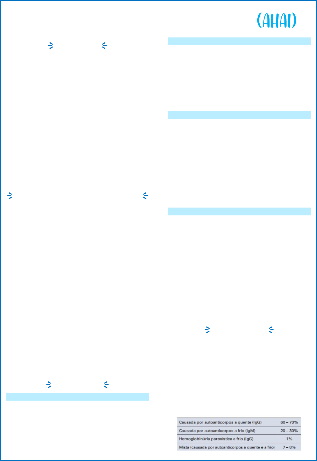 Anemia Hemolítica Autoimune Introdução → As hemácias vivem em média 120 dias. → Nesse período percorre 200 km e enfrenta a turbulência da bomba cardíaca mais de 500 mil vezes. → As hemácias são células metabolicamente ativas e necessita de suprimento adequado de glicose para produção de energia. → Com o envelhecimento, a maioria das vias glicolíticas torna-se menos efetiva → diminuição intracelular do ATP e perde água → menor capacidade de se deformar, principalmente na microcirculação → Ocorre destruição das hemácias pelos macrófagos do sistema fagocítico mononuclear → baço → hemoglobina também é destruída e ferro é reaproveitado Anemia hemolítica autoimune: → É caracterizada pela destruição precoce das hemácias devido à fixação de imunoglobulinas (IgG, IgM ou IgA) ou complemento na superfície da membrana das hemácias. → Diminuição da meia-vida da hemácia e a medula óssea não consegue compensar essa destruição aumentada → É a 2ª citopenia mais comum, perdendo apenas para PTI (purpura trombocitopênica idiopática → produção de anticorpos contra a plaqueta) → Os sintomas iniciais são decorrentes da anemia causada pela hemólise, dos efeitos secundários do quadro hemolítico, ou da doença primária que está causando a AHAI, tais como as doenças linfoproliferativas. → Pode se apresentar assintomático ao diagnóstico (depende do grau da hemólise), sendo identificada apenas em exames laboratoriais rotineiros Diagnóstico História clínica: 1. Sintomas associados a anemia; 2. Associações com exposição ao frio; 3. Ingestão de drogas; 4. Doenças infecciosas; 5. Doenças autoimunes; 6. Doenças linfoproliferativas Manifestações clínicas determinadas por: • Taxa de hemólise (gravidade dos sintomas) • Habilidade do organismo processar os subprodutos da hemólise; • Medula óssea em responder com aumento de reticulócitos; • Capacidade aumentada de carrear oxigênio por mecanismos compensatórios (bomba cardíaca) Exame físico: • Icterícia • Febre • Esplenomegalia • Hepatomegalia • Acrocianose (cianose simétrica, indolor, persistente, causada por vasoespasmo de pequenos vasos) • Letargia • Obnubilação • Edema pulmonar • Insuficiência renal Achados de laboratório clínico: • Avaliação de lâmina de sangue periférico (esferócitos, esquisócitos, policromatofilia, eritroblastos) → grau de hemólise • Aumento dos reticulócitos (compensação da destruição) • Aumento dos níveis desidrogenase láctea • Aumento dos níveis de Bilirrubina indireta (saber se a icterícia é colestática ou não) • Diminuição dos níveis de haptoglobina’’ • Diminuição dos níveis de hemoglobina livre no plasma. • Hemoglobinúria. • Hemossidenúria. Classificação 1. AHAI anticorpo quente • Causadas por autoanticorpos quentes IgG - 60 a 70% 2. AHAI anticorpo frio • Causadas por autoanticorppos frios IgM - 20 a 30% 3. AHAI induzida por droga 4. Anemia hemolíticcca aloimune → Doença hemolítica perinatal. → Reação transfusional hemolítica → Importante diferenciar se primária ou secundária (tratar a causa também) → Sendo a clínica mais importantes que os exames laboratoriais, nessa diferenciação → Causada por anticorpos eritrocitários IgG que, em 98% dos casos, são da subclasse IgG1, de natureza policlonal, reagem contra antígenos do sistema Rh, e algumas vezes simulam o comportamento de aloanticorpos. → Embora frações do sistema complemento sejam frequentemente detectadas na superfície das hemácias, a hemólise mediada por complemento é incomum. → Etiologia do autoanticorpo: desconhecida → Coombs direto: anticorpos no sangue total → Coombs indireto: pega apenas o plasma para ver se tem anticorpo → como é um anticorpo contra hemácia nem sempre ele está presente no plasma (deve ter uma quantidade muito grande) Importante na anemia hemolítica perinatal, quando a mãe é RH negativo e o feto é RH positivo → O teste de aglutinina (coombs direto) vai ser positivo, e o indireto pode dar positivo (depende da quantidade de anticorpo) Teste de Coombs Direto ou Teste de Antiglobulina direta: • Não é específico para auto-anticorpos → não determina se é primária ou secundária • Causas primárias de CD positivo: Reações transfusionais hemolíticas agudas ou tardias. Transplantes Administração de várias terapêuticas, incluindo: Imunoglobulina intravenosa, Imunoglobulina Rh, globulina antilinfocíica, globulina antitimocítica. • Causas secundárias de CD positivo: Doença falciforme. Talassemia. Doença renal. Mieloma múltiplo. Doenças auto-imunes AIDS Doença com elevada globulina sérica Fisiopatologia e Quadro Clínico • Hemácia de vida normal: vive 120 dias → vai perdendo água e capacidade de produzir ATP → envelhece → enrijece → fagocitada pelo baço • Anemia hemolítica autoimune: hemácia com um sinal para se ligar ao anticorpo da classe IgG → se deforma → sofre hemólise parcial da sua membrana → formar um esferócito → hemolisado no baço → Em geral, a destruição eritrocitária é mediada por células do Sistema Macrófagos- Monócitos, particularmente pelos esplênicos que possuem receptores para o receptor Fc (FcγRII) das imunoglobulinas → A maioria das hemácias sensibilizadas sofre fagocitose parcial e volta à circulação após perder a forma discoide e tornar-se esferócito (pois no processo de fagocitose parcial perde mais superfície do que volume) → A destruição extravascular das hemácias favorece o desenvolvimento de palidez, icterícia, esplenomegalia e hepatomegalia. → Cerca de 80% dos pacientes com AHAI primária apresentam esplenomegalia, enquanto que a detecção de hepatomegalia isolada ou linfoadenomegalia sugere a possibilidade de doença linfoproliferativa Diagnostico • Diminuição do nível de hemoglobina Análise morfológica do sangue per