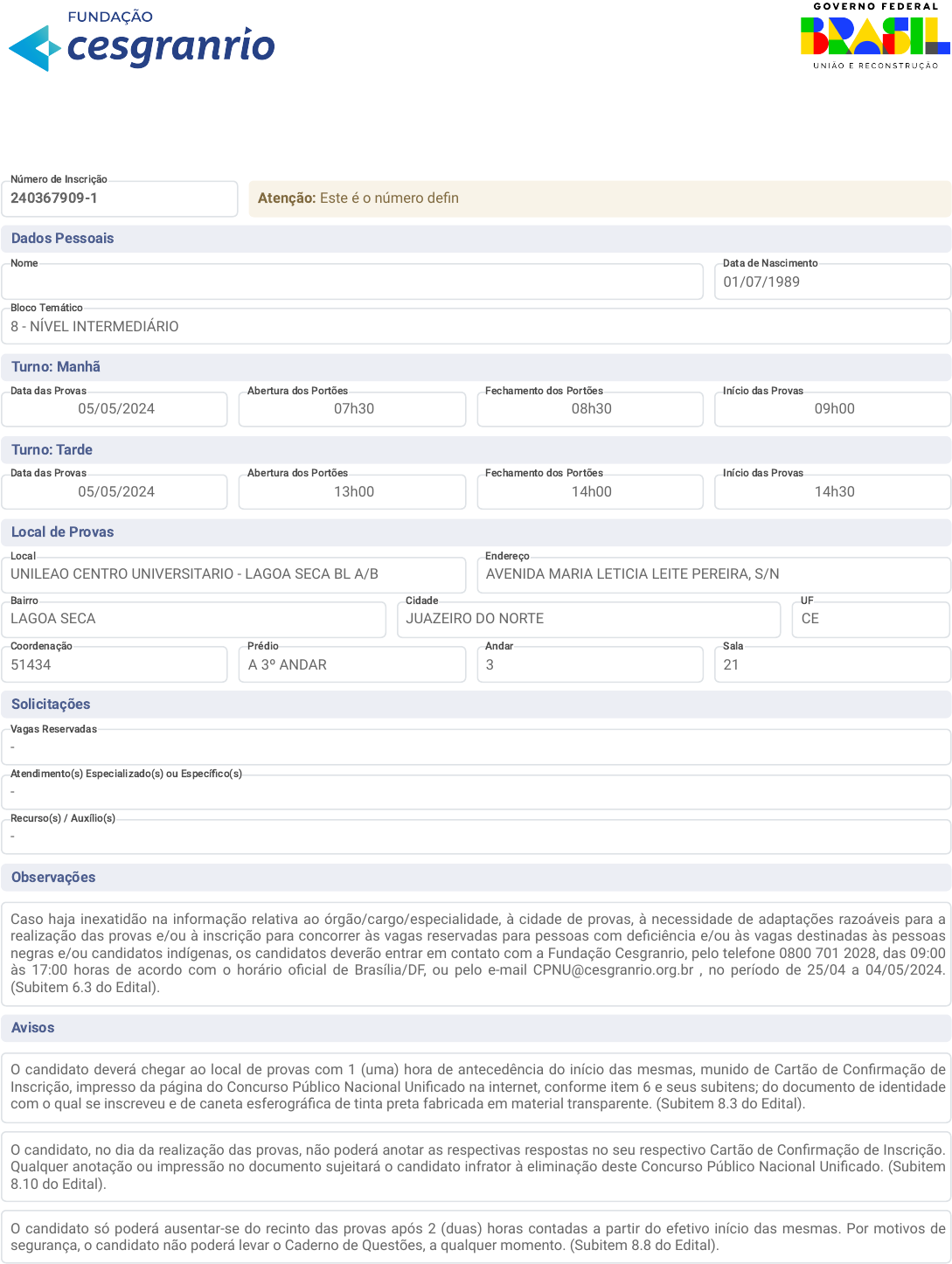 Cartão de Confirmação de Inscrição - Local de Provas Concurso Público Nacional Unificado (CPNU) - 2024 240367909-1 Atenção: Este é o número definitivo de sua inscrição no CPNU. Dados Pessoais JOSE JUNIOR DA SILVA 01/07/1989 8 - NÍVEL INTERMEDIÁRIO Turno: Manhã 05/05/2024 07h30 08h30 09h00 Turno: Tarde 05/05/2024 13h00 14h00 14h30 Local de Provas UNILEAO CENTRO UNIVERSITARIO - LAGOA SECA BL A/B AVENIDA MARIA LETICIA LEITE PEREIRA, S/N LAGOA SECA JUAZEIRO DO NORTE CE 51434 A 3º ANDAR 3 21 Solicitações - - - Observações Caso haja inexatidão na informação relativa ao órgão/cargo/especialidade, à cidade de provas, à necessidade de adaptações razoáveis para a realização das provas e/ou à inscrição para concorrer às vagas reservadas para pessoas com deficiência e/ou às vagas destinadas às pessoas negras e/ou candidatos indígenas, os candidatos deverão entrar em contato com a Fundação Cesgranrio, pelo telefone 0800 701 2028, das 09:00 às 17:00 horas de acordo com o horário oficial de Brasília/DF, ou pelo e-mail CPNU@cesgranrio.org.br , no período de 25/04 a 04/05/2024. (Subitem 6.3 do Edital). Avisos O candidato deverá chegar ao local de provas com 1 (uma) hora de antecedência do início das mesmas, munido de Cartão de Confirmação de Inscrição, impresso da página do Concurso Público Nacional Unificado na internet, conforme item 6 e seus subitens; do documento de identidade com o qual se inscreveu e de caneta esferográfica de tinta preta fabricada em material transparente. (Subitem 8.3 do Edital). O candidato, no dia da realização das provas, não poderá anotar as respectivas respostas no seu respectivo Cartão de Confirmação de Inscrição. Qualquer anotação ou impressão no documento sujeitará o candidato infrator à eliminação deste Concurso Público Nacional Unificado. (Subitem 8.10 do Edital). O candidato só poderá ausentar-se do recinto das provas após 2 (duas) horas contadas a partir do efetivo início das mesmas. Por motivos de segurança, o candidato não poderá levar o Caderno de Questões, a qualquer momento. (Subitem 8.8 do Edital). Número de Inscrição Nome Data de Nascimento Bloco Temático Data das Provas Abertura dos Portões Fechamento dos Portões Início das Provas Data das Provas Abertura dos Portões Fechamento dos Portões Início das Provas Local Endereço Bairro Cidade UF Coordenação Prédio Andar Sala Vagas Reservadas Atendimento(s) Especializado(s) ou Específico(s) Recurso(s) / Auxílio(s) Assinatura Eletrônica 6DF4-A292-8C5B-6E21-E83A-2802-AB62-D4DF-A3DA-957B-3580-1B71-5E8D-C4B8-B6ED-7150 Declaração de Comparecimento Concurso Público Nacional Unificado (CPNU) - 2024 Declaro que o(a) candidato(a) JOSE JUNIOR DA SILVA, inscrito(a) sob o número 240367909-1 no Concurso Público Nacional Unificado - 2024, realizado pela Fundação CESGRANRIO, compareceu à prova realizada no local de prova UNILEAO CENTRO UNIVERSITARIO - LAGOA SECA BL A/B, AVENIDA MARIA LETICIA LEITE PEREIRA, S/N, LAGOA SECA, JUAZEIRO DO NORTE - CE no dia _________________________ no turno da _________________________ Horário da saída do candidato(a): __________ : __________ (Horário Oficial de Brasília/DF) JUAZEIRO DO NORTE, ___________________________________ ____________________________________________________________ Assinatura do Fiscal de Sala