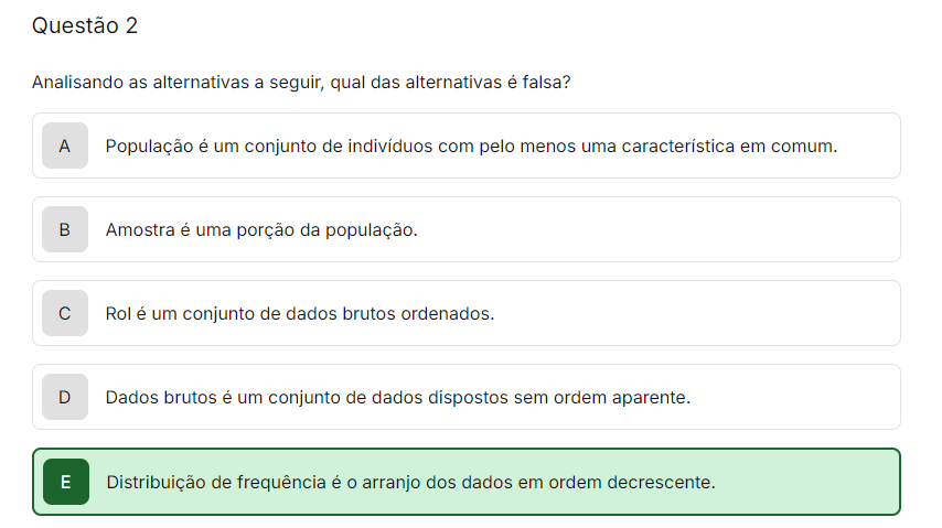 Questão 2 Analisando as alternativas a seguir, qual das alternativas é falsa? A População é um conjunto de indivíduos com pelo menos uma característica em comum. B Amostra é uma porção da população. C Rol é um conjunto de dados brutos ordenados. D Dados brutos é um conjunto de dados dispostos sem ordem aparente. E Distribuição de frequência é arranjo dos dados em ordem decrescente.
