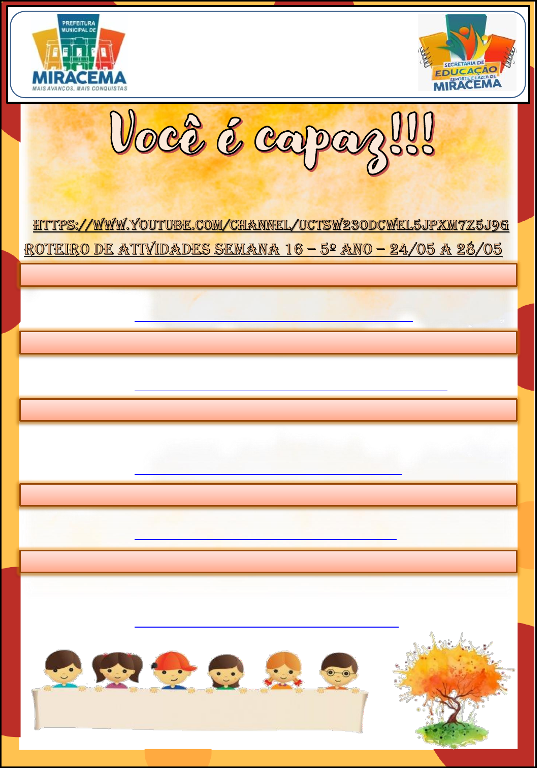 • Fazer a atividade 1 disponível na plataforma (Pronomes possessivos); • Assistir ao vídeo https://www.youtube.com/watch?v=vcOy8DZOSmY • Fazer a atividade 2 disponível na plataforma (Gráficos e tabelas); • Assistir ao vídeo https://www.youtube.com/watch?v=Kwt92IO6DPs&t=126s • Fazer a atividade 3 disponível na plataforma (Polígonos - triângulos); • Fazer a atividade 4 disponível na plataforma (Os primeiros núcleos); • Assistir ao vídeo https://www.youtube.com/watch?v=lP5FBxwEzmI • Fazer a atividade 5 disponível na plataforma (Divisão); • Assistir ao vídeo https://www.youtube.com/watch?v=QCLjnLkIk50 • Fazer a atividade 6 disponível na plataforma (Palavras com z e s com som de z); • Fazer a atividade 7 disponível na plataforma (Água: um recurso precioso); • Assistir ao vídeo https://www.youtube.com/watch?v=IKJ9_K8xFds 25/05/2021 - TERÇA-FEIRA 26/05/2021 - QUARTA-FEIRA PREFEITURA MUNICIPAL DE MIRACEMA SECRETARIA MUNICIPAL DE EDUCAÇÃO ENSINO MUNICIPAL - 2021 27/05/2021 - QUINTA-FEIRA 28/05/2021 - SEXTA-FEIRA 24/05/2021 - SEGUNDA-FEIRA Aula ao vivo, todos os dias, das 13:00 às 14:00 Nome do canal: Educação de Miracema – 5º Ano – Ensino Remoto ou acesse Tudo o que um sonho precisa para ser realizado é alguém que acredite que ele possa ser realizado. Roberto Shinyashiki https://www.youtube.com/watch?v=vcOy8DZOSmY https://www.youtube.com/watch?v=Kwt92IO6DPs&t=126s https://www.youtube.com/watch?v=lP5FBxwEzmI https://www.youtube.com/watch?v=QCLjnLkIk50 https://www.youtube.com/watch?v=IKJ9_K8xFds https://www.youtube.com/channel/UCtsw23odcwEL5JPxM7z5J9g https://www.pensador.com/autor/roberto_shinyashiki/ =============================== ATIVIDADE 1 =============================== Os Pronomes Possessivos dão ideia de posse e concordam com os substantivos que acompanham, em gênero (masculino ou feminino) e número (singular ou plural). Veja: Meu livro. Sua mochila. Nossos amigos. Tuas manias. Indicam o que pertence à Pronomes Possessivos 1ª Pessoa do Singular - Eu meu (s), minha (s) 2ª Pessoa do Singular - Tu teu (s), tua (s) 3ª Pessoa do Singular – Ele/Ela seu (s), sua (s), dele (s), dela (s) 1ª Pessoa do Plural - Nós nosso (s), nossa (s) 2ª Pessoa do Plural - Vós vosso (s), vossa (s) 3ª Pessoa do Plural – Eles/Elas seu (s), sua (s), dele (s), dela (s) 1) Circule os Pronomes Possessivos e Sublinhe os Substantivos a que se referem: a) “Venha a nós o vosso reino...” b) Nossa escola é a melhor da cidade. c) Sua irmã veio procurar você. d) Aquele caderno não é meu. e) Cobre o teu nariz, coloca corretamente a tua máscara! f) Seus pais não compareceram à reunião. g) Minha bolsa está muito pesada. h) Aqueles óculos são teus? i) Arthur dividiu o lanche dele com Joaquim. j) Marina não ficou satisfeita com a nota dela. PREFEITURA MUNICIPAL DE MIRACEMA SECRETARIA MUNICIPAL DE EDUCAÇÃO ENSINO MUNICIPAL - 2021 Aluno (a):_________________________________________________________________________ Escola: __________________________________________________________________________ Data: ____/____/_____ 5º ano Professor (a): ________________________________ Português - Pronomes Possessivos ATIVIDADES 3) Reescreva substituindo os termos grifados por: dele, deles, dela ou delas. a) Não quero mais a opinião da Carolina. R:________________________________________ b) Papai comprou o carro do André. R:________________________________________ c) Ronaldo vai pintar a casa de Lúcia e Ana. R:________________________________________ d) Nós iremos ao casamento de Diego e Carla. R:________________________________________ 4) Empregue corretamente os Pronomes Demonstrativos: esse, este, aquele. a) _____________ senhor que vem lá se parece com o seu pai. (longe dos dois) b) Ei, _____________ lápis aí na sua mão é meu. Onde ele estava? (longe de quem fala e perto de quem ouve) c) Não é não! ___________ lápis aqui, minha mãe comprou para mim. (perto de quem fala) 5) Troque os nomes destacados pelos Pronomes de Tratamento adequados: a) O Papa fará uma Oração pelo fim da Pandemia. R: _______________________________________________________ b) A rainha está muito triste desde que o príncipe viajou. R:_______________________________________________________ c) Senhor juiz, meu cliente é inocente! R:_______________________________________________________ d) A moça pode aguardar aqui, o médico já vai atendê-la. R:_______________________________________________________ e) A cidade se enfeitou para receber o governador. R:_______________________________________________________ f) Meninos e meninas podem merendar agora. R:_______________________________________________________ 2) Relacione: (1) Pronomes Pessoais do Caso Reto ( ) Vossa alteza, Senhor, Você, Meritíssimo (2) Pronomes Pessoais do Caso Oblíquo ( ) nossa, tua, deles, meu, dela, vossas (3) Pronomes Pessoais de Tratamento ( ) mim, nos, se, lhe, consigo, vos (4) Pronomes Demonstrativos ( ) nós, tu, ela, eu, vós, eles (5) Pronomes Possessivos ( ) aquilo, isso, este, essas, aqueles 7) Eu e MIM, atenção para não confundir! Complete corretamente: a) Roberta olhou para __________ com olhos amorosos. b) Traga seu caderno para ___________ dar o visto. c) Entre _________ e você não existe mais nenhum segredo. d) Tenho que estudar bastante para _________ recuperar a nota. e) Está tudo acertado entre você e ________. f) Para __________, a roupa que ele está usando é fora de moda. 8) Complete usando Pronomes Pessoais do Caso Reto que combinem com as frases: a) Rafaela é minha prima, _________ é muito educada. b) O doce já acabou, _________ estava delicioso! c) ________ precisamos usar a máscara, _______ nos protege do vírus. d) Igor e Mateus são gêmeos, mas ________ não são iguais. e) ______ comprei um caderno novo. f) Laura e Kátia são vizinhas, ________sempre vão juntas para a escola. g) Marcela e Cauã formam um belo par, ______ vão se casar. h) “_______ te 