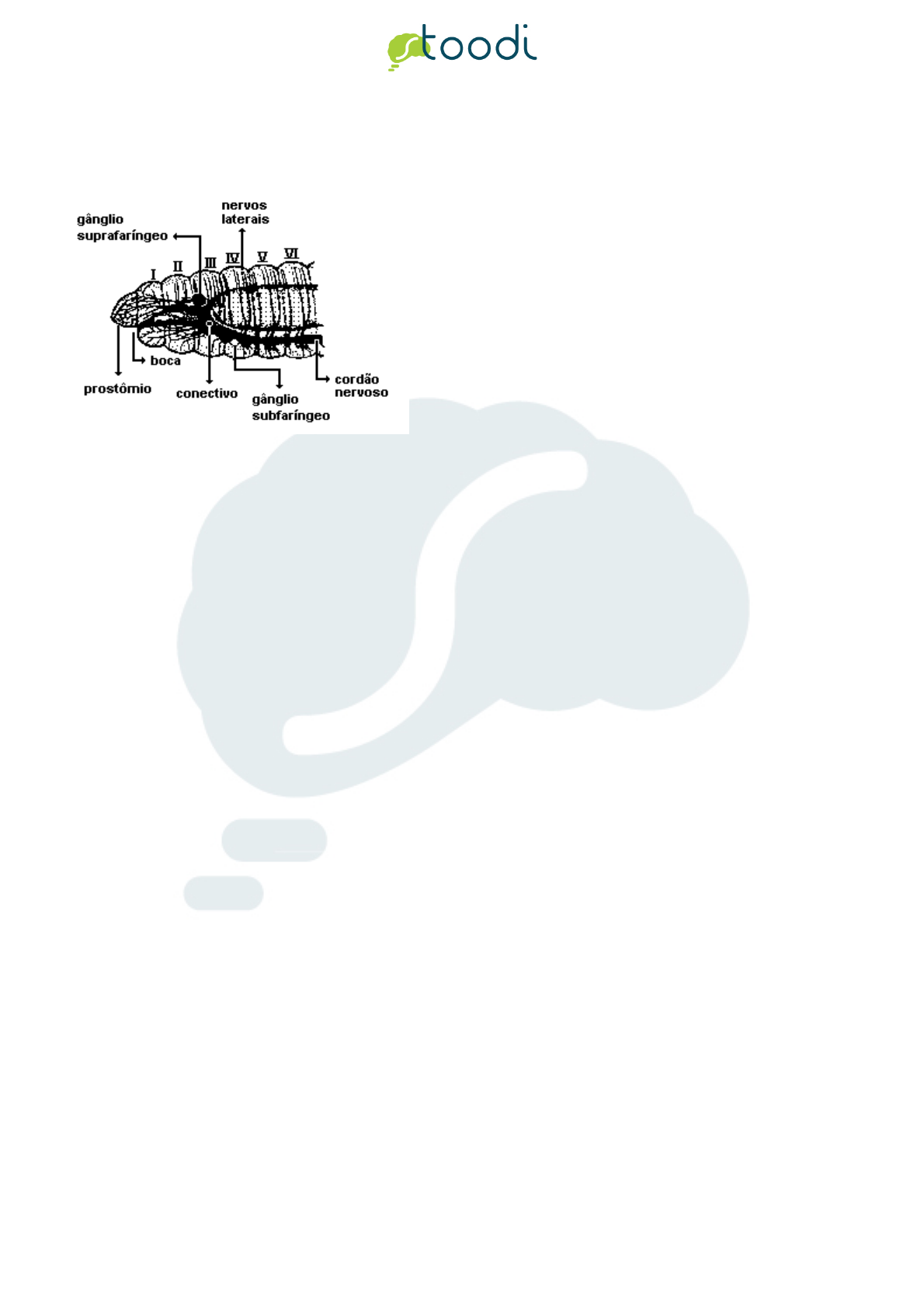 Página 1 Copyright (c) 2013 - 2018 Stoodi Ensino e Treinamento a Distância LTDA - EPP - Todos os direitos reservados 1. UERJ 1997 O esquema a seguir exemplifica o tipo de sistema nervoso constituído de cérebro composto de gânglios na extremidade anterior, cordão nervoso ventral duplo de gânglios e nervos segmentares. Este tipo de sistema nervoso é encontrado em: a. anelídeos b. turbelários c. vertebrados d. equinodermos 2. UDESC 1997 Assinale a alternativa que apresenta o nome de um ser vivo monoico, com fecundação cruzada dupla. a. sapo b. cobra c. tênia d. minhoca e. gafanhoto 3. MACKENZIE 1994 A ocorrência de sistema circulatório fechado, sangue com hemoglobina, três folhetos embrionários formando um celoma verdadeiro e corpo metamerizado são características que aparecem em conjunto pela primeira vez em: a. moluscos b. anelídeos c. insetos d. platelmintos e. vertebrados 4. UEL 1996 Página 2 Copyright (c) 2013 - 2018 Stoodi Ensino e Treinamento a Distância LTDA - EPP - Todos os direitos reservados O esquema a seguir mostra parte de um animal. Uma tal organização dos nefrídios, do sistema nervoso e do celoma encontra-se em a. minhocas. b. caramujos. c. gafanhotos. d. planárias. e. ouriços-do-mar. 5. UFLAVRAS 2000 Indique a qual filo pertencem as características listadas: Metameria, cerdas quitinosas, parapódios, tiflossole, larva trocófora, nefrídios. a. Chordata. b. Echinodermata. c. Nematoda. d. Mollusca. e. Annelida. 6. PUCPR 2005 Dos animais a seguir, o oxigênio e o dióxido de carbono são transportados pelo sistema circulatório SOMENTE em: a. planárias. b. gafanhotos. c. besouros. d. borboletas. e. minhocas. 7. FAAP 1996 Página 3 Copyright (c) 2013 - 2018 Stoodi Ensino e Treinamento a Distância LTDA - EPP - Todos os direitos reservados Num passado, não muito distante, um tipo de animal era vendido em barbearias e em boticários para se fazer sangria. Acreditava-se que a sangria feita por esses animais podia curar uma grande série de males que afligissem uma pessoa. Que animal era utilizado e a qual o filo pertence? a. lesma, do filo Molusca b. minhoca, do filo Annelida c. lesma, do filo Artrópoda d. sanguessuga, do filo Annelida e. amarelão, do filo Asquelminte 8. PUC-MG 2001 As minhocas são antigas aliadas do homem. Esses animais atuam como verdadeiros "arados naturais", construindo galerias subterrâneas, removendo o solo. São benefícios proporcionados pelas minhocas, EXCETO: a. aumentar a aeração do solo b. facilitar a drenagem do solo c. contribuir para a formação de húmus d. liberar antibióticos contra patógenos 9. UFSCAR 2007 Um biólogo encontra uma nova espécie animal de aspecto vermiforme. A princípio, fica em dúvida se este é um representante do Filo Annelida ou Nematoda. Para decidir entre as duas opções, você recomendaria que ele examinasse a presença de a. simetria bilateral. b. segmentação corporal. c. sistema circulatório aberto. d. sistema digestivo completo. e. sistema nervoso difuso. 10. MACKENZIE 1999 A respeito das minhocas, é correto afirmar que: a. são pseudocelomadas. b. têm sistema circulatório fechado. c. são de sexos separados. d. têm digestão intracelular. e. têm desenvolvimento indireto. 11. UECE 2008 Página 4 Copyright (c) 2013 - 2018 Stoodi Ensino e Treinamento a Distância LTDA - EPP - Todos os direitos reservados Em uma aula de campo na Serra de Baturité, um estudante de biologia coletou um animal de aspecto vermiforme. Porém, ao chegar ao laboratório para realizar a identificação do material, o aluno ficou em dúvida se o mesmo era representante do Filo Annelida ou Nematoda. Para decidir entre as duas opções o estudante deverá observar a presença de a. simetria bilateral. b. segmentação corporal. c. sistema digestivo completo. d. sistema nervoso presente. 12. PUC-CAMP 2004 TEXTO PARA A PRÓXIMA QUESTÃO: ENERGIA A quase totalidade da energia utilizada na Terra tem sua origem nas radiações que recebemos do Sol. Uma parte é aproveitada diretamente dessas radiações (iluminação, aquecedores e baterias solares, etc.) e outra parte, bem mais ampla, é transformada e armazenada sob diversas formas antes de ser usada (carvão, petróleo, energia eólica, hidráulica, etc). A energia - incluindo a luz visível e as radiações ultravioleta e infravermelha - é um dos componentes abióticos dos ecossistemas e juntamente com a atmosfera e o solo deve ser considerada no estudo dos diversos níveis de organização dos ecossistemas, desde moléculas orgânicas, células, tecidos, organismos, populações e comunidades. (Adaptado de Antônio Máximo e Beatriz Alvarenga. Curso de Física. v. 2. S. Paulo: Scipione, 1997. p. 433) O solo das florestas abriga anelídeos que são animais de corpo vermiforme e metamerizado, com sistema digestório completo e digestão extracelular. Além disso, os anelídeos apresentam: a. pseudoceloma e células-flama. b. sistema circulatório fechado e respiração traqueal. c. celoma e respiração cutânea. d. sistema circulatório aberto e cordão nervoso ventral. e. protonefrídeos e larva trocófora. 13. FUVEST 2010 Um determinado animal adulto é desprovido de crânio e apêndices articulares. Apresenta corpo alongado e cilíndrico. Esse animal pode pertencer ao grupo dos a. répteis ou nematelmintos. b. platelmintos ou anelídeos. c. moluscos ou platelmintos. d. anelídeos ou nematelmintos. e. anelídeos ou artrópodes. 14. UFV 2000 Considerando as minhocas e sanguessugas, é CORRETO afirmar que: a. pertencem à mesma Classe pois possuem o corpo formado por anéis. Página 5 Copyright (c) 2013 - 2018 Stoodi Ensino e Treinamento a Distância LTDA - EPP - Todos os direitos reservados b. a presença de cerdas pode diferenciar a minhoca da sanguessuga. c. possuem sistema circulatório aberto e são organismos acelomados. d. apresentam apenas reprodução assexuada e desenvolvimento indireto. e. possuem o corpo cilíndrico sem segmentação verd