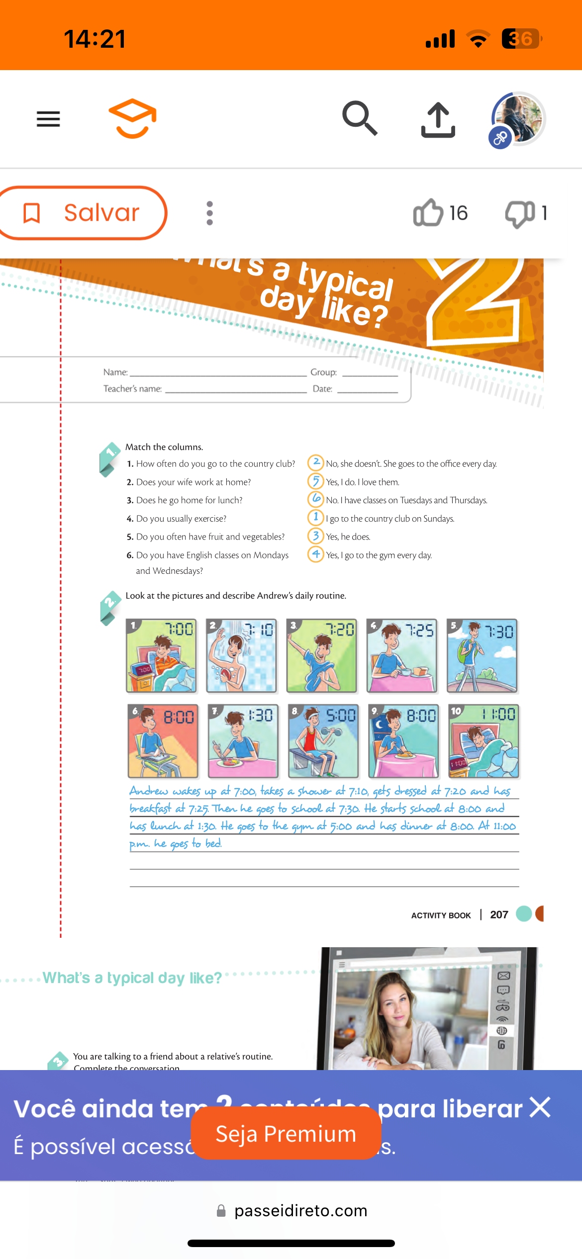 14:21 36 Q Salvar 16 1 day like? typical Z Name: Group: Teacher's name: Date: Match the columns. 1. How often do you go to the country club? 2 No, she She goes to the office every day. 2. Does your wife work at home? 5 Yes, do. love them. 3. Does he go home for lunch? 6 No. have classes on Tuesdays and Thursdays. 4. Do you usually exercise? 1 go to the country club on Sundays. 5. Do you often have fruit and vegetables? 3 Yes, he does. 6. Do you have English classes on Mondays 4 Yes, go to the gym every day. and Wednesdays? Look at the pictures and describe Andrew's daily routine. 1 7:25 5. 1:30 6 8 8:00 5:00 8:00 10 : Andrew wakes up at 7:00, takes a shower at 7:10, gets dressed at 7:20 and has breakfast at Then he goes to school at 7:30. He starts school at 8:00 and has lunch at He goes to the gym at 5:00 and has dinner at At 11:00 p.m. he goes to bed. ACTIVITY BOOK 207 What's a typical day like? You are talking to a friend about a relative's routine. Complete the conversation Você ainda tem para liberar X É possível Seja Premium S. passeidireto.com