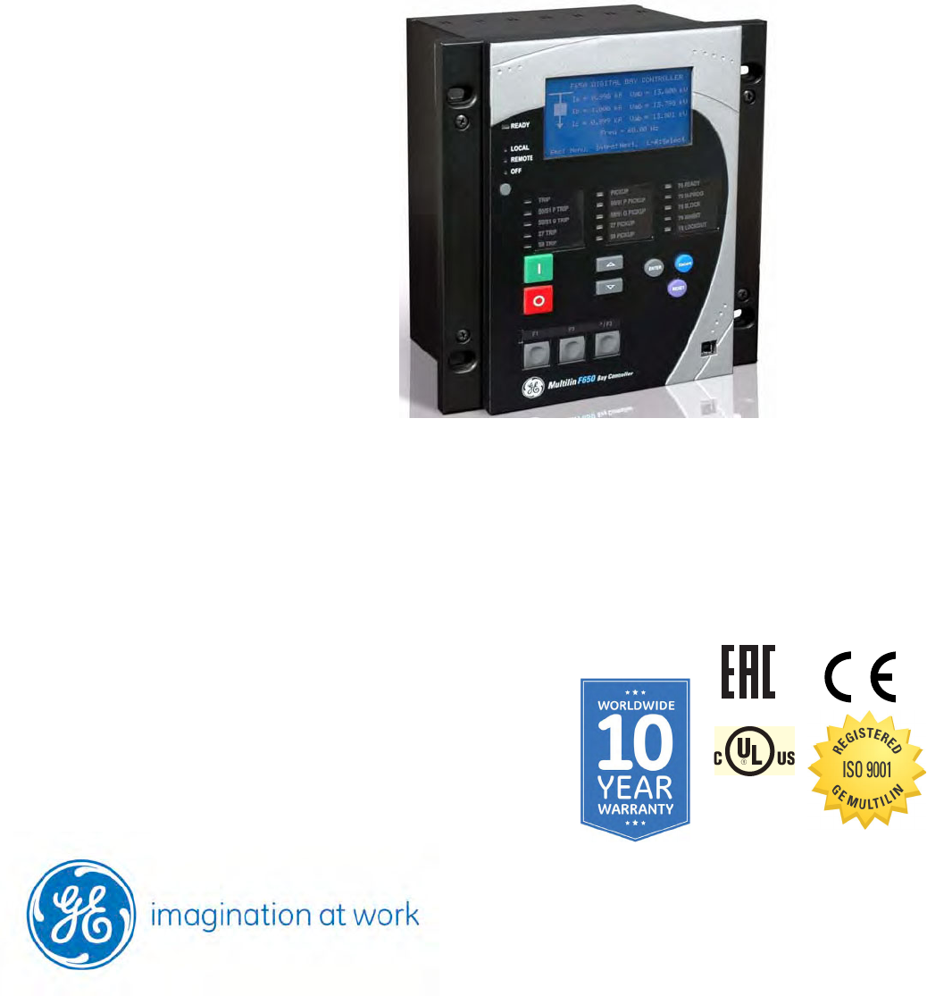 *1601-0800-A4* F650 Digital Bay Controller GE Grid Solutions Instruction Manual Firmware version: 9.0x EnerVista F650 Setup version: 9.0x GE publication code: 1601-0800-A4 LISTED © 2024 GE Multilin. All rights reserved. GE Multilin F650 Digital Bay Controller instruction manual for revision 1601-0800-A4. F650 Digital Bay Controller, EnerVista, and EnerVista 650 family Setup are registered trademarks of GE Multilin. The contents of this manual are the property of GE Multilin. This documentation is furnished on license and may not be reproduced in whole or in part without the permission of GE Multilin. Part number: 1601-0800-A4 (April 2024) Disclaimer It is the responsibility of the user to verify and validate the suitability of all GE Grid Automation products. This equipment must be used within its design limits. The proper application including the configuration and setting of this product to suit the power system assets is the responsibility of the user, who is also required to ensure that all local or regional safety guidelines are adhered to. Incorrect application of this product could risk damage to property/the environment, personal injuries or fatalities and shall be the sole responsibility of the person/entity applying and qualifying the product for use. The content of this document has been developed to provide guidance to properly install, configure and maintain this product for its intended applications. This guidance is not intended to cover every possible contingency that may arise during commissioning, operation, service, or maintenance activities. Should you encounter any circumstances not clearly addressed in this document, please contact your local GE service site. The information contained in this document is subject to change without notice. IT IS THE SOLE RESPONSIBILITY OF THE USER TO SECURE THEIR NETWORK AND ASSOCIATED DEVICES AGAINST CYBER SECURITY INTRUSIONS OR ATTACKS. GE GRID AUTOMATION AND ITS AFFILIATES ARE NOT LIABLE FOR ANY DAMAGES AND/OR LOSSES ARISING FROM OR RELATED TO SUCH SECURITY INTRUSION OR ATTACKS. F650 Digital Bay Controller Table of Contents GE Grid Solutions 1 GETTING STARTED 1.1 Important procedures ..................................................................................... 1-1 1.1.1 Cautions and warnings ....................................................................................................... 1-1 1.1.1.1 General cautions and warnings.................................................................................................1-2 1.1.1.2 Communication board withdrawal/insertion......................................................................1-3 1.1.1.3 Magnetic module terminals.........................................................................................................1-4 1.1.2 Inspection checklist............................................................................................................... 1-5 1.1.3 Safety instructions ................................................................................................................. 1-7 1.1.3.1 General safety instructions ..........................................................................................................1-8 1.1.3.2 Warning symbols ..............................................................................................................................1-9 1.2 Overview ..........................................................................................................1-10 1.2.1 Introduction to the 650 family of relays ....................................................................1-10 1.2.2 Hardware architecture ......................................................................................................1-10 1.2.2.1 F650 basic design.......................................................................................................................... 1-10 1.2.2.2 F650 signal type ............................................................................................................................. 1-11 1.2.3 Communications architecture .......................................................................................1-11 1.3 EnerVista 650 Setup software......................................................................1-14 1.3.1 System requirements .........................................................................................................1-14 1.3.2 Installation...............................................................................................................................1-14 1.3.3 Connecting EnerVista 650 Setup to the F650 .........................................................1-18 1.3.3.1 Configuring an Ethernet connection .................................................................................... 1-18 1.3.3.2 Configuring the RS232 connection........................................................................................ 1-18 1.4 650 hardware ..................................................................................................1-19 1.4.1 Mounting & wiring................................................................................................................1-19 1.4.2 650 communications..........................................................................................................1-19 1.4.3 Faceplate display .................................................................................................................1-20 1.4.4 Maintenance...........................................................................................................................1-21 1.4.4.1 General maintenance.................................................................................................................. 1-21 1.4.4.2 In-service maintenance.............................................................................................................. 1-21 1.4.4.3 Out-of-service maintenance ............