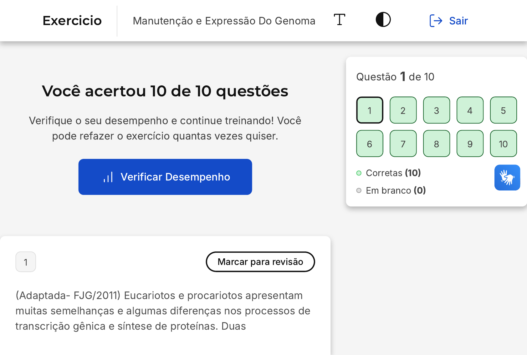 Você acertou 10 de 10 questões Verifique o seu desempenho e continue treinando! Você pode refazer o exercício quantas vezes quiser. Verificar Desempenho 1 Marcar para revisão �Adaptada- FJG/2011� Eucariotos e procariotos apresentam muitas semelhanças e algumas diferenças nos processos de transcrição gênica e síntese de proteínas. Duas Questão 1 de 10 Corretas �10� Em branco �0� 1 2 3 4 5 6 7 8 9 10 Exercicio Manutenção e Expressão Do Genoma Sair A B C D E características exclusivas dos procariotos nessas vias metabólicas incluem: RNA mensageiro policistrônico e ausência de íntrons. RNA mensageiro monocistrônico e presença de íntrons. RNA mensageiro com cauda poli-A e ausência de íntrons. RNA mensageiro com cauda poli-A e presença de íntrons. RNA mensageiro policistrônico e presença de íntrons. Resposta correta Parabéns, você selecionou a alternativa correta. Confira o gabarito comentado! Gabarito Comentado Nos procariotos, uma mesma região promotora pode controlar a transcrição de vários genes, sendo chamados de genes policistrônicos. Dessa forma, o mRNA irá conter a informação para a síntese de proteínas de todos os genes transcritos, sendo, portanto, um mRNA policistrônico. A presença de regiões denominadas de íntrons (regiões que não contém sequência que codifica proteínas) ocorre somente em seres eucariotos. 2 Marcar para revisão A B �Adaptado UFU�MG/2018� A replicação do DNA é um processo de duplicação da molécula de DNA de dupla cadeia. Em relação à replicação do DNA, analise as afirmativas abaixo: I � A sequência usual de crescimento da nova fita de DNA ocorre no sentido 3¿�5¿. II � A replicação do DNA é semiconservativa. III � A enzima DNA primase é responsável pela separação da dupla fita de DNA. IV � Um cromossomo humano pode apresentar múltiplas origens de replicação. Sobre as alternativas apresentadas, assinale a sequência correta de afirmações verdadeiras �V) e falsas �F�. V, V, F, F. F, V, F, V. C D E F, F, V, V. F, F, V, F. V, F, V, F. Resposta correta Parabéns, você selecionou a alternativa correta. Confira o gabarito comentado! Gabarito Comentado A primeira afirmação é falsa, pois a sequência usual de crescimento da nova fita de DNA ocorre no sentido 5'�3'. A segunda afirmação é verdadeira, pois a replicação do DNA é semiconservativa, o que significa que a nova molécula é formada por uma fita parental e uma fita filha recém-sintetizada. A terceira afirmação é falsa, pois a separação da dupla fita de DNA é realizada pela enzima DNA helicase, e não pela DNA primase. A quarta afirmação é verdadeira, pois um cromossomo humano pode apresentar múltiplas origens de replicação, devido ao seu tamanho considerável, tornando inviável haver uma única origem de replicação. Portanto, a sequência correta de afirmações verdadeiras �V) e falsas �F) é F, V, F, V. 3 Marcar para revisão Adaptada - FUNDEP/2019� Considerando que o processo de replicação do DNA é bastante complexo e demanda a participação de diversas enzimas, analise as afirmativas a seguir e a relação proposta sobre elas: I � A replicação do DNA gera duas fitas uma contínua e outra descontínua, sendo a segunda composta pelos chamados fragmentos de Okasaki. Porque II � A DNA polimerase consegue adicionar A B C D E nucleotídeos apenas à extremidade 5' da fita que está sendo sintetizada. Nesse contexto, é correto afirmar que: Ambas as afirmativas são verdadeiras, e a segunda é justificativa da primeira. Ambas as afirmativas são verdadeiras, e a segunda não é justificativa da primeira. Apenas a primeira afirmativa é verdadeira, enquanto a segunda é falsa. Apenas a segunda afirmativa é verdadeira, enquanto a primeira é falsa. Ambas as afirmativas são falsas. Resposta correta Parabéns, você selecionou a alternativa correta. Confira o gabarito comentado! Gabarito Comentado Durante a replicação, duas fitas novas são sintetizadas a partir das duas fitas simples do DNA que estão separadas e, portanto, são usadas como molde. Porém, como a síntese só ocorre no sentido 5'�3' e a DNA polimerase só consegue adicionar nucleotídeos à extremidade 3'�OH livre, uma das fitas é sintetizada de forma diferente. Enquanto uma delas é sintetizada continuamente (fita-líder) a outra só pode ser sintetizada em pequenos fragmentos (os fragmentos de Okasaki), sendo chamada de fita descontínua. A B C 4 Marcar para revisão �Adaptada - FGV/2010� Na replicação do DNA, um complexo enzimático é necessário para que o processo ocorra corretamente. As topoisomerases �I e II) são enzimas que atuam na replicação e estão presentes durante o superenovelamento do DNA. Essas enzimas catalisam: A quebra e religação da cadeia polinucleotídica de DNA. A quebra das pontes de hidrogênio do DNA. A síntese da nova cadeia de DNA. D E A ligação dos fragmentos de Okasaki. A adição de unidades repetitivas nas terminações cromossômicas. Resposta correta Parabéns, você selecionou a alternativa correta. Confira o gabarito comentado! Gabarito Comentado As topoisomerases são enzimas importantes que atuam durante a replicação do DNA, pois resolvem o problema causado pelo superenovelamento do DNA. O que elas fazem é introduzir uma quebra temporária em uma ou nas duas fitas de maneira que haja o relaxamento do DNA. Posteriormente, as topoisomerases restauram a ligação quebrada. 5 Marcar para revisão �Adaptado - IFC�SC/2015� Os ácidos nucléicos são macromoléculas de enorme importância biológica. Todos os seres vivos, com exceção dos vírus que contém apenas um deles, possuem os dois tipos de ácidos nucléicos que são o DNA e o RNA, ambos relacionados ao mecanismo de controle do metabolismo celular e transmissão hereditária das características. Sobre os ácidos nucleicos, suas estruturas e propriedades, são feitas as afirmaç