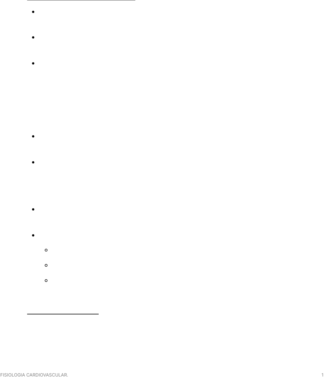 FISIOLOGIA CARDIOVASCULAR. 1 FISIOLOGIA CARDIOVASCULAR. Introdução a fisiologia cardiovascular o coração bombeia e ejeta o sangue para a circulação pulmonar e para a circulção sistêmica. A circulação sanguínea conduz o sangue para os capilares pulmonares, para haver troca gasosa, e para os capilares teciduais para nutrir os tecidos. Na circulação sanguínea há o sistema arterial e o sistema venoso, em que cada um vão apresentar uma estrutura histológica e local de pressão específicas. Como, por exemplo, ventrículo esquerdo apresenta uma epessura maior para fornecer uma força maior de contração, e no sistema arterial a pressão vai ser maior que a do sistema venoso, garantindo o fluxo sanguíneo. Quais tecidos existem no coração? tecidos de condução que conduz para todo coração o pontencial gerado pelo nó sinoatrial: vias interatriais, vias internodais, feixe de Hiss e as fibras de purkinje. tecidos nodais, capazes de gerar seu próprio potencial de ação: NSA e AV, o principal vai ser o NSA, já que ele tem uma maior permeabilidade ao Na, portanto, gera PA mais rapidos, por isso, que ele vai ser chamado de marca-passo, já que determina a frequência cardíaca. tecido muscular cardiaco ou miocárdio, que recebe o estimulo do potencial de ação gerado pelo tecidos nodais. Por isso, as propriedades do coração correspondem a: excitabilidade condultilidade contrabilidade Eletrofisiologia Cardiaca 1. Potencial marca passo e de Açao do NSA. FISIOLOGIA CARDIOVASCULAR. 2 na membrana do NSA apresenta canais ionicos lentos dependentes de voltagem (canais voltagem dependente), fazendo com que eles não apresentem um potencial de membrana (potencial de repouso), mas um potencial marca passo (DDL: despolarizaçao diastolica lenta), onde a membrana vai se despolarizando lentamente, tendendo atingir o potencial limiar (-40). Quando volta para seu menor potencial (-60mV), os canais lentos de sódio se abrem novamente, permitindo a entrada lenta do sódio e, consequentemente, gerando uma despolarizaçao lenta. Quando a celula atinge o potencial limiar, abrem-se os canais rapidos de Ca dependentes de voltagem, que se mantem abertos ate atingi o potencial de inversao (20mV), onde fecha os canais de CA e abrem-se os canais de K (REPOLARIZAÇAO) que saem da celula (a favor do gradiente) ate o potencial retornar ao -60mV, abrindo canais lento de Na (despolarizaçao diastolica lenta DDL) O estado dos canais ionicos serao determinados de acordos com a fase: FASE 4: canais lentos de Na voltagem dependente abertos, o que permite a chegada ao potencial limiar. INICIO DA FASE 0: os canais lentos de Na se fecham e os canais rapidos de Ca se abrem FASE 0 : canais rapidos de Ca abertos. INICIO DA FASE 3: a membrana atinge o potencial de inversao, canais de Ca se fecham e os Canais de K se abrem. FASE 3: canais de K abertos. INICIO DA FASE 4: durante a repolarizaçao, a membrando antige -60mV, abrindo os canais lentos de Na. 2. Potencial de ação da célula muscular cardíaca a fibra cardiaca não tem autoexcitabilidade, então não tem canais lentos de sodio, ela esta em repouso (canais fechados), esperando o potencial do NSA chegar para que sejam abertos e cause a despolarizaçao. A membrana da fibra cardiaca fica em repouso em um potencial de -90mV (potencial de membrana). Quando o potencial de ação, gerado pelo NSA, chega na fibra, promove a abertura dos canais rápidos de Na e canais lentos de calcio, tendo uma despolarizaçao espontânea, isto é, no tempo 0. FISIOLOGIA CARDIOVASCULAR. 3 Essa despolarizaçao termina quando a membrana atinge o potencial de 30mV, que fecha os canais rápidos de Na, porém os de Ca continuam abertos. A partir dai, abre-se alguns canais de K, permitindo a saida do K do MIC para o MEC, diminuindo a carga da membrana, entretanto essa diminuicao não é abrupta, devido a abertura dos canais de Ca, que são canais tempo dependentes, que entram na celula (a favor do gradiente), importante para iniciar a contraçao cardiaca. Isso estabelece o platô ou plateau, a presença de Ca diminui a permeabilidade da membrana ao K, fazendo a despolarizacao durar mais. O periodo de plato gera uma contracao que saem da celula. Os canais de K se abrem, permitindo uma repolarização mais rapida ate atingir -90mV e promover relaxamento do coraçao. INICIO DA FASE 0: potencial de açao chegou e abriu canais rapidos de Na FASE 0 : canais rapidos de Na abertos. FASE 1: canais rapidos de Na se fecham, canais rápidos de K se abrem FASE 2: canais de Ca abertos e fecham de K rápidos INICIO DA FASE 3: canais de Ca se fecham FASE 3: canais lentos de K abertos. FISIOLOGIA CARDIOVASCULAR. 4 FASE 4: repouso. A cada PA gerado pelo NSA, ocorre um PA na célula cardiaca, e uma contraçao cardiaca. A entrada do Ca, durante o plato promove a contraçao. 💡 O potencial de membrana ideal para abertura dos canais rapidos de Na é -90mV. Se caso houver uma maior concentraçao de K (por insuficiência cardíaca ou ingestão), o potencial da membrana fica mais positivo, impedindo a abertura dos canais rápidos de Na, impedindo a despolarizaçao, impedindo a contraçao do músculo cardíaco. FISIOLOGIA CARDIOVASCULAR. 5 💡 É uma caracteristica especifica da célula do NSA ter canais lentos de Na em sua membrana. Enquanto é uma caracteristica especifica da fibra muscular cardiaca ter canais rapidos de Na em sua membrana 💡 Lembre-se o PA não muda de amplitude entre os tecidos e nem altera a sua duraçao, em condiçoes normais. 3. Invervação simpática e parassimpática O simpático inverva nódulos e o músculo cardíaco. O parassimpático inverva apenas os nódulos. Como eles vão saber quando agir? Na aorta e nas carotidas existem receptores de pressão, que levam a informaçao da pressao arterial aos núcleos bulbares (centro vasomotor), que controlam o coração, permitindo um ajuste simpatico ou parassimpatico, depende do tipo de informaçao que os receptores enviaram ao SN