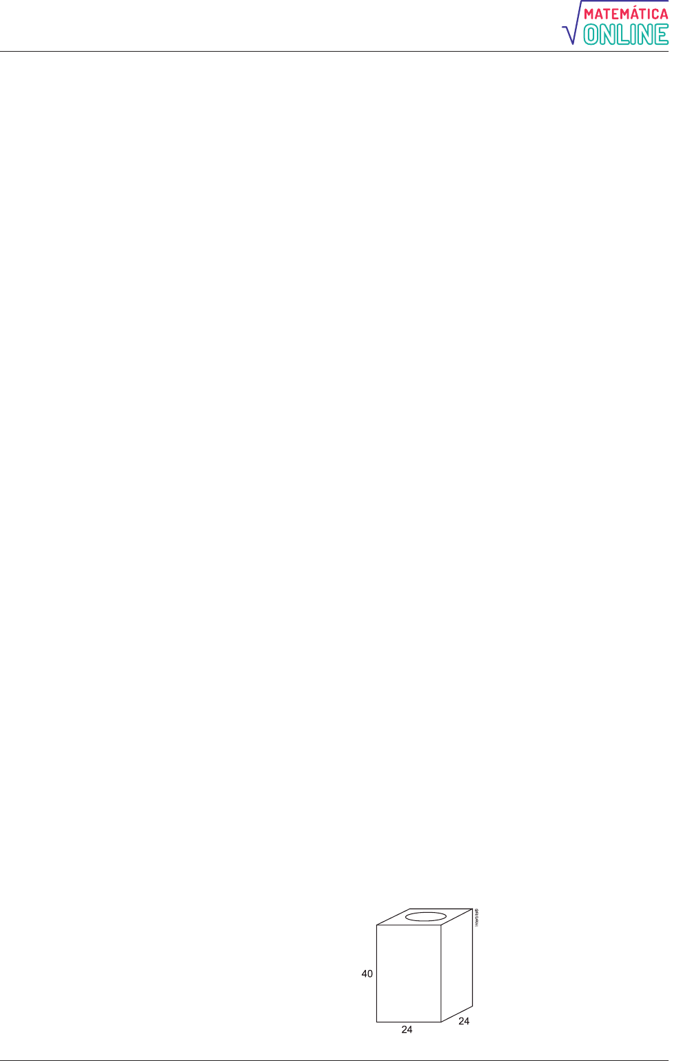 Alisson Marques - online 13 73. (Enem PPL 2014) O Brasil é o quarto produtor mundial de alimentos, mas aproximadamente 64 toneladas de cada 100 toneladas que se produz são perdidas ao longo da cadeia produtiva. Em relação ao total de alimentos produzidos, a perda de alimentos é distribuída da seguinte forma: 20 toneladas na colheita, 8 toneladas no transporte e armazenamento, 15 toneladas na indústria de processamento, 1 tonelada no varejo e 20 toneladas no processamento culinário e hábitos alimentares. Disponível em: www.bancodealimentos.org.br. Acesso em: 26 out. 2011 (adaptado). De acordo com os dados apresentados, os alimentos que são perdidos no processamento culinário e nos hábitos alimentares representam qual porcentagem em relação ao total de alimentos que são perdidos no país? a) 12,28% b) 20,00% c) 31,25% d) 36,00% e) 44,00% 74. (Ufrgs 2014) Uma mercadoria com preço inicial de R$ 500,00 sofreu reajustes mensais e acumulados de 0,5%. O preço dessa mercadoria, ao fim de 12 meses, é a) 12500 0,005 . b) 12500 0,05 . c) 12500 1,005 . d) 12500 1,05 . e) 12500 0,5 . 75. (Enem 2014) Uma ponte precisa ser dimensionada de forma que possa ter três pontos de sustentação. Sabe-se que a carga máxima suportada pela ponte será de 12t. O ponto de sustentação central receberá 60% da carga da ponte, e o restante da carga será distribuído igualmente entre os outros dois pontos de sustentação. No caso de carga máxima, as cargas recebidas pelos três pontos de sustentação serão, respectivamente, a) 1,8t; 8,4t; 1,8t. b) 3,0t; 6,0t; 3,0t. c) 2,4t; 7,2t; 2,4t. d) 3,6t; 4,8t; 3,6t. e) 4,2t; 3,6t; 4,2t. 76. (G1 - ifpe 2014) Observe o trecho de uma matéria sobre a redução do IPI: O ministro da Fazenda anunciou a redução do Imposto sobre Produtos Industrializados (IPI). Como amplamente divulgado, os veículos zero quilômetro devem ter redução de 10% no preço ao consumidor, aproximadamente, o que já deve valer, na prática, a partir de hoje, na maioria das concessionárias. Disponível em: <http://www.vrum.com.br/app/301,19/2012/05/24/interna_ noticias,45880/e-a-historia-do-ipi-se-repete.shtml>. Acesso em: 01.set.2013. (adaptada). De acordo com as informações contidas no texto e seu conhecimento matemático, se a versão básica de um automóvel custava R$ 23.600,00 antes da redução do IPI, essa mesma versão passará, após a redução do imposto, a ter um preço sugerido de: a) R$ 21.240,00 b) R$ 21.340,00 c) R$ 22.600,00 d) R$ 23.164,00 e) R$ 23.240,00 77. (Pucrj 2014) Em uma loja, uma peça de roupa que custava R$ 200,00 passou a custar R$ 100,00 na liquidação. O desconto foi de: a) 200% b) 100% c) 50% d) 20% e) 10% 78. (Pucrj 2014) Em um círculo, um ângulo central de 20 graus determina um arco de 5 cm. Qual o tamanho do arco, em cm, determinado por um ângulo central de 40 graus? a) 5 b) 10 c) 20 d) 40 e) 60 79. (Enem 2014) Uma lata de tinta, com a forma de um paralelepípedo retangular reto, tem as dimensões, em centímetros, mostradas na figura.