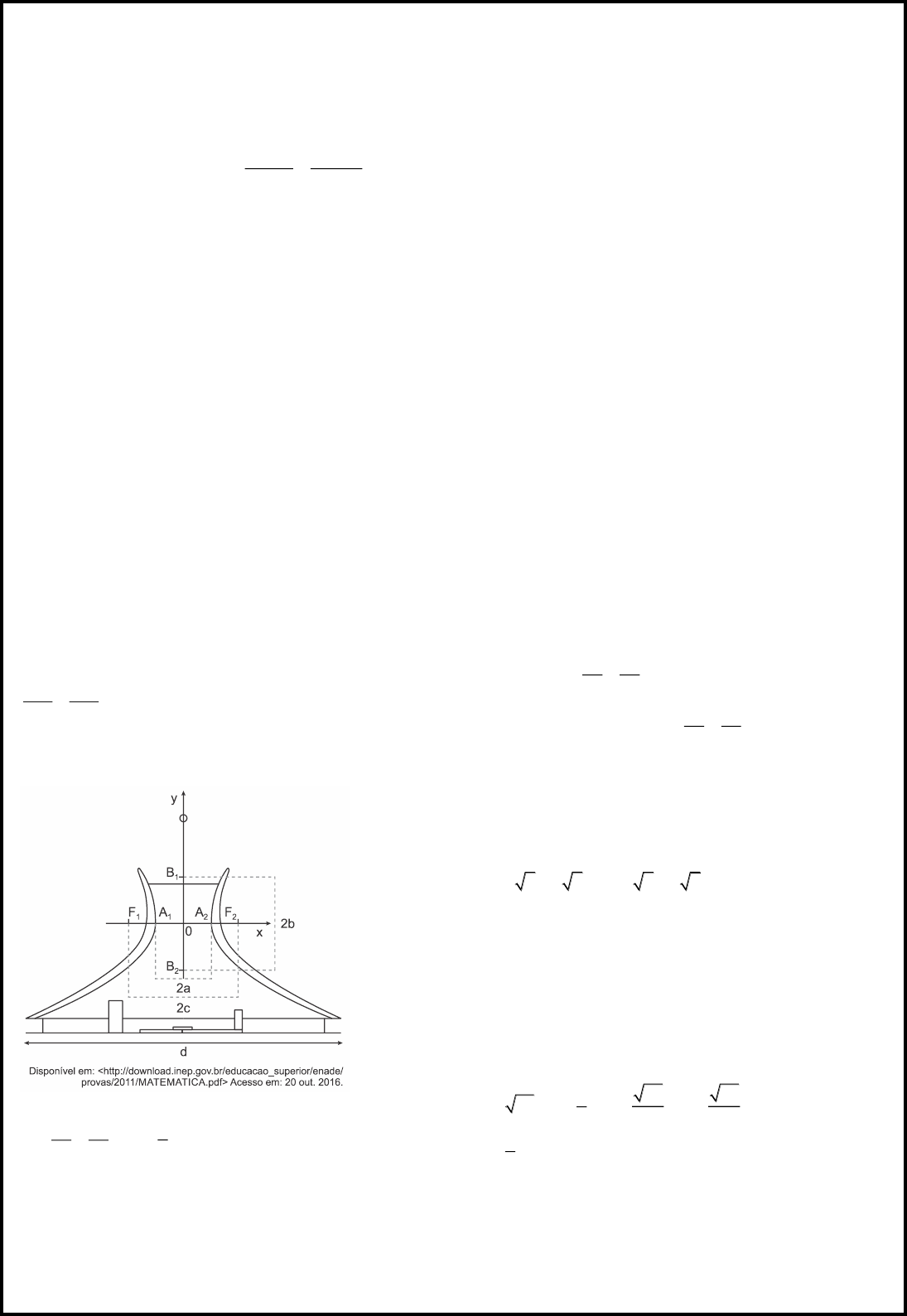 COLÉGIO PREVEST PROFESSOR : ULISSES MOTTA LISTA DE EXERCÍCIOS SOBRE CÔNICAS 1. (Epcar (Afa) 2018) No plano cartesiano, os pontos P(x, y) satisfazem a equação 2 2(x 1) (y 2) 1 25 9 da curva .λ Se 1F e 2F são os focos de ,λ tais que a abscissa de 1F é menor que a abscissa de 2F , é INCORRETO afirmar que a) a soma das distâncias de P a 1F e de P a 2F é igual a 10. b) 1F coincide com o centro da curva 2 2x y 6x 4y 0. c) 2F é exterior a 2 2x y 25. d) o ponto de abscissa máxima de λ pertence à reta y x 8. 2. (Ufsc 2017) Em relação às proposições abaixo, é correto afirmar que: 01) A catedral de Brasília foi projetada pelo arquiteto Oscar Niemeyer. Sua estrutura se destaca pela beleza e pela forma, um hiperboloide de rotação. A figura abaixo destaca os principais elementos da hipérbole associada à forma da catedral e é possível perceber que ela tem como base um círculo de diâmetro d. Supondo que a equação dessa hipérbole seja 2 2x y 1 225 400 e que a medida do diâmetro tenha 10 metros a mais que a distância focal, então a medida d será igual a 60 metros. 02) A excentricidade da elipse de equação 2 2x y 1 25 4 é 1 . 3 04) O valor de k na matriz k 1 A 1 k para que se tenha 1 tA A é k 0. 08) Se 1 3 2 A 0 5 1 e 3 4 1 B , 0 2 6 então o tdet(A B ) não existe. 16) Se em uma loja de moda masculina Júlio comprar um par de sapatos, duas calças e três camisas, ele pagará R$ 520,00. Se comprar, na mesma loja, um par de sapatos, três calças e cinco camisas, pagará R$ 760,00. Logo, na compra de um par de sapatos, de uma calça e de uma camisa, nessa mesma loja, Júlio pagará R$ 280,00. 3. (Uem 2017) Baseado em conhecimentos sobre cônicas, assinale o que for correto. 01) Elipse é o lugar geométrico dos pontos equidistantes de dois pontos distintos fixos chamados focos. 02) A equação 2 24x 9y 25 0 determina uma hipérbole de focos no eixo x. 04) Seja r uma reta e P um ponto fora dela, ambos no mesmo plano. O lugar geométrico dos pontos equidistantes a r e a P será uma parábola. 08) A elipse de focos ( 1, 0) e (1, 0), com seu eixo maior de extremidades em ( 3, 0) e (3, 0), tem equação 2 2x y 1. 9 8 16) O eixo maior da elipse 2 2x y 1 49 36 tem extremidades (7, 0) e ( 7,0). 4. (Espcex (Aman) 2017) Os valores reais de n para os quais a reta (t) y x n seja tangente à elipse de equação 2 22x 3y 6 são iguais a a) 5 e 5 b) 3 e 3 c) 3 e 3 d) 2 e 2 e) 5 e 5 5. (Fgv 2017) Na representação gráfica do sistema de equações 2 2 2 x y 4 4x y 2 no plano cartesiano, uma das soluções é (0, 2). A distância entre os pontos que representam as duas outras soluções desse sistema é igual a a) 14. b) 7 . 2 c) 15 . 2 d) 14 . 2 e) 3 . 2 6. (G1 - ifce 2016) A expressão 2 2x y 2x 4y 4 0 descreve a equação de um(a) a) hipérbole. b) parábola. c) elipse. d) círculo. e) reta. 7. (Epcar (Afa) 2016) Analise as proporções abaixo e escreva V para a(s) verdadeira(s) e F para a(s) falsa(s). I. ( ) A distância entre o vértice e o foco da parábola 2y 4x 4 0 é igual a 1 unidade de comprimento. II. ( ) Numa hipérbole equilátera, as assíntotas são perpendiculares entre si. III. ( ) A equação 2 22x y 4x 4y 4 0 representa uma elipse que tem um dos focos no ponto P (1, 4) A sequência correta é a) F - F - V b) V - F - V c) F - V - F d) V - V - F 8. (G1 - ifpe 2016) Bira adquiriu uma cabra que pasta em um campo retangular. Para delimitar o gramado, ele pretende traçar uma elipse inscrita num terreno retangular de 10 m por 8 m. Para isso, ele deve utilizar um fio esticado preso por duas estacas M e N, conforme mostra a figura. Qual deve ser a distância entre as estacas M e N? a) 5 b) 4 c) 8 d) 6 e) 9 9. (Mackenzie 2016) Com relação às equações das elipses 2 225x 16y 150x 256y 351 0 e 2 216x 25y 96x 200y 144 0, podemos afirmar que a) as elipses têm centros coincidentes. b) as elipses têm a mesma distância focal. c) as elipses têm a mesma excentricidade. d) as elipses têm focos sobre o eixo das abscissas. e) o eixo maior de uma delas é o dobro do eixo menor da outra. 10. (Espcex (Aman) 2016) Considere as afirmações: I. Uma elipse tem como focos os pontos 1F ( 3, 0), 2F (3, 0) e a medida do eixo maior é 8. Sua equação é 2 2x y 1. 16 7 II. Os focos de uma hipérbole são 1F ( 10, 0), 2F (10, 0) e sua excentricidade é 5 . 3 Sua equação é 2 216x 9y 576. III. A parábola 28x y 6y 9 tem como vértice o ponto V(3, 0). Com base nessas afirmações, assinale a alternativa correta. a) Todas as afirmações são falsas. b) Apenas as afirmações I e III são falsas. c) Apenas as afirmações I e II são verdadeiras. d) Todas as afirmações são verdadeiras. e) Apenas a afirmação III é verdadeira. 11. (Unesp 2016) Em um plano cartesiano ortogonal são dadas uma reta d, de equação x –3, e um ponto F, de coordenadas (–1, 2). Nesse plano, o conjunto dos pontos que estão à mesma distância do ponto F e da reta d forma uma parábola. Na figura, estão nomeados dois pontos dessa parábola: o vértice V, de coordenadas (–2, 2), e o ponto P, de coordenadas p(0, y ). Determine as coordenadas de dois pontos quaisquer dessa parábola que sejam diferentes de V e de P. Em seguida, calcule py . 12. (Ime 2015) Determine o produto dos valores máximo e mínimo de y que satisfazem às inequações dadas para algum valor de x. 22x 12x 10 5y 10 2x a) 3,2 b) 1,6 c) 0 d) 1,6 e) 3,2 Gabarito: 1:[B] 2: 01 + 04 + 16 = 21. 3: 02 + 04 + 08 + 16 = 30. 4:[A] 5:[C] 6:[D] 7:[D] 8:[D] 9:[C] 10:[C] 11:2 p p p(y 2) 4(0 2) y 2 8 y 2(1 2). 12:[A]