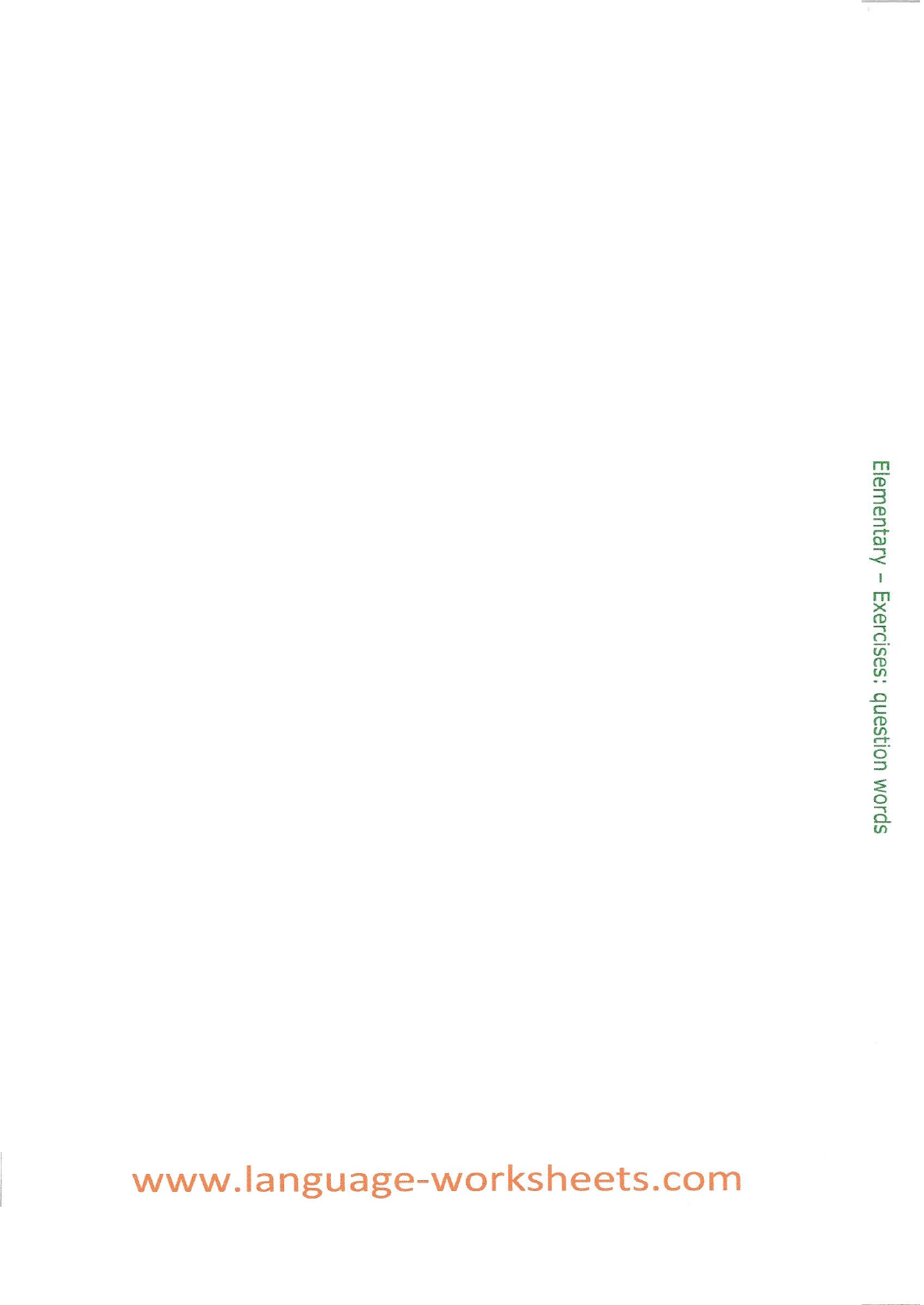 Question Words. Exercises. Fill in the question words What, Where, Why, When, How, Who to form the question. 1. __________ do you like best? 2. __________ does Manolo get up in the morning? 3. __________ don´t you go by bus, Cristina? 4. __________ hobbies does Carlos like? 5. __________ do they go to every week? 6. __________ old are you Silvia? 7. __________ is Maria´s birthday? 8. __________ are my exercise books? 9. __________ are you doing at the moment, Harry? 10. __________ do the Petersons live? Fill in the correct question word. 1. __________ sits next to Dries? Mo. 2. __________ does the boy come from? From Madrid. 3. __________ old are her children? Three and five. 4. __________ is Lola´s birthday? In March, I think. 5. __________ much is the shirt? It´s twenty euros. 6. __________ is best at playing tennis? Johann. 7. __________ are you going? To my parents. 8. __________ much is an soda? It´s one euro. 9. __________ does the restaurant open? At ten o´clock. 10. __________ can I get some ice cream? At the snack bar. 11. __________ are you going to order? Pasta. 12. __________ are you going to do on Monday? I don´t know. 13. __________ has got my sunglasses? I have got them. 14. __________ is your name? Rita. 15. __________ is Helen´s party? On Friday. Complete with the correct question word. 1. _______ much are the patotoes? One dollar. 2. _______ can I do for you? I want two white T-shirts. 3. _______ can I get a newspaper? At Park street. 4. _______ is your best friend? It´s paul. 5. _______ does Lisa live? In Boston. 6. _______ colour is your new car? It´s white. 7. _______ do you collect? Stickers. 8. _______ can help me? I can. 9. _______ about some grapes? No, thanks. 10. _______ was your first word as a baby? Mama. 11. _______ were you born? On March 9th. 12. _______ were you born? In St. Maarten. 13. _______ were you last Sunday? I was working. 14. _______ can we have a picnic? I know a nice place near a pond. 15. _______ are you going to take with you? Some sandwiches and a coke. Choose between What, Which and Whose. 1. ________ time is it? 2. ________ colour is her hair? 3. ________ kind of clothes do you like to wear? 4. ________ school do you go to? 5. ________ doll is your favourite? 6. ________ road leads to the Zoo? 7. ________ runner is the last one? 8. Do you know ________ girl won the prize? 9. ________ foot print´s are these? 10. ________ baby is this? Choose between What, Which and Whose. 1. ________ kind of animal is that? 2. ________ runner is the winner? 3. ________ is the matter? 4. ________ desk is this? 5. ________ cell phone is ringing? 6. ________ is your name? 7. ________ twin is taller? 8. ________ hand is holding the pen? Complete the questions with these words (When, Where, Who, What). 1. ________ is your favourite singer? 2. ________ is your house? 3. ________ is your favourite day of the week? 4. ________ is your favourite colour? 5. ________ are your English lessons? 6. ________ is your favourite movie? 7. ________ are you from? 8. ________ is near you house? 9. ________ do you live? 10. ________ is your favourite type of music? 11. ________ are your English lessons at school? 12. ________ is your favourite sportsperson? 13. ________ is your English teacher? 14. ________ is your favourite animal? 15. ________ do you like to do Saturdays? 16. ________ time do you got to school? 17. ________ is his name? 18. ________ is the museum? 19. ________ do you go to school? 20. ________ is he talking to? 21. ________ is your dog´s name? 22. ________ is the time? 23. ________ are those people? 24. ________ are you talking about? 25. ________ are you going to leave? Choose between How, What, Where, When, Who. 1. ________ are you, Mr Gordon? 2. ________ is she doing? 3. ________ time is she coming home? 4. ________ are you going. I am going to the park. 5. ________ are you going. I´m going on Monday? 6. ________ do you go to school? I go to school in Málaga. 7. ________ does Pedro work? He works every evening. 8. ________ many cars does your family have? We have two cars. 9. ________ does the dog want? It wants a big bone. 10. ________ much is that? It costs 3 euros. 11. ________ do you like to eat? I like to eat chicken. 12. ________ is reading in the library. Sandra is reading in the library. 13. ________ time is it now? It´s nine o´clock. 14. ________ is your school? It is near the post office. 15. ________ is this lady? She is my favourite teacher. 16. ________ do you like better, cakes or chocolates? 17. ________ often do you go to the movies?