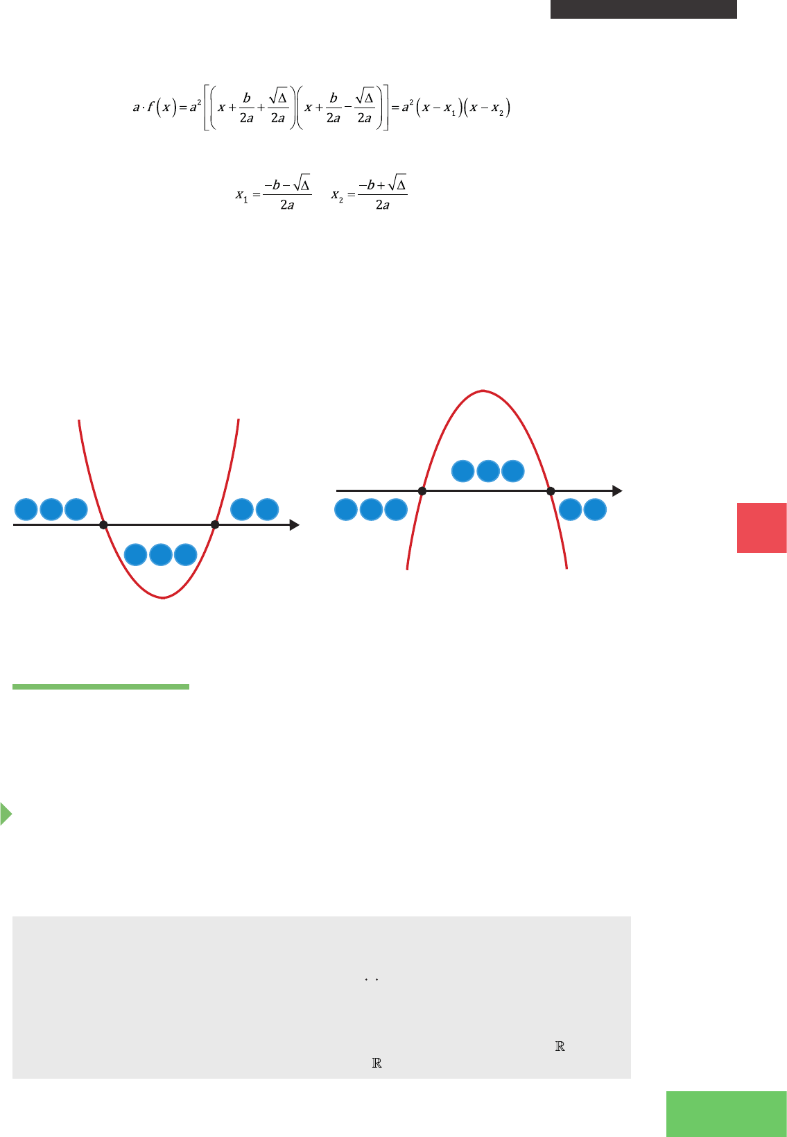 51 II - FUNÇÕES E SEUS GRÁFICOS MATEMÁTICA BÁSICA MBAutor: Rodrigo Nogueira de Codes Figura 2.24: Sinais da função quadrática para ∆ > 0 (as duas raízes reais ou zeros da função cortam o eixo x) e: (a) a > 0 e (b) a < 0. A forma canônica pode ser transformada em: onde: e O estudo do sinal para esse caso é bem mais interessante. Este será dado como exercício para o leitor verificar que: 1. O sinal de f (x) é o sinal de a para todo x, tal que x < x1 ou x > x2. Ou seja, é o sinal de a fora do intervalo compreendido entre as raízes x1 e x2 (Figura 2.24). 2. O sinal de f (x) é o sinal de –a para todo x, tal que x1 < x < x2, isto é, entre as raízes x1 e x2 (Figura 2.24). (a) (b) Inequações Por fim, conclui-se o estudo preliminar sobre a função quadrática resolvendo inequações do tipo ax2 + bx + c > 0, ax2 + bx + c < 0, ax2 + bx + c ≥ 0 ou ax2 + bx + c ≤ 0 (a ≠ 0), que são denominadas inequações do segundo grau. Tal estudo depende essencialmente do sinal da função quadrática, que foi visto no tópico anterior. Os exemplos seguintes ilustrarão como devem ser resolvidas questões desse assunto. EXERCÍCIO RESOLVIDO 1. Resolver as inequações listadas abaixo: a) x2 – 2x + 3 > 0 b) (x2 – 2x + 3).(-2x2 - 10x + 12) ≥ 0 Resposta a) Para o primeiro item, tem-se que: a = 1; b = -2 e c = 3. ∆ = b2 -4ac = (-2)2 -4 1 (3) ⇒ ∆ = –8. Logo, ∆ < 0 e essa função não possui raízes reais, o que significa que ela não cortará o eixo x em nenhum ponto. Como a > 0, a função terá concavidade para cima. Então, conclui-se que ela será toda positiva, como ilustra a Figura 2.25. Portanto, f (x) > 0, ∀x ∈ . Como a inequação de interesse é f (x) > 0, temos que S = . x + + ++ + f(x) > 0 f(x) > 0 f(x) < 0 X2X1 - -- + ++ f(x) > 0 X2X1 - - -- - f(x) < 0 f(x) < 0 x