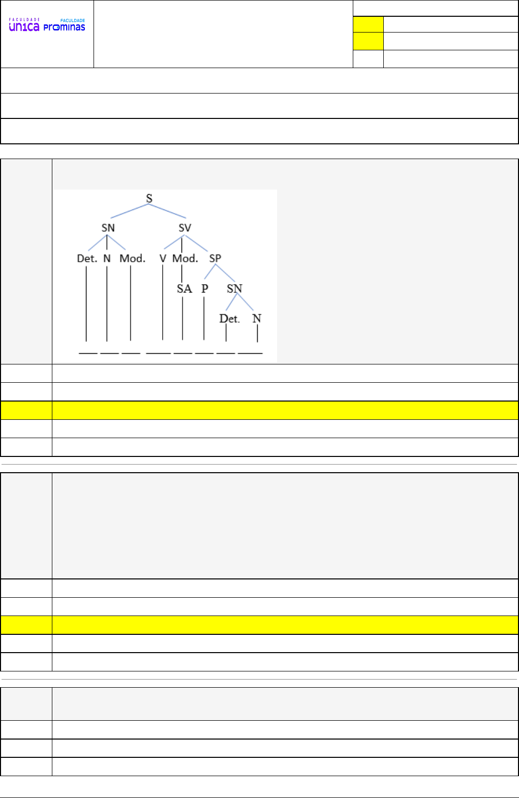 Pincel Atômico - 14/08/2024 10:46:37 1/3 CRISTIANE DUARTE SCHMITZ CAMINHO DO CONHECIMENTO Atividade finalizada em 14/08/2024 10:46:28 (tentativa: 2) LEGENDA Resposta correta na questão # Resposta correta - Questão Anulada X Resposta selecionada pelo Aluno Disciplina: PRÁTICA PEDAGÓGICA INTERDISCIPLINAR: SINTAXE [capítulos - 6] - Avaliação com questões, com o peso total de 1,67 pontos Turma: Segunda Graduação: Segunda Graduação 6 meses - Licenciatura em Letras-Português - Grupo: FPD-MARC/2024 - SGegu0A130324 [118540] Aluno(a): 91589390 - CRISTIANE DUARTE SCHMITZ - Respondeu 7 questões corretas, obtendo um total de 1,46 pontos como nota Questão 001 Observe a representação arbórea e assinale a alternativa cuja estrutura sintática NÃO corresponde à ramificação projetada. A) O cão raivoso ficou preso no alambrado. B) Aquele jornal velho ficou esquecido na mochila. X C) O chefe autoritário ordenou a demissão do estagiário. D) Minha banda preferida tocou lindamente no festival. E) O carro turbinado passou voando no vermelho. Questão 002 A identificação do sintagma na representação arbórea depende da projeção do núcleo do constituinte que é dada pela categoria da palavra. Essa identificação ocorre em 3 níveis: a palavra, a categoria a que pertence e o sintagma correspondente. A partir desse raciocínio, identifique APENAS os núcleos da sentença abaixo para demonstrar o segundo nível de projeção, isto é, a categoria gramatical a que pertencem: A casa feita de alvenaria. A) A, V, N. B) A, V, P. X C) N, V, P. D) N, V, A. E) N, V, N. Questão 003 Um núcleo pode estabelecer dois tipos de relações no interior de um sintagma (relações intrasintagmáticas). Essas relações são demarcadas pelos: A) Adjuntos e especificadores. B) Determinantes e adjuntos. C) Complementos e adjuntos. Pincel Atômico - 14/08/2024 10:46:37 2/3 X D) Especificadores e complementos. E) Núcleos e complementos. Questão 004 Com base nos princípios de projeção sintagmática da teoria X-barra descritos na unidade VI, o núcleo de um sintagma corresponde ao termo central que estabelece a relação sintática. Esse núcleo recebe denominação de acordo com a classificação morfológica do termo central que compõe o sintagma e pode ser designado como: A) SN ou SV apenas. B) XN, XV, XP e XA. C) SP ou SA apenas. D) Xº, X1, X2 e X3. X E) SN, SV, SP e SA. Questão 005 Com base no texto da unidade VI do livro, leia atentamente, preencha as lacunas do trecho abaixo e assinale a alternativa correspondente. A teoria X-barra é uma ferramenta de análise _______ desenvolvida no âmbito da gramática _______ e tem caráter _______ por buscar representar os esquemas _______ que caracterizam a estrutura _______ das línguas e suas variações. A) gramática; geral; específico; fixos; sintática. B) gerativa; tradicional; generalizador; rígidos; geral. C) sintática; tradicional; universal; gerais; interna. D) sintática; gerativa; universal; gerais; interna. X E) sintática; gerativa; restrito; fixos; interna. Questão 006 Na teoria sintática gerativa, as relações sintagmáticas podem se configurar por meios de dois processos: o intrasintagmático e intersintagmático. Assinale a alternativa que os explicita correta e respectivamente: A) Projeção e complementação B) Especificação e complementação C) Adjunção e complementação X D) Complementação e adjunção E) Adjunção e projeção Questão 007 De acordo com o texto da Unidade VI, uma representação arbórea visa representar: “[...] a partir de símbolos descritivos e quantificadores, as unidades _________ e ________, bem como as relações estabelecidas entre elas no ________ de um sintagma e entre de sintagmas visando ________ a hierarquia e a relação recursiva existente entre elas.” Assinale a alternativa que preenche corretamente as lacunas do texto: A) Lexicais; gramaticais; princípios; identificar. B) Lexicais; representativas; interior; compor. C) Integrantes; representativas; interior; demonstrar. D) Intermediárias; finais; princípios; compor. X E) Lexicais; gramaticais; interior; identificar. Pincel Atômico - 14/08/2024 10:46:37 3/3 Questão 008 Observe a estrutura sintática representada e assinale a alternativa correspondente. X A) O filme retrata um bombardeio. B) As cartas foram entregues ao porteiro. C) Nenhum carro passava pela rua. D) Aquela garota foi eleita miss. E) Seus olhos eram flamejantes.