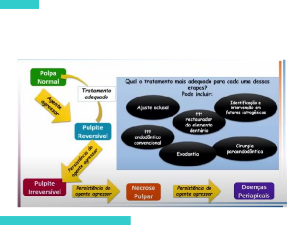 RESUMO DIAGNÓSTICO BUCAL – DCB II AULA 02 PERIAPICOPATIAS RELACIONADAS A NECROSE PULPAR CONCEITO As pericopatias são as lesões relacionadas à lesões no periápice causadas pela necrose pulpar. A necrose pulpar é a morte do tecido pulpar, resultante de uma pulpite irreversível, caracterizada pelos testes de sensibilidade negativos e coloração amarelada do dente. RELEMBRANDO: TIPOS DE PULPITE Pulpite reversível Dor provocada, intermitente de curta duração associada ao quente/frio. Polpa responsiva aos testes térmicos com dor aguda rápida, não há evidência radiográfica. Histologicamente observa-se aumento da vascularização e infiltrado inflamatório além da desorganização da camada de odontoblastos adjacente a área inflamada. Pulpite irreversível Dor espontânea, com maior prevalência ao deitar, que não cessa com uso de analgésicos. O frio alivia e o calor agrava os casos de dor. Polpa responde aos testes térmicos com dor intensa que não cessa após a remoção do estímulo. Não há evidência radiográfica de alteração pulpar. Histologicamente há infiltrado inflamatório, perde-se a morfologia pulpar, áreas de microabscessos e fibrose. Pulpite Crônica Hiperplásica Crescimento hiperplásico da polpa que se projeta para fora da câmara pulpar, acomete dentes jovens permanentes. Os testes térmicos podem indicar estágios reversíveis ou irreversíveis. É uma resposta exacerbada da polpa à agressão microbiana. Histologicamente é um tecido de granulação que é composto por fibroblastos e fibras colágenas, vasos sanguíneos e infiltrado inflamatório crônico podendo estar recoberto por epitélio. NECROSE PULPAR Último estágio da evolução do processo inflamatório onde não há vitalidade pulpar. A polpa apresenta-se assintomática, não respondendo aos testes térmicos, palpação e percussão. Não há evidência radiográfica. Histologicamente há infiltrado misto, áreas de microabscessos e perda de morfologia pulpar caso a necrose seja liquefativa. Liquefativa Está relacionada à lesões cariosas. A necrose liquefativa é advinda da destruição de toda a matriz e células pela liberação de ácidos pelos neutrófilos (digestão enzimática) Coagulativa Está relacionada à lesões onde há o rompimento do feixe vasculonervoso no periápice. A necrose coagulativa é advinda de hipóxia do tecido, fazendo com que haja a destruição dos núcleos das células, mantendo sua forma (predomínio de coagulação das proteínas). PERIAPICOPATIAS As periapicopatias são as doenças relacionadas ao periodonto. O periodonto é composto por tecidos de suporte e proteção do dente, sendo os principais afetados pelas periapicopatias o ligamento periodontal. TIPOS DE PERIAPICOPATIAS Inflamatórias: periodontite apical sintomática; abscesso dento alveolar; periodontite apical assintomática (granuloma apical); cisto periodontal apical e osteíte condensante. Agentes agressores de alta virulência podem desenvolver periodontite apical aguda que pode desenvolver um abscesso dentoalveolar. Caso esse processo seja crônico, ou seja um agente agressor de baixa virulência pode causar periodontite apical crônico que pode progredir para um cisto radicular. Periodontite apical sintomática ou aguda (pericementite) Inflamação aguda do periápice Grande sensibilidade do dente ao toque Pode ser de natureza traumática (trauma oclusal), química (contaminação por material endodôntico) ou infecciosa (pulpites). Teste de sensibilidade pulpar: em traumática irá dar positivo para o dente, pois advém de forças extremas sendo levadas ao periápice. Já em infecciosa irá dar negativo, pois há necrose. Abscesso dentoalveolar Cavidade irregular repleta de exsudato inflamatório circunscrito por faixa tecidual imediatamente justaposta, composta por células polimorfonucleares viáveis e fragmentadas. Presença de cavidade com pus, advinda de contaminação por bactérias Classificação: 1. Abscesso fênix: lesão crônica (cisto periodontal apical) que sofre agudização e torna-se um abscesso novamente. 2. Abscesso Apical o Sintomático: quando o abscesso encontra-se comprimido na cavidade, causando dor. o Assintomático: quando o abscesso encontra uma via de saída para a secreção. Vias de saída para a secreção: Pode sair pela via do canal pulpar ou ligamento periodontal. Porém, o mais comum é que o abscesso saia pelos espaços medulares e busque tecidos moles como gengiva ou tegumentos. Fases do abscesso: o Inicial: dor espontânea, pulsátil e localizada; extrusão dentária; dor à percussão; mobilidade dental; sensibilidade à palpação e ausência de edema. o Em evolução: sintomatologia acentuada e difusa; edema consistente, sem flutuação em tecido mole. Apresentam todos os sinais das outras fases, e apresentam sinais sistêmicos: trismo, febre, leucocitose e disfagia. o Evoluído: edema volumoso, localizado e flutuante Drenagem expontânea: chamada de parúlite, ocorre quando há uma descontinuidade do epitélio e formação de uma via para liberação do pus. Essa drenagem pode ser para superfície cutânea (fístula cutânea), drenagem para o seio (empiema) e drenagem para a cavidade nasal. Abscesso apical assintomático: ausência de dor, coroa escurecida, drenagem expontânea e células clásticas. Tratamento: drenagem e eliminação do foco de infecção. Em casos de pacientes com doenças sistêmicas deve-se entrar com antibiótico. Em casos de parúlite, deve-se realizar a remoção cirúrgica. Histologicamente: Apresenta leucócitos polimorfonucleados, exsudato inflamatório e colônias bacterianas + material necrótico. Celulite: Drenagem do pus para planos faciais dos tecidos moles gerando edema e processo inflamatório agudo na região. Angina de ludwig: Pode levar ao estrangulamento do paciente, pela drenagem do abscesso para mediastino. Está relacionado a pacientes com comprometimento sistêmico. Relacionadas à MI, fraturas e