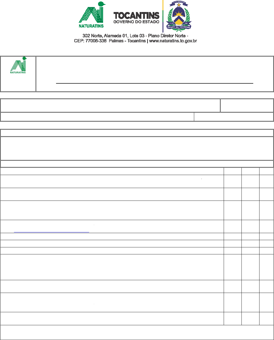 PARECER DE PROPOSTA DE SOLUÇÃO DE CONFLITO Empresa: Referências Técnicas: DESCRIÇÃO/OBSERVAÇÕES SOBRE O CÓDIGO 1) CÓDIGO 401 - Para casos onde o Cadastro Ambiental Rural está com status conflito e não foi possível uma resolução amistosa entre as partes envolvidas. 2) A resolução do Conflito, através do cancelamento de registro do Georreferenciamento certificado pelo INCRA e PERÍMETRO contido na base do SIGEF. ITENS � a)Requerimento Padrão com o código 401 e assinado pelo empreendedor ou procurador e dados do responsável técnico; � b)Procuração pública ou particular com firma reconhecida, se o requerimento não for assinado pelo empreendedor; � c)Ofício ou Nota Técnica contendo os dados do proprietário; dados do imóvel rural possuidor; solicitação do cancelamento e respectivo nº do SIG pertinentes, justificando a solicitação � d)Recibo de inscrição do imóvel rural no C (http://site.sigcar.com.br/tocantins/); � e)CPF e RG (Pessoa Física); � f)Contrato Social, CNPJ e Inscrição Estadual, (Em caso de Pessoa Jurídica) � g)Decisão Judicial (Se for o caso); � h)Certidão de Inteiro Teor atualizada.(Preferencialmente com averbação do georreferenciamento em sua forma original ou cópia autenticada em cartório ou Memorial Descritivo (com número de matrícula) certificado pelo não esteja registrado na Certidão de Inteiro Teor; � i)Plotagem do perímetro da área titulada com descrição das coordenadas, azimutes e distâncias, emitido pelo ITERTINS, caso não haja o georreferenciamento do imóvel; � j)Arquivos digitais e/ou mapas(mapa mosaico com descrição do perímetro de cada matriculas que compõe a propriedade) que ajudem a subsidiar a análise ( por várias matriculas). � k)Comprovante de pagamento do Documento de DARE); Observações: ______,____/____/_____ ______________________________ CHECK LIST – PRÉ ANÁLISE PARECER DE PROPOSTA DE SOLUÇÃO DE CONFLITO Porte: DESCRIÇÃO/OBSERVAÇÕES SOBRE O CÓDIGO Para casos onde o Cadastro Ambiental Rural está com status conflito e não foi possível uma resolução 2) A resolução do Conflito, através do cancelamento de cadastros, só será possível mediante apresentação de Matricula com registro do Georreferenciamento certificado pelo INCRA e PERÍMETRO contido na base do SIGEF. Documentação Solicitada código 401 (modelo NATURATINS), devidamente preenchido e assinado pelo empreendedor ou procurador e dados do responsável técnico; b)Procuração pública ou particular com firma reconhecida, se o requerimento não for assinado Nota Técnica contendo os dados do proprietário; dados do imóvel rural possuidor; solicitação do cancelamento e respectivo nº do SIG-CAR em conflito; e outras informações d)Recibo de inscrição do imóvel rural no Cadastro Ambiental Rural - SIG-CAR/Tocantins f)Contrato Social, CNPJ e Inscrição Estadual, (Em caso de Pessoa Jurídica) h)Certidão de Inteiro Teor atualizada.(Preferencialmente com averbação do georreferenciamento em sua forma original ou cópia autenticada em cartório ou Memorial Descritivo (com número de matrícula) certificado pelo SIGEF, caso o georreferenciamento não esteja registrado na Certidão de Inteiro Teor; i)Plotagem do perímetro da área titulada com descrição das coordenadas, azimutes e distâncias, emitido pelo ITERTINS, caso não haja o georreferenciamento do imóvel; j)Arquivos digitais e/ou mapas(mapa mosaico com descrição do perímetro de cada matriculas que compõe a propriedade) que ajudem a subsidiar a análise (para propriedades compostas k)Comprovante de pagamento do Documento de Arrecadação de Receitas Estaduais ______,____/____/_____ ______________________________ Carimbo/ Assinatura PARECER DE PROPOSTA DE SOLUÇÃO DE CONFLITO - SCCAR - 401 N° do Processo: Porte: Para casos onde o Cadastro Ambiental Rural está com status conflito e não foi possível uma resolução cadastros, só será possível mediante apresentação de Matricula com registro do Georreferenciamento certificado pelo INCRA e PERÍMETRO contido na base do SIGEF. SIM NÃO NA (modelo NATURATINS), devidamente preenchido b)Procuração pública ou particular com firma reconhecida, se o requerimento não for assinado Nota Técnica contendo os dados do proprietário; dados do imóvel rural possuidor; CAR em conflito; e outras informações CAR/Tocantins h)Certidão de Inteiro Teor atualizada.(Preferencialmente com averbação do georreferenciamento em sua forma original ou cópia autenticada em cartório ou Memorial SIGEF, caso o georreferenciamento i)Plotagem do perímetro da área titulada com descrição das coordenadas, azimutes e j)Arquivos digitais e/ou mapas(mapa mosaico com descrição do perímetro de cada matriculas para propriedades compostas Arrecadação de Receitas Estaduais – ______,____/____/_____ ______________________________