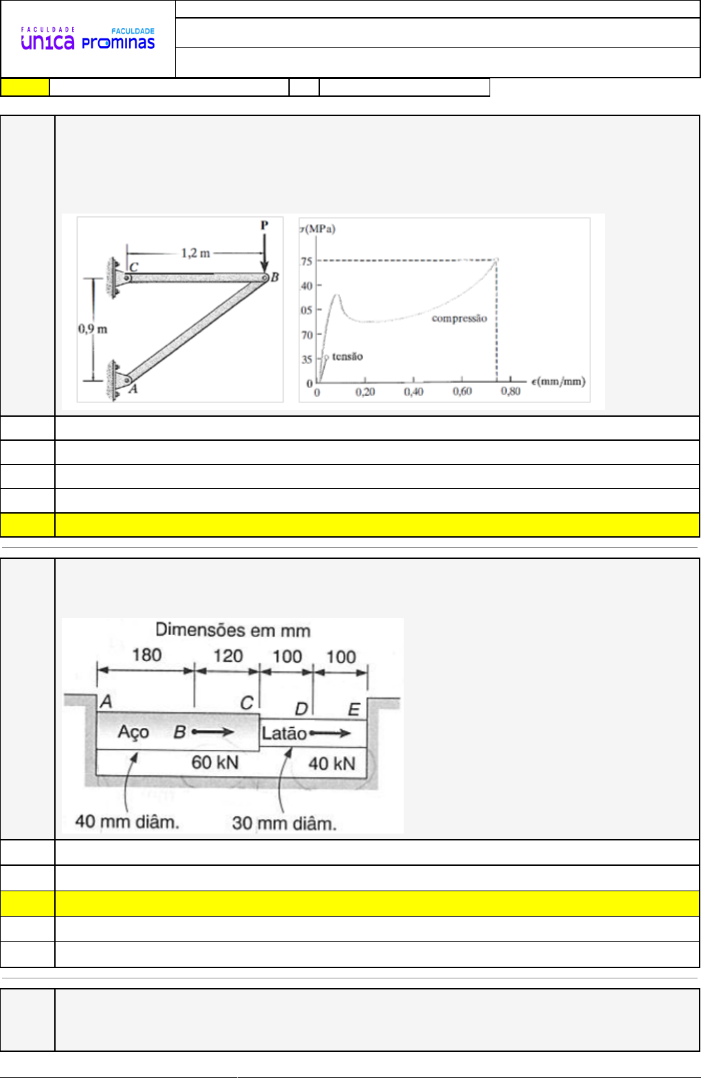 14/08/2024 11:28:16 1/4 REVISÃO DE SIMULADO Nome: ELIAS MAKHOUL Disciplina: Mecânica dos Sólidos I Respostas corretas são marcadas em amarelo X Respostas marcardas por você. Questão 001 (Adaptada de Hibbeler, 2010). A figura mostra o diagrama tensão-deformação de formação para duas Barras de poliestireno. Se a área da seção transversal da barra AB for 950 mm² e a de BC for 2500 mm² determine a maior força P que pode ser suportada antes que qualquer dos elementos sofra ruptura. Considere que não ocorre nenhuma flambagem. A) P=5,427 kN B) P=54,27 kN C) P=656,3 kN D) P=122,38 kN X E) P=65,63 kN Questão 002 (Adaptada de BEER, 1995). Duas Barras cilíndricas, uma de aço é igual (E=200 GPa) e outra de latão (E=105 GPa), são ligadas em C, e engastadas em A e E. Para o carregamento indicado, determinar as Reações em A e B, e a deflexão do ponto C. A) RA=62,8 kN (→); RE=37,2 kN (→); δC=56,7 mm B) RA=125,6 kN (←); RE=74,4 kN (←); δC=46,3 μm X C) RA=62,8 kN (←); RE=37,2 kN (←); δC=46,3 μm D) RA=125,6 kN (→); RE=74,4 kN (→); δC=46,3 mm E) RA=55,7 kN (←); RE=29,kN (←); δC=46,3 μm Questão 003 Por meio dos ensaios de tração, tem-se o gráfico tensão-deformação em corpos de prova analisados em laboratórios. Além disso, quais características é possível indicar por meio de um ensaio de tração? 14/08/2024 11:28:16 2/4 A) Resistência à absorção e à retenção de água. X B) Resistência à torção do corpo de prova. C) Flambagem do material. D) Resistência ao cisalhamento da peça. E) Regiões de comportamento elástico e plástico. Questão 004 (Adaptada de BEER, 1995). O corpo de prova de alumínio mostrado é submetido a duas forças centradas e axiais e opostas, de intensidade P. Pede-se: a) sabendo-se que E=70 GPa e σadm=200 MPa, determinar o máximo valor admissível de P e correspondente alongamento para amostra total; b) resolver o ítem a, considerando que o corpo de prova foi substituído por uma barra de alumínio de mesmo comprimento, mas de seção transversal retangular uniforme de 60 x 15 mm. X A) (a) P=97,3 kN; δ=0,834 mm (b) P=180 kN; δ=1,714 mm B) (a) P=291,9 kN; δ=8,34 mm (b) P=180 kN; δ=3,428 mm C) (a) P=9,73 kN; δ=8,34 mm (b) P=18,0 kN; δ=17,14 mm D) (a) P=3,26 MN; δ=8,34 mm (b) P=180 kN; δ=3,428 mm E) (a) P=194,6 kN; δ=1,668 mm (b) P=360 kN; δ=3,428 mm Questão 005 Duas barras cilíndricas de seção transversal cheia AB e BC são soldadas uma à outra em B e submetidas a um carregamento. Determine a intensidade da força P para a qual a tensão normal de tração na barra AB é duas vezes a intensidade de tensão de compressão da barra BC. Autor (2019) A) P=1058 kN X B) P=58,83 kN 14/08/2024 11:28:16 3/4 C) P=158,83 kN D) P=358,3 kN E) P=8,83 kN Questão 006 Tensão é uma medida da pressão interna sobre um objeto, definida matematicamente como força / área. Portanto, o aumento da tensão é proporcional ao aumento da carga e inversamente proporcional ao aumento da área da secção. Sabendo disso, observe onde a barra de 100mm com área igual a 50mm2, carregada com carga de 100N, resulta em tensão de 2N/mm2 e responda: qual seria a tensão se a área da secção fosse igual a 125mm2? A) 4,8N/mm2 B) 0,8N/mm2 C) 1,8N/mm2 X D) 2,8N/mm2 E) 3,8N/mm2 Questão 007 O elemento AC está submetido a uma força vertical de 3 kN. Determine a posição x dessa força de modo que a tensão de compressão média no apoio C seja igual à tensão de tração média na barra AB. Considere a área da seção transversal da barra AB igual a 400 mm² e a área do apoio C igual a 650mm². Autor (2019) X A) x = 24 mm B) x = 144 mm C) x = 124 mm D) x = 154 mm E) x = 12 mm 14/08/2024 11:28:16 4/4 Questão 008 (Adaptada de Hibbeler, 2010). O tampão tem diâmetro de 30 mm e ajusta-se ao interior de uma luva rígida com diâmetro interno de 32 mm. Ambos, tampão e luva, têm 50 mm de comprimento. Determine a pressão axial p que deve ser aplicada à parte superior do tampão para que ele entre em contato com as laterais da luva. Determine também a que distância o tampão deve ser comprimido para baixo para que isso aconteça. O material do tampão tem E = 5 MPa e v=0,45. A) p=826 Pa,δ=2,36 mm B) p=327 kPa,δ=74,1 mm C) p=901 Pa,δ=2,36 mm X D) p=741 kPa,δ=7,41 mm E) p=652 kPa,δ=0,741 mm