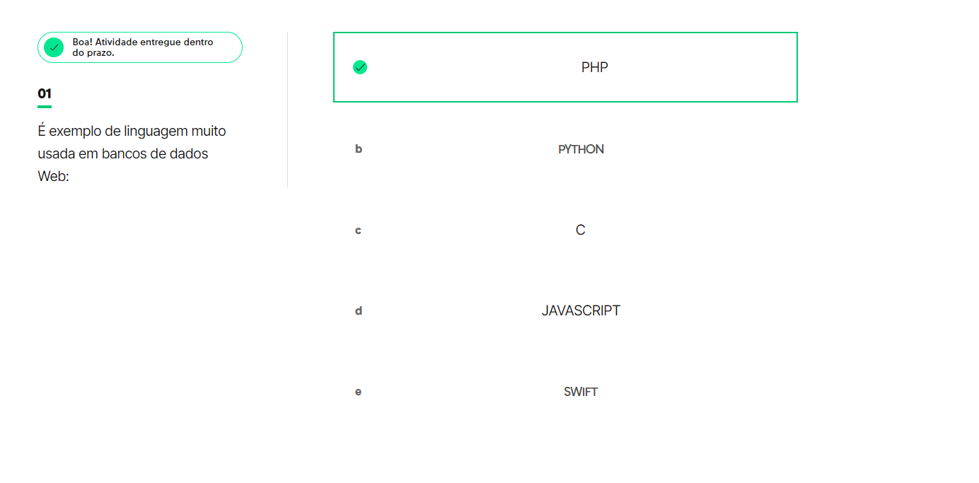 Boa! Atividade entregue dentro do prazo. PHP 01 É exemplo de linguagem muito usada em bancos de dados b PYTHON Web: c C d JAVASCRIPT e SWIFT
