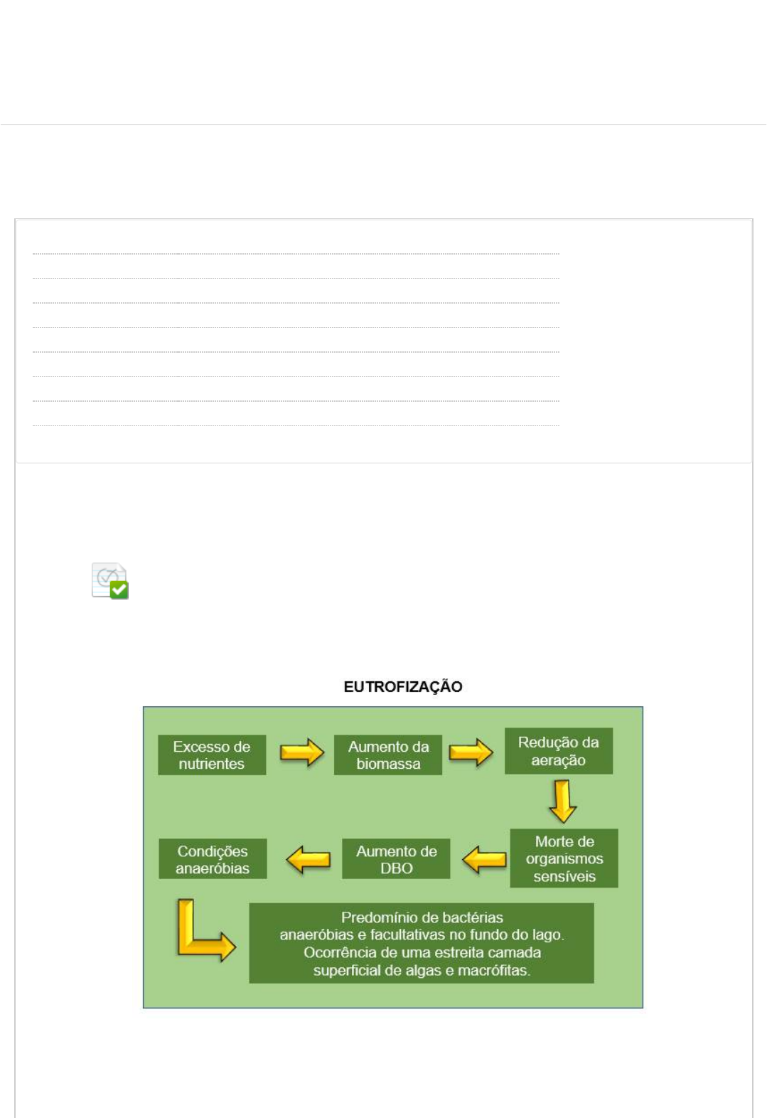 Revisar envio do teste: QUESTIONÁRIO UNIDADE I EST AMB E SANEAMENTO URBANO D489_12201_R_20242 CONTEÚDO Usuário STEFANI FELIX MARQUES Curso EST AMB E SANEAMENTO URBANO Teste QUESTIONÁRIO UNIDADE I Iniciado 14/08/24 15:21 Enviado 14/08/24 15:23 Status Completada Resultado da tentativa 4,5 em 5 pontos Tempo decorrido 1 minuto Resultados exibidos Respostas enviadas, Perguntas respondidas incorretamente Pergunta 1 A eutro�zação é um fenômeno indesejável que ocorre principalmente em lagos, represas e açudes; causado pelo acúmulo de nutrientes como nitrogênio e fósforo, encontrados em abundância nas fezes de homens e animais. A água enriquecida faz com que proliferem bactérias, plâncton e algas; muitos deles tóxicos que, ao morrerem, causam gosto e odores desagradáveis, além de consumirem oxigênio dissolvido e matarem peixes. Causas: (I) Erosão. O solo agrícola contém naturalmente ou proveniente de adubação o nitrogênio e o fósforo, principais responsáveis pelo enriquecimento da água e a consequente eutro�zação. (II) Poluição. A eutro�zação está geralmente associada à ocupação da área de UNIP BIBLIOTECAS MURAL DO ALUNOCONTEÚDOS ACADÊMICOS 0,5 em 0,5 pontos 14/08/2024, 15:23 Revisar envio do teste: QUESTIONÁRIO UNIDADE I – EST AMB... https://ava.ead.unip.br/webapps/assessment/review/review.jsp?attempt_id=_106329451_1&course_id=_357782_1&content_id=_4076618_1&retu… 1/6 http://company.blackboard.com/ https://ava.ead.unip.br/webapps/blackboard/execute/courseMain?course_id=_357782_1 https://ava.ead.unip.br/webapps/blackboard/content/listContent.jsp?course_id=_357782_1&content_id=_4054247_1&mode=reset https://ava.ead.unip.br/webapps/portal/execute/tabs/tabAction?tab_tab_group_id=_49_1 https://ava.ead.unip.br/webapps/portal/execute/tabs/tabAction?tab_tab_group_id=_27_1 https://ava.ead.unip.br/webapps/portal/execute/tabs/tabAction?tab_tab_group_id=_47_1 https://ava.ead.unip.br/webapps/portal/execute/tabs/tabAction?tab_tab_group_id=_25_1 https://ava.ead.unip.br/webapps/login/?action=logout Resposta Selecionada: d. drenagem da bacia do açude, seja pelo desmatamento, pela urbanização, pela agropecuária ou pela indústria. O desmatamento provoca a erosão do solo; a urbanização, a contribuição das fezes dos moradores; a indústria, com seus e�uentes; e a agropecuária, com as fezes do gado bovino, suíno e de aves, além da ração utilizada nas gaiolas ou redes submersas onde são criados os peixes. (III) Morfologia. O lago, com a transparência de suas águas e com suas características morfológicas, também colabora ou não com o processo de eutro�zação. Fenômenos que podem afetar a transparência estão relacionados à presença de sedimentos (erosão ou enxurrada), proliferação de microrganismos (bactérias e algas) e, em menor escala, à cor da água. Entre os aspectos morfológicos, merecem destaque: área, volume, profundidade (máxima, média e relativa), fator de envolvimento (relação entre a área da bacia e a do espelho d´água), desenvolvimento do perímetro (relação entre o perímetro do lago e o de um círculo de mesma área do espelho) e tempo de retenção hidráulico, entre outros. Profundidade média é a relação do volume pela área do açude. Profundidade relativa é a razão da profundidade máxima do açude (Zm) e o diâmetro médio do lago na superfície, em porcentagem. Por sua vez, diâmetro médio é a relação entre a área do espelho d ´água e o comprimento máximo do lago. I, II e III são verdadeiras. Pergunta 2 “A parte interna dos veículos com os vidros fechados se aquece muito rapidamente pois o sol emite radiações em todos os comprimentos de onda, mas a maior parte está dentro da faixa da luz visível (de 380 a 750 nm), que passa pelo vidro para dentro do carro. Grande parte dessa energia é absorvida pelos materiais no interior do carro e outra parte é re�etida. A energia re�etida é a radiação infravermelha (de 4 a 40 µm), e como ela possui um grande comprimento de onda não atravessa o vidro, �cando aprisionada dentro do carro. O armazenamento da energia provoca um aumento na temperatura interna do veículo, pois nem toda a energia que entrou vai sair. Analogamente, podemos pensar no efeito estufa global. Gases como o gás carbônico (CO 2), o metano (CH 4) e o vapor d'água (H 2O) funcionam como uma cortina de gás que vai da superfície da Terra em direção ao espaço, impedindo que a energia do sol absorvida pela Terra durante o dia seja emitida de volta para o espaço. Sendo assim, parte do calor �ca ‘aprisionado’ próximo da Terra (onde o ar é mais denso), o que faz com que a temperatura média do nosso planeta seja em torno de 15 °C. A esse fenômeno de aquecimento da Terra dá-se o nome de efeito estufa. Se não existisse o efeito estufa, a temperatura média na Terra seria em torno de -15 °C e não existiria água na forma líquida, nem vida.” Fonte: http://www.usp.br/qambiental/tefeitoestufa.htm Indique a alternativa falsa. (I) Efeito estufa se trata de um fenômeno natural e fundamental para a vida na Terra. Consiste também na retenção de calor irradiado pela superfície terrestre, pelas partículas de gases e de água em suspensão na atmosfera, garante a manutenção do equilíbrio térmico do planeta e, portanto, a sobrevivência das várias espécies vegetais e animais. (II) O efeito estufa resulta, se natural, de um equilíbrio na composição atmosférica, provocado pela crescente elevação da concentração de certos gases que têm capacidade de absorver calor, como é o caso do metano, dos cloro�uorcarbonos, 0,5 em 0,5 pontos 14/08/2024, 15:23 Revisar envio do teste: QUESTIONÁRIO UNIDADE I – EST AMB... https://ava.ead.unip.br/webapps/assessment/review/review.jsp?attempt_id=_106329451_1&course_id=_357782_1&content_id=_4076618_1&retu… 2/6 http://www.usp.br/qambiental/tefeitoestufa.htm Resposta Selecionada: a. mas principalmente do di