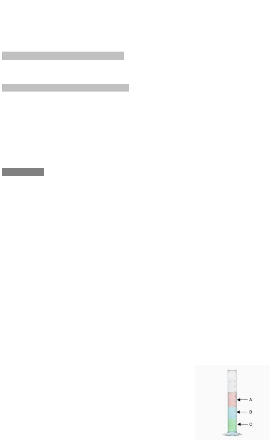 Exercícios sobre densidade – 9º ano 1. Na tabela abaixo temos as densidades de alguns materiais sólidos. Se eles forem adicionados à água líquida e pura, à temperatura ambiente, qual deles flutuará? Pau-brasil .............................. 0,4 g/cm3 Alumínio ................................ 2,70 g/cm3 Diamante .................................3,5 g/cm3 Chumbo...................................11,3 g/cm3 Carvão ..................................... 0,5 g/cm3 Mercúrio .................................13,6 g/cm3 Água ......................................... 1,0 g/cm3 2. Um vidro contém 200 cm3 de mercúrio de densidade 13,6 g/cm3. A massa de mercúrio contido no vidro é: a) 0,8 kg b) 0,68 kg c) 2,72 kg d) 27,2 kg e) 6,8 kg 3. Uma escultura em bronze tem 3,5 Kg de massa e ocupa um volume de 400Cm3. Qual é a densidade da escultura? 4. Um bloco maciço de madeira tem 16Kg de massa e ocupa um volume de 0,035 m3. Qual é a densidade desse bloco? 5. Três líquidos (água, benzeno e clorofórmio) foram colocados numa proveta, originando o seguinte aspecto: A seguir temos uma tabela com as densidades de cada líquido. Baseando-se nessas informações e em seus conhecimentos sobre densidade, relacione as substâncias A, B e C com as mencionadas na tabela. Justifique sua resposta. 6. Calcule o valor da massa de um objeto constituído de ouro maciço cuja densidade é igual a 20 g/cm3 e volume igual a 25 cm3. a) 5 g b) 45 g c) 85 g d) 300 g e) 500 g 7. Qual a densidade de um material que apresenta um volume de 200 mL e massa de 896 g? a) 3,26 g/mL b) 9,94 g/mL c) 4,48 g/mL d) 6,59 g/mL 8. Qual a densidade em g/cm3 de uma solução de volume igual a 5 L e massa de 4000 g: a) 0,08 b) 0,8 c) 8 d) 80 e) 800 9. Para identificar três líquidos – de densidades 0,8,1,0 e 1,2 – o analista dispõe de uma pequena bola de densidade 1,0. Conforme as posições das bolas apresentadas no desenho a seguir, podemos afirmar que a densidade de cada líquido seja: image1.jpeg image2.jpeg image3.jpeg