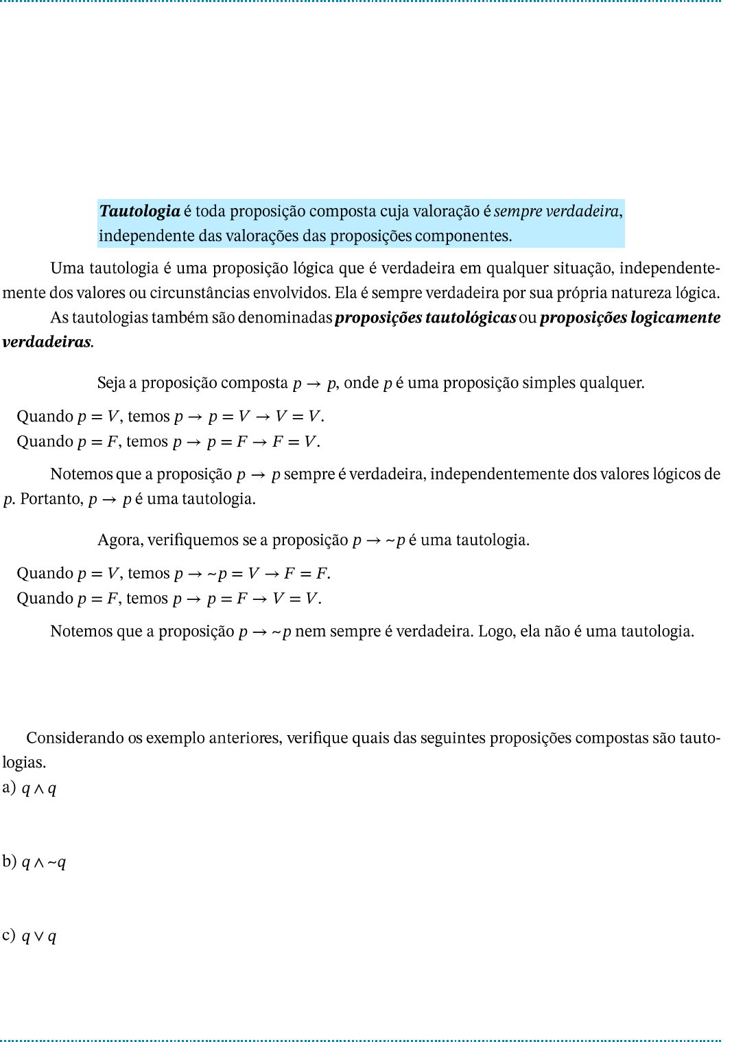 Prof. Eduardo L. M. Moura Raciocínio Lógico para o Concurso do Detran/AC 2024 - p. 64 Aula 6 | Tautologia, contradição e contingência ▼ Tautologia Exemplo 54 ● ● Exemplo 55 ● ● Exercícios 13. Prof. Eduardo L. M. Moura Raciocínio Lógico para o Concurso do Detran/AC 2024 - p. 65 Como saber se uma proposição composta é uma tautologia? Método 1 – Tabela-verdade Exemplo 56 Prof. Eduardo L. M. Moura Raciocínio Lógico para o Concurso do Detran/AC 2024 - p. 66 Exercício de Aprendizagem 14. Método 2 – Redução ao absurdo O método da redução ao absurdo é uma ferramenta poderosa para provar que uma propo- sição é uma tautologia, mas nem sempre é o método mais prático ou eficiente. Para proposições menos complexas, tabelas-verdades podem ser mais fáceis e intuitivas. Exemplo 57 Prof. Eduardo L. M. Moura Raciocínio Lógico para o Concurso do Detran/AC 2024 - p. 67 Exemplo 58 𝑷 Prof. Eduardo L. M. Moura Raciocínio Lógico para o Concurso do Detran/AC 2024 - p. 68 Exercícios 15. Prof. Eduardo L. M. Moura Raciocínio Lógico para o Concurso do Detran/AC 2024 - p. 69 ▼ Contradição Exemplo 59 Como saber se uma proposição composta é uma contradição? Método 1 – Tabela-verdade Exemplo 60 Prof. Eduardo L. M. Moura Raciocínio Lógico para o Concurso do Detran/AC 2024 - p. 70 Exercício de Aprendizagem 16. Método 2 – Redução ao absurdo Exemplo 61 Prof. Eduardo L. M. Moura Raciocínio Lógico para o Concurso do Detran/AC 2024 - p. 71 Exercícios 17. Prof. Eduardo L. M. Moura Raciocínio Lógico para o Concurso do Detran/AC 2024 - p. 72 ▼ Contingência Exemplo 62 Exemplo 63 Como saber se uma proposição composta é uma contingência? Exemplo 64 Prof. Eduardo L. M. Moura Raciocínio Lógico para o Concurso do Detran/AC 2024 - p. 73 Questões de Aprendizagem Questão 121 – Fumarc - 2023 Questão 122 - QUADRIX - 2023 - Adaptada Questão 123 - ACCESS - 2022 Questão 124 – Fundatec - 2023 Questão 125 – Funatec - 2024 Questão 126 – Instituto Consulplan - 2024 Questão 127 – Cebraspe - 2023 Questão 128 – Fepese - 2023 Prof. Eduardo L. M. Moura Raciocínio Lógico para o Concurso do Detran/AC 2024 - p. 74 Questão 129 – IBADE - 2023 Questão 130 – CEFET/MG – 2023 Questão 131 – UFRR - 2023 Questão 132 – Cebraspe - 2024 Questão 133 - CESGRANRIO - 2005 Questão 134 - FCC - 2006 Questão 135 – Legalle Concursos - 2023 Prof. Eduardo L. M. Moura Raciocínio Lógico para o Concurso do Detran/AC 2024 - p. 75 Questão 136 – FURG - 2022 Questão 137 – IDECAN - 2024 Questão 138 – Vunesp - 2023 Questão 139 - Copeve/UFAL - 2023 Questão 140 – Copeve/UFAL - 2023 ∧ ∨ Respostas 121. 122. 123. 124. 125. 126. 127. 128. 129. 130. 131. 132. 133. 134. 135. 136. 137. 138. 139. 140. Prof. Eduardo L. M. Moura Raciocínio Lógico para o Concurso do Detran/AC 2024 - p. 76 Questões da Banca Questão 67 - Instituto AOCP - 2022 Questão 68 - Instituto AOCP - 2022 ● ● ● Questão 69 - Instituto AOCP - 2019 Questão 70 - Instituto AOCP - 2022 Questão 71 - Instituto AOCP - 2019 Questão 72 - Instituto AOCP - 2017 Questão 73 - Instituto AOCP - 2017 Prof. Eduardo L. M. Moura Raciocínio Lógico para o Concurso do Detran/AC 2024 - p. 77 Questão 74 - Instituto AOCP - 2017 Respostas 67. 68. 69. 70. 71. 72. 73. 74. Aula 6 | Tautologia, contradição e contingência ▼ Tautologia ⚒ Exercícios Como saber se uma proposição composta é uma tautologia? Método 1 – Tabela-verdade ⚒ Exercício de Aprendizagem Método 2 – Redução ao absurdo ⚒ Exercícios ▼ Contradição Como saber se uma proposição composta é uma contradição? Método 1 – Tabela-verdade ⚒ Exercício de Aprendizagem Método 2 – Redução ao absurdo ⚒ Exercícios ▼ Contingência Como saber se uma proposição composta é uma contingência? ✍ Questões de Aprendizagem ✒ Questões da Banca