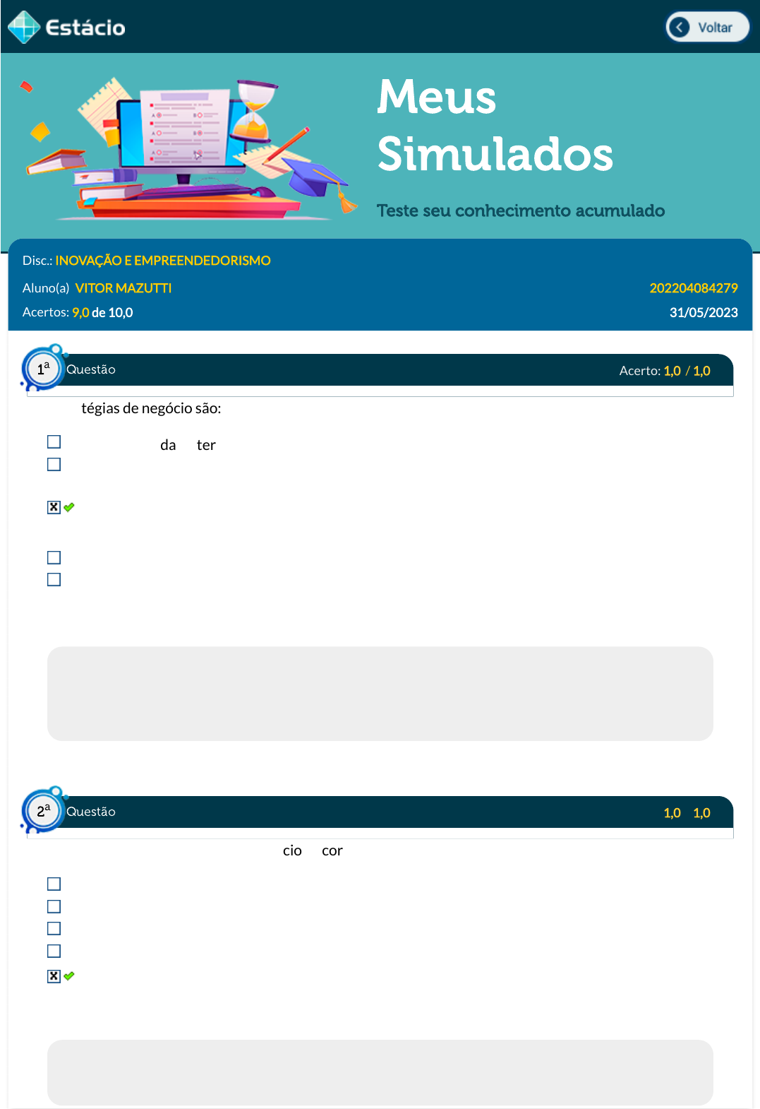 31/05/2023, 11:58 Estácio: Alunos https://simulado.estacio.br/bdq_simulados_avaliacao_parcial_resultado.asp?cod_hist_prova=310181693&cod_prova=6381720325&f_cod_disc= 1/5 Meus Simulados Teste seu conhecimento acumulado Disc.: INOVAÇÃO E EMPREENDEDORISMO Aluno(a): VITOR MAZUTTI 202204084279 Acertos: 9,0 de 10,0 31/05/2023 Acerto: 1,0 / 1,0 Estratégias de negócio são: Nenhuma das alternativas Ferramentas de gestão que só funcionam em contextos de grande escala em corporações multinacionais. Exercícios e técnicas de re�exão e de organização que facilitam a administração de um negócio. Treinamentos que focam em desenvolver as capacidades psicológicas do empreendedor. Mecanismos que ajudam a cobrança de dívidas por parte de instituições �nanceiras. Respondido em 31/05/2023 11:46:37 Explicação: A resposta correta é: Exercícios e técnicas de re�exão e de organização que facilitam a administração de um negócio. Acerto: 1,0 / 1,0 Sobre a construção do plano de negócios é correto a�rmar que: Nenhuma das opções O documento deve ter no máximo 5 páginas no total. Não é valorizada pelas instituições �nanceiras e agências de fomento. O sumário executivo é insu�ciente para transmitir a essência da empresa. A educação empreendedora fornece uma estrutura mínima do documento. Respondido em 31/05/2023 11:42:02 Explicação: A resposta correta é: A educação empreendedora fornece uma estrutura mínima do documento. Questão1 a Questão2 a https://simulado.estacio.br/alunos/inicio.asp javascript:voltar(); 31/05/2023, 11:58 Estácio: Alunos https://simulado.estacio.br/bdq_simulados_avaliacao_parcial_resultado.asp?cod_hist_prova=310181693&cod_prova=6381720325&f_cod_disc= 2/5 Acerto: 1,0 / 1,0 Sobre a experiência dos empreendedores no Brasil, é correto a�rmar que: O esforço de planejamento melhora as possibilidades de sobrevivência de uma empresa, mas não é uma fórmula de sucesso. As condições do mercado em relação aos clientes e à concorrência são os principais fatores que in�uenciam o sucesso de uma empresa. Sem o peso do governo e dos impostos, grande parte das empresas teriam sucesso. Nenhuma das opções anteriores Uma ideia brilhante é o determinante principal do desempenho do empreendimento. Respondido em 31/05/2023 11:42:14 Explicação: A resposta correta é: O esforço de planejamento melhora as possibilidades de sobrevivência de uma empresa, mas não é uma fórmula de sucesso. Acerto: 1,0 / 1,0 Sobre o processo de inovação é correto a�rmar que: A fase de seleção está restrita às áreas de competência e expertise da organização. Uma característica marcante da etapa de implementação é um vai-e-vem de identi�cação e resolução de problemas. Os problemas são resolvidos antes da fase de implementação. A fase de busca só trabalha com poucas possibilidades de desenvolvimento de inovação. A fase de seleção está concentrada em colher os frutos �nanceiros da inovação implementada. Respondido em 31/05/2023 11:49:59 Explicação: A resposta correta é: Uma característica marcante da etapa de implementação é um vai-e-vem de identi�cação e resolução de problemas. Acerto: 1,0 / 1,0 Qual a principal função das patentes? Impedir o acesso a inovações cientí�cas. Captar recursos para o governo através de impostos. Proteger o direito de expropriação de segredos industriais. Proteger os direitos de criação de trabalhos cientí�cos, industriais, artísticos e literários. Dar titulação aos conhecimentos dos pro�ssionais de uma empresa. Respondido em 31/05/2023 11:43:06 Questão3 a Questão4 a Questão5 a 31/05/2023, 11:58 Estácio: Alunos https://simulado.estacio.br/bdq_simulados_avaliacao_parcial_resultado.asp?cod_hist_prova=310181693&cod_prova=6381720325&f_cod_disc= 3/5 Explicação: A resposta correta é: Proteger os direitos de criação de trabalhos cientí�cos, industriais, artísticos e literários. Acerto: 0,0 / 1,0 O processo de inovação envolve quatro etapas que devem ser gerenciadas para melhores resultados. Sobre esse tema, assinale a alternativa que corresponde à etapa de busca. Fase em que a empresa consegue um melhor posicionamento no seu mercado de atuação e/ou um aumento da rentabilidade. Fase em que a empresa colhe os frutos da inovação. Fase em que ocorre a escolha de quais ideias irão seguir a diante. É a primeira fase da inovação e envolve a identi�cação de oportunidades de mudança. Fase em que a ideia é desenvolvida e deve envolver o usuário o mais cedo possível. Respondido em 31/05/2023 11:43:25 Explicação: Busca - A primeira fase de uma inovação envolve a identi�cação de oportunidades de mudança, observando os sinais e fazendo novas conexões. Trata-se do momento de gerar ideias e propor soluções. Podemos pensar, por exemplo, no modelo de reunião de tempestade de ideias (o chamado brainstorming), fase que lida com o maior número de informações e de possibilidades de atuação. Acerto: 1,0 / 1,0 Quais das alternativas, abaixo, é um exemplo de critérios de separação e agrupamento de clientes? A parcimônia é a divisão de consumidores tem como parâmetro as atitudes, os usos ou as respostas dos clientes em relação a determinado produto ou serviço. A parcimônia leva em consideração segmentos de clientes de acordo com sua percepção de classe social, estilo de vida ou características de personalidade. A mensuração é a estratégia de mercado de uma empresa que precisa se limitar a um único critério de divisão e agrupamento de clientes. A substância refere-se à análise do potencial econômico de um segmento de mercado. A acessibilidade é a capacidade de acessar clientes com necessidades especiais. Respondido em 31/05/2023 11:43:55 Explicação: A resposta correta é: A substância refere-se à análise do potencial econômico de um segmento de mercado. Acerto: 1,0 / 1,0 Questão6 a Questão7 a Questã