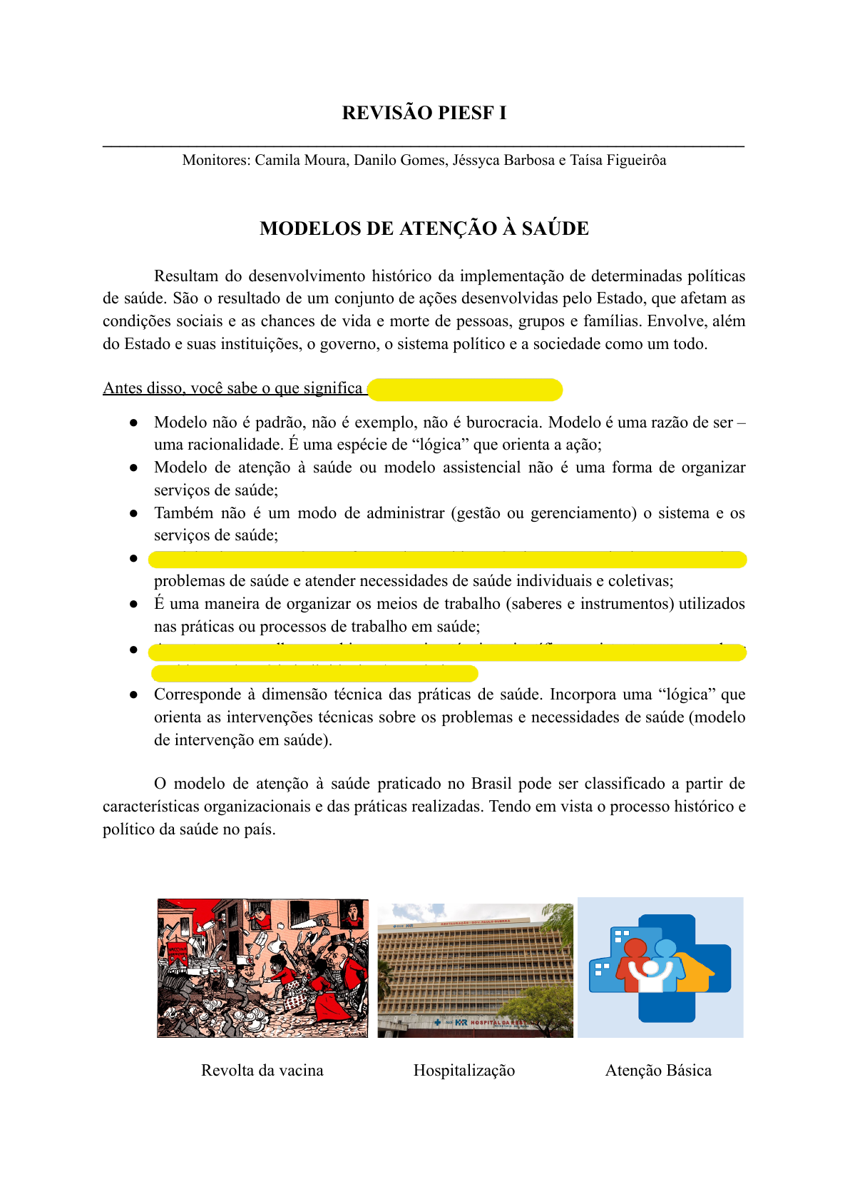 REVISÃO PIESF I ___________________________________________________________________________ Monitores: Camila Moura, Danilo Gomes, Jéssyca Barbosa e Taísa Figueirôa MODELOS DE ATENÇÃO À SAÚDE Resultam do desenvolvimento histórico da implementação de determinadas políticas de saúde. São o resultado de um conjunto de ações desenvolvidas pelo Estado, que afetam as condições sociais e as chances de vida e morte de pessoas, grupos e famílias. Envolve, além do Estado e suas instituições, o governo, o sistema político e a sociedade como um todo. Antes disso, você sabe o que significa modelo de atenção à saúde? ● Modelo não é padrão, não é exemplo, não é burocracia. Modelo é uma razão de ser – uma racionalidade. É uma espécie de “lógica” que orienta a ação; ● Modelo de atenção à saúde ou modelo assistencial não é uma forma de organizar serviços de saúde; ● Também não é um modo de administrar (gestão ou gerenciamento) o sistema e os serviços de saúde; ● Modelo de atenção é uma forma de combinar técnicas e tecnologias para resolver problemas de saúde e atender necessidades de saúde individuais e coletivas; ● É uma maneira de organizar os meios de trabalho (saberes e instrumentos) utilizados nas práticas ou processos de trabalho em saúde; ● Aponta como melhor combinar os meios técnico-científicos existentes para resolver problemas de saúde individuais e/ou coletivos; ● Corresponde à dimensão técnica das práticas de saúde. Incorpora uma “lógica” que orienta as intervenções técnicas sobre os problemas e necessidades de saúde (modelo de intervenção em saúde). O modelo de atenção à saúde praticado no Brasil pode ser classificado a partir de características organizacionais e das práticas realizadas. Tendo em vista o processo histórico e político da saúde no país. Revolta da vacina Hospitalização Atenção Básica É importante destacar que os modelos apresentados anteriormente são formas de organização do sistema em diferentes períodos históricos no Brasil. Atualmente, apesar do modelo preconizado ser a Atenção Básica em Saúde, os demais modelos ainda estão presentes em formas de organização de programas e nas práticas de atenção à saúde. Ex: campanhas de vacinação. Modelo APS (Atenção Primária à saúde) Apesar dos modelos de atenção terem um mesmo objetivo: melhorar as condições de saúde dos indivíduos e populações, os sistemas de saúde estão mais relacionados ao Estado e à política de saúde definida por este, enquanto os modelos de atenção à saúde se relacionam à lógica, à técnica e às formas de melhorar essas condições de saúde. Para entender o sistema de saúde nacional e a organização da saúde em seu próprio território, devemos reconhecer as características dos principais modelos de APS. A Política Nacional de Atenção Básica (PNAB) possui uma observação de que atenção primária à saúde e atenção básica à saúde (ABS) têm o mesmo significado. Essa diferenciação, porém, divide opiniões. Internacionalmente, tem-se apresentado “atenção primária à saúde” como uma estratégia de organização da atenção à saúde voltada para responder de forma regionalizada, contínua e sistematizada à maior parte das necessidades de saúde de uma população, integrando ações preventivas e curativas, bem como a atenção a indivíduos e comunidades. Esse enunciado procura sintetizar as diversas concepções e denominações das propostas e experiências que se convencionaram chamar internacionalmente de APS. No Brasil, a APS incorpora os princípios da Reforma Sanitária, levando o SUS a adotar a designação “atenção básica à saúde” para enfatizar a reorientação do modelo assistencial, tornando-se o contato prioritário da população com o sistema de saúde. A concepção de Atenção Básica à Saúde desenvolveu-se a partir dos princípios do SUS, com ênfase principalmente na universalidade, na descentralização, na integralidade e na participação popular, como pode ser visto na portaria que institui a PNAB. 1º acesso - Porta de entrada do sistema de saúde, exerce papel de filtro para acesso aos outros níveis; Longitudinalidade - Responsabilidade longitudinal pelo paciente com continuidade da relação equipe-paciente ao longo da vida; Integralidade - Considerando-se âmbitos físico, psíquico e social da saúde dentro dos limites de atuação da saúde; Coordenação do cuidado - Coordenação das diversas ações e serviços indispensáveis para resolver necessidades menos frequentes e mais complexas, capacidade de garantir a continuidade da atenção (atenção ininterrupta) no interior da rede de serviços. DETERMINANTES SOCIAIS EM SAÚDE Esquema dahlgren e whitehead “Os DSS são determinantes estruturais e condições da vida cotidiana responsáveis pela maior parte das iniquidades em saúde entre os países e internamente. Eles incluem a distribuição de poder, renda, bens e serviços e as condições de vida das pessoas, e o seu acesso ao cuidado à saúde, escolas e educação; suas condições de trabalho e lazer; e o estado de sua moradia e ambiente”. De acordo com definição da Organização Mundial de Saúde (OMS), os determinantes sociais da saúde estão relacionados às condições em que uma pessoa vive e trabalha. Também podem ser considerados os fatores sociais, econômicos, culturais, étnicos/raciais, psicológicos e comportamentais que influenciam a ocorrência de problemas de saúde e fatores de risco à população, tais como moradia, alimentação, escolaridade, renda e emprego. O esquema de Dahlgren e Whitehead apresenta os diferentes níveis de determinação social, desde a camada mais externa, onde visualizamos as condições socioeconômicas, culturais e ambientais gerais, até a mais proximal ao indivíduo, correspondendo aos fatores hereditários e outras car
