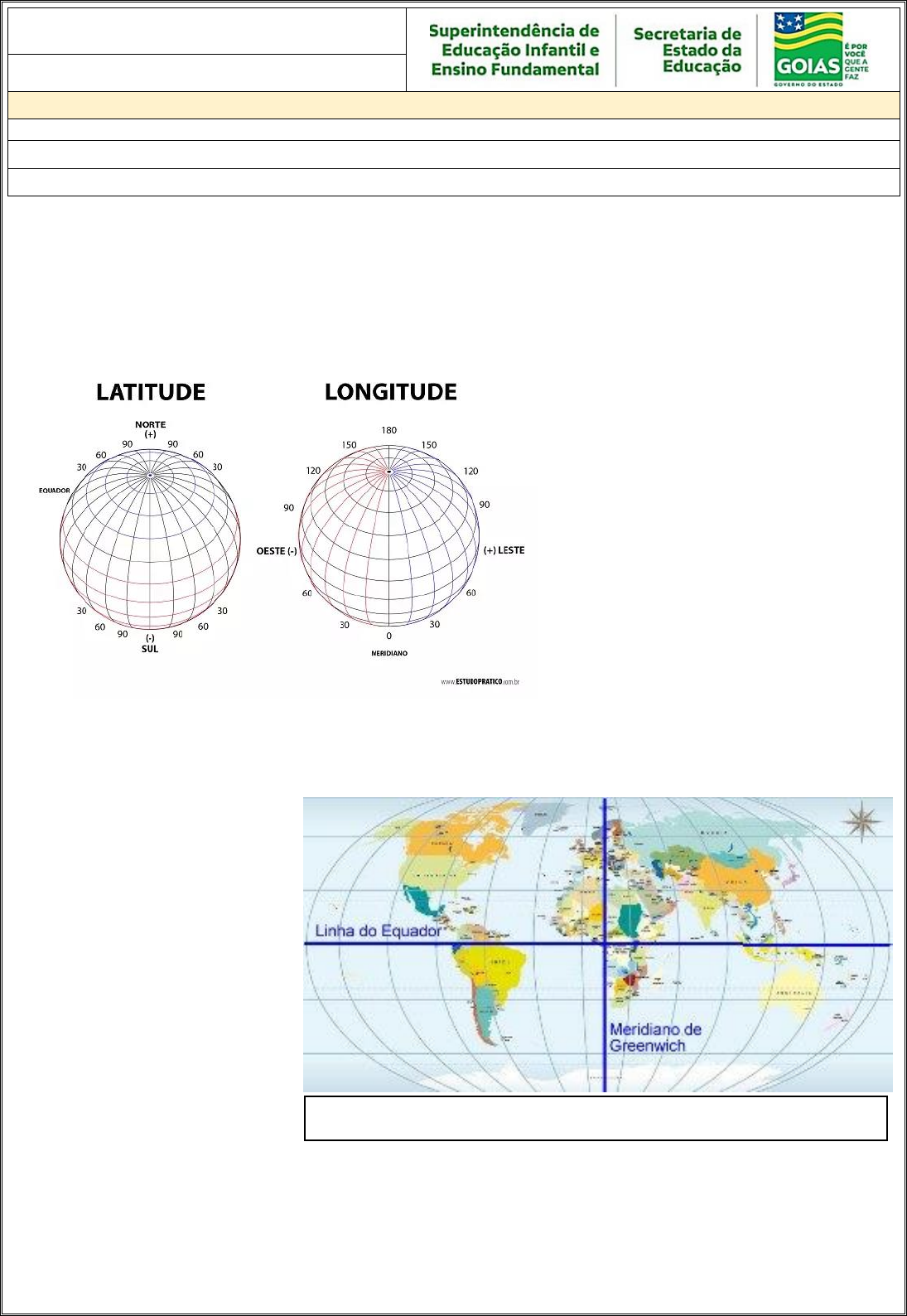 COORDENADAS GEOGRÁFICAS As coordenadas geográficas são importantes meios de localização As coordenadas geográficas são linhas imaginárias que cortam o planeta Terra nos sentidos horizontal e vertical, traçadas paralelamente entre si nos sentidos Norte-Sul e Leste-Oeste, medidas em graus, minutos e segundos. Onde um grau corresponde a 60 minutos, e um minuto corresponde a 60 segundos. Essas linhas ganham nomes de paralelos e meridianos. Os paralelos cortam a Terra horizontalmente, no sentido Leste-Oeste, enquanto os meridianos cortam a Terra verticalmente no sentido Norte-Sul. A medida em graus dos paralelos resulta na latitude e as linhas dos meridianos resulta na longitude. Latitude: São as linhas que tracejam a Terra no sentido horizontal, também conhecidas como paralelas. O círculo máximo da esfera terrestre, na horizontal, é chamado de Equador. O Equador corresponde à latitude 0°, dividindo o planeta em hemisférios Norte e Sul. As latitudes variam de 0 a 90°, tanto ao Norte quanto ao Sul. A latitude, além de servir para localização geográfica, é uma variável importante para estudar os tipos de clima da Terra, pois a incidência de raios solares no planeta é maior nos lugares com latitudes menores, isto é, mais próximas à linha do Equador. 6º ANO GEOGRAFIA ATIVIDADE 17 Tema: Fenômenos naturais e sociais representados de diferentes maneiras: Coordenadas geográficas NOME: UNIDADE ESCOLAR: Observe que a Linha do Equador é uma latitude e o Meridiano de Greenwich é uma longitude. Fonte: https://escolakids.uol.com.br/geografia/coordenadas-geograficas.htm Curiosidade: o principal paralelo é a Linha do Equador. Representa a faixa da Terra que se encontra a uma igual distância dos polos norte e sul. Longitude: São as coordenadas geográficas que cortam a Terra no sentido vertical, também conhecidas como Meridianos. A distância das longitudes varia de 0° a 180°, nos sentidos Leste e Oeste. Como padronização internacional, adotou-se o Meridiano de Greenwich como ponto de partida, a longitude de 0°. Assim, tal meridiano divide a Terra em Ocidental (a Oeste) e Oriental (a leste). Foi a partir das longitudes que se criaram os fusos horários. Todos os meridianos se encontram e se cruzam nos polos Norte e Sul. Curiosidade: o principal meridiano é o de Greenwich. A combinação entre as latitudes e as longitudes ajuda-nos a localizar qualquer ponto da Terra. ATIVIDADES 1. A latitude varia de 0º a 90º para _________ ou para _______. Já a longitude varia de 0º a 180º para _________ ou para __________. Qual das alternativas a seguir completa a frase acima? a) ( ) nordeste – noroeste – leste – oeste c) ( ) sudeste – sudoeste – nordeste – noroeste. b) ( ) sul – norte – leste – oeste d) ( ) leste – oeste – sul – norte 2. Sabemos que os paralelos cortam a Terra horizontalmente e a medida de suas linhas em graus resulta na latitude. O principal paralelo existente é: a) ( ) Meridiano Polar. c) ( ) a Linha do Equador. b) ( ) o Círculo Polar Ártico. d) ( ) o Meridiano de Greenwich. 3. O Meridiano de Greenwich é o ponto de partida, tem a longitude 0° e divide a Terra em: a) ( ) Ocidental e Oriental. c) ( ) Dois Continentes. b) ( ) Norte e Sul. d) ( ) Superior e Inferior 4. As coordenadas geográficas são extremamente importantes no sentido de apontar a localização precisa de qualquer ponto existente sobre a superfície terrestre. Elas constituem-se a partir da combinação de uma série de elementos que envolvem linhas imaginárias e sistemas de medidas. Assinale, a seguir, a alternativa que NÃO apresenta um desses elementos. a) ( ) Latitude. b) ( ) Meridianos. c) ( ) Longitude d) ( ) Amplitude. 5. De acordo com sua leitura do texto defina Latitude. https://mundoeducacao.uol.com.br/geografia/fusos-horarios.htm https://mundoeducacao.uol.com.br/geografia/fusos-horarios.htm 6. De acordo com sua leitura do texto defina Longitude. O mapa abaixo fornece as coordenadas geográficas globais estabelecidas a partir da combinação das latitudes e das longitudes. Observe: https://mundoeducacao.uol.com.br/geografia/meridiano-greenwich.htm Acima, temos a representação de cinco pontos diferentes. Observando as suas latitudes e longitudes, podemos, então, descrever as coordenadas geográficas de cada um deles, indicando os seus hemisférios (Norte: N. Sul: S. Leste: E. Oeste: W). Como exemplo? Ponto A: Latitude: -20º ou 20ºS Longitude: -60º ou 60ºW 7. Com a análise do mapa, leitura e exemplo acima, responda as questões a seguir, descrevendo a latitude e longitude dos pontos: a) Ponto B: Latitude: Longitude: c) Ponto D: Latitude: Longitude: b) Ponto C: Latitude: Longitude: d) Ponto E: Latitude: Longitude Você sabia? O GPS (Sistema de Posicionamento Global), é um aparelho que utiliza as informações referentes às coordenadas geográficas para nos dizer a localização exata de um determinado ponto. Esse aparelho conecta-se a um sistema composto por 24 satélites e, através deles, nos fornece informações não só sobre a nossa localização, mas também a velocidade do deslocamento, a altitude, além de nos indicar os melhores caminhos para se chegar a um determinado destino. 8. A utilização do GPS aumentou muito com os avanços tecnológicos, podendo ser acessados através de celulares, tablets, computadores e afins. Você ou seu responsável já utilizou o GPS? Agora é momento de criar, em seu caderno produza/desenhe uma rota de GPS, podendo ser de casa até a escola ou de casa até um lugar que você goste muito de ir. Não se esqueça de colocar os elementos existentes ao longo do percurso. Socialize com a turma a rota traçada por você.
