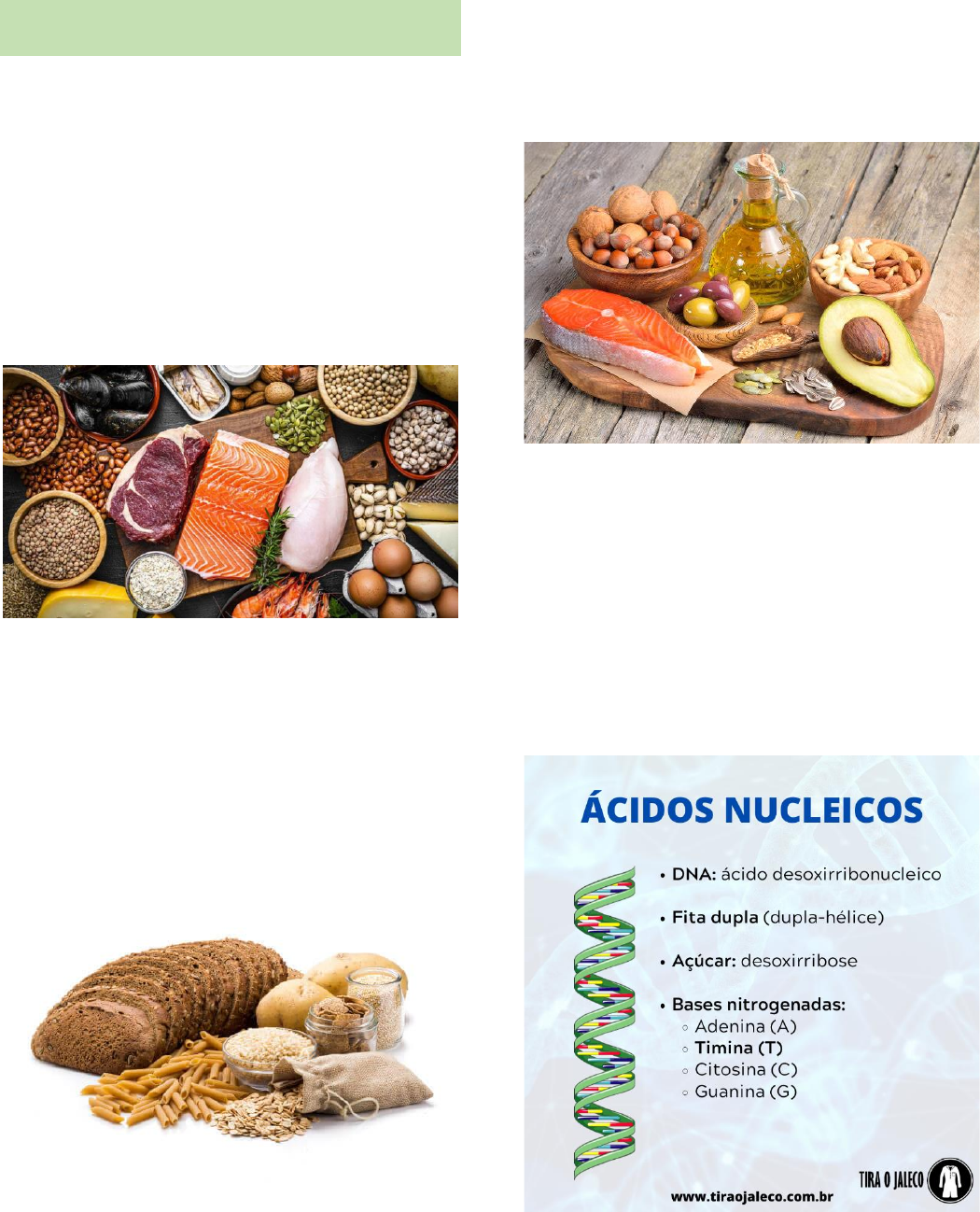 Principais compostos orgânicos presentes nos seres vivos Proteínas: As proteínas são compostas orgânicos abundantes encontrados em todos os organismos. De acordo com alguns autores, em animais superiores, essas macromoléculas constituem aproximadamente 50% do peso seco de seus tecidos. As proteínas estão presentes em praticamente todas as estruturas celulares, sendo ainda responsáveis pela constituição de anticorpos e hormônios, por exemplo. Suas funções são: regulatórias, transportadoras, de armazenamento, contráteis e móveis, estruturais, protetoras, exóticas e enzimáticas. Carboidratos: Os carboidratos são importantes biomoléculas, conhecidas também como hidratos de carbono, glicídios, ou açúcares, formadas fundamentalmente por átomos de carbono, hidrogênio e oxigênio. São as biomoléculas mais abundantes na natureza e sua maioria apresenta a seguinte fórmula geral: (CH 2 O) n. Suas principais funções são: fonte de energia, reserva de energia, estrutural e combustível para o sistema nervoso central. Lipídeos: São substâncias cuja característica principal é a insolubilidade em solventes polares e a solubilidade em solventes orgânicos (apolares), apresentando natureza hidrofóbica, ou seja, aversão à molécula de água. Os lipídios podem ser classificados em óleos (substâncias insaturadas) e gorduras (substâncias saturadas), que são encontrados nos alimentos tanto de origem vegetal quanto animal, como nas frutas (abacate e coco), na soja, na carne, no leite e seus derivados e também na gema de ovo. Suas principais funções são: armazenamento de energia, componentes de alguns sistemas enzimáticos, têm funções hormonais (hormônios esteróides) e vitaminas, atuam como isolantes térmicos. Ácidos Nucleicos: Os ácidos nucleicos podem ser definidos como polímeros (macromoléculas formadas a partir de unidades menores) compostos por moléculas conhecidas como nucleotídeos. Os dois ácidos nucleicos existentes são o ácido desoxirribonucleico (DNA) e o ácido ribonucleico (RNA). Eles são responsáveis por codificar e traduzir as informações que determinam a síntese das várias proteínas encontradas nos seres vivos. Suas principais funções são: armazenamento, transmissão e uso da informação genética.