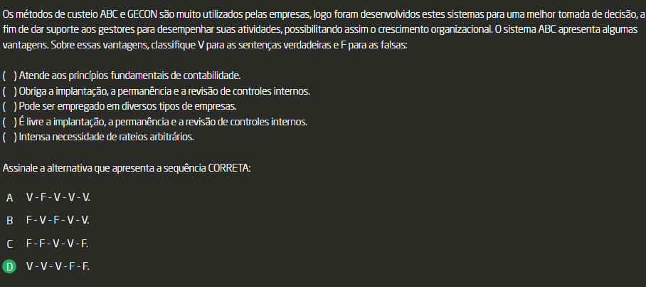 Os métodos de custeio ABC e GECON são muito utilizados pelas empresas, logo foram desenvolvidos estes sistemas para uma melhor tomada de decisão, a fim de dar suporte aos gestores para desempenhar suas atividades, possibilitando assim crescimento organizacional. 0 sistema ABC apresenta algumas vantagens. Sobre essas vantagens, classifique V para as sentenças verdadeiras e F para as falsas: ( ) Atende aos princípios fundamentais de contabilidade. ( ) Obriga a implantação, a permanência e a revisão de controles internos. ( ) Pode ser empregado em diversos tipos de empresas ( ) É livre a implantação, a permanência e a revisão de controles internos. ( ) Intensa necessidade de rateios arbitrários. Assinale a alternativa que apresenta a sequência CORRETA: A V-F-V-V-V B F-V-F-V-V C F-F-V-V-F V-V-V-F-F