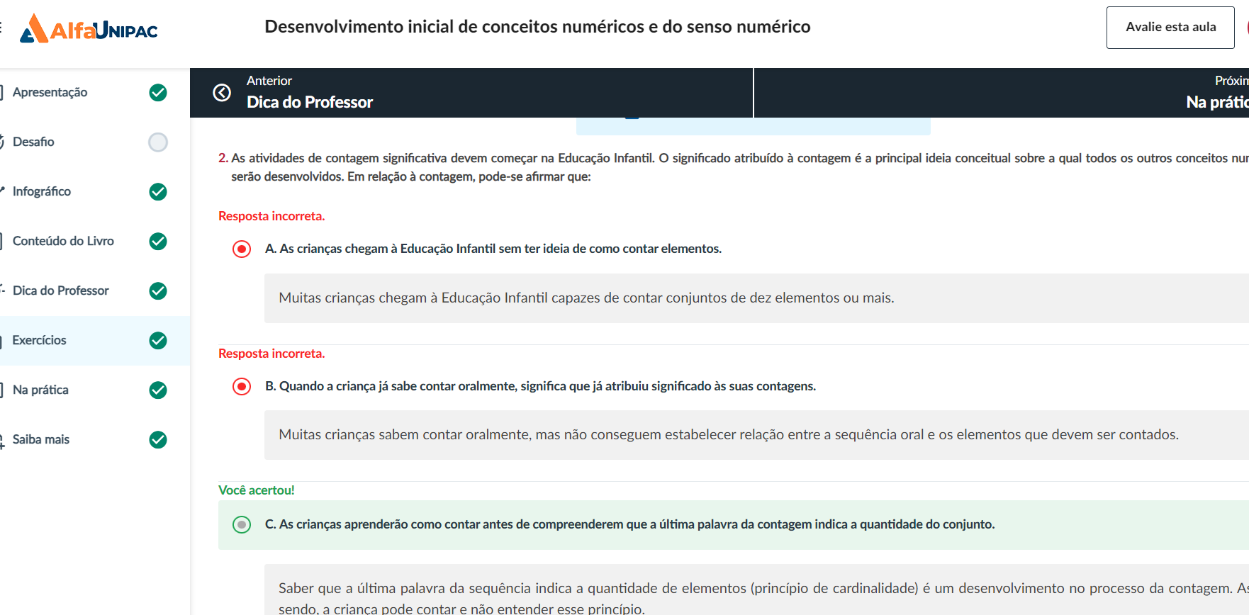 Desenvolvimento inicial de conceitos numéricos e do senso numérico Avalie esta aula Anterior Próxin Apresentação Dica do Professor Na Desafio 2. As atividades de contagem significativa devem começar na Educação Infantil. significado atribuído à contagem é a principal ideia conceitual sobre a qual todos os outros conceitos nur serão desenvolvidos. Em relação à contagem, pode-se afirmar que: Infográfico Resposta incorreta. Conteúdo do Livro A. As crianças chegam à Educação Infantil sem ter ideia de como contar elementos. Dica do Professor Muitas crianças chegam à Educação Infantil capazes de contar conjuntos de dez elementos ou mais. Exercícios Resposta incorreta. Na prática B. Quando a criança já sabe contar oralmente, significa que já atribuiu significado às suas contagens. Saiba mais Muitas crianças sabem contar oralmente, mas não conseguem estabelecer relação entre a sequência oral e os elementos que devem ser contados. Você acertou! C. As crianças aprenderão como contar antes de compreenderem que a palavra da contagem indica a quantidade do conjunto. Saber que a última palavra da sequência indica a quantidade de elementos (princípio de cardinalidade) é um desenvolvimento no processo da contagem. As sendo. a criança pode contar e não entender esse princípio.