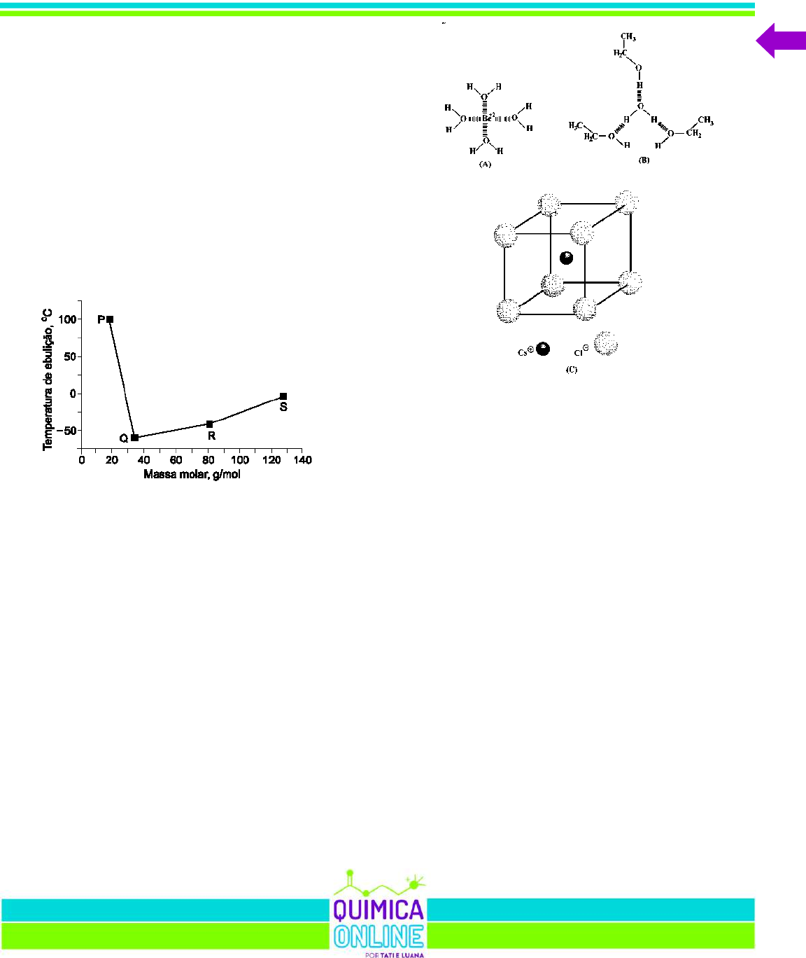 3000 QUESTÕES DE QUÍMICA 144 04. ( ) a interação entre as moléculas apolares do hexano e a região apolar da molécula do ácido ocorre por forças do tipo dipolo permanente , muito menos intensas que as ligações (pontes) de hidrogênio; 05. ( ) a polaridade da molécula de água está relacionada com as ligações entre seus átomos, que são covalentes do tipo polar. Toda molécula cujos átomos unem-se por ligações covalentes polares, será polar; 06. ( ) a substituição de um átomo de hidrogênio ligado ao carbono por um grupo –OH não deverá alterar a solubilidade em hexano. 87 - (VUNESP SP) O gráfico a seguir foi construído com dados dos hidretos dos elementos do grupo 16. Com base neste gráfico, são feitas as afirmações seguintes. I. Os pontos P, Q, R e S no gráfico correspondem aos compostos H2Te, H2S, HSe2 e H2O, respectivamente. II. Todos estes hidretos são gases a temperatura ambiente, exceto a água, que é líquida. III. Quando a água ferve, as ligações covalentes se rompem antes das intermoleculares. Das três afirmações apresentadas, a) apenas I é verdadeira. b) apenas I e II são verdadeiras. c) apenas II é verdadeira. d) apenas I e III são verdadeiras. e) apenas III é verdadeira. 88 - (UFG GO) Os esquemas a seguir indicam tipos de interações que podem ocorrer em substâncias e materiais. Sobre esses esquemas julgue as proposições a seguir: 01. as linhas tracejadas representam ligações covalentes; 02. A e B representam processos de solvatação por interação entre íons e dipolo; 03. B representa interações do tipo pontes de hidrogênio e ligações covalentes; 04. C representa interações moleculares. 89 - (ITA SP) Considere os seguintes álcoois: I. Etanol II. n-propanol III. n-butanol IV. n-pentanol V. n-hexanol Assinale a opção CORRETA em relação a comparação das solubilidades em água, a 25ºC, dos seguintes álcoois: a) Etanol > n-propanol > n-butanol > n-pentanol > n- hexanol. b) Etanol n-propanol > n-butanol > n-pentanol > n- hexanol. c) Etanol n-propanol > n-butanol n-pentanol > n- hexanol. d) Etanol > n-propanol > n-butanol > n-pentanol < n- hexanol. 3000 QUESTÕES DE QUÍMICA 145 e) Etanol < n-propanol < n-butanol < n-pentanol < n- hexanol. 90 - (ITA SP) Assinale a opção CORRETA em relação à comparação das temperaturas de ebulição dos seguintes pares de substâncias: a) Éter dimetílico > etanol; propanona > ácido etanóico; naftaleno < benzeno; b) Éter dimetílico < etanol; propanona < ácido etanóico; naftaleno > benzeno; c) Éter dimetílico > etanol; propanona < ácido etanóico; naftaleno > benzeno; d) Éter dimetílico > etanol; propanona > ácido etanóico; naftaleno > benzeno; e) Éter dimetílico < etanol; propanona < ácido etanóico; naftaleno < benzeno; 91 - (CENTEC BA) A interação representada na estrutura é: a) dipolo induzido. b) íon-dipolo c) dipolo-dipolo d) ponte de hidrogênio e) dipolo-hidrogênio 92 - (PUC GO) Leia com atenção o diálogo que se segue: — Se costuma viajar de avião no inverno, sabe como é irritante quando o voo se atrasa por ser preciso o degelo da aeronave. A espera é compreensível já que o gelo na superfície do avião pode ser extremamente perigoso. Será que não existe uma solução melhor para este problema? — As gotículas de água aderem à superfície de alumínio quando este está frio e úmido. Como podemos evitar isto? — Uma das soluções para evitar a formação de gelo é revestir os elementos com camadas super-hidrofóbicas, diz Bartlomiej Przybyszewski, da Fundação Tecnology Partners. (Disponível em: //pt.euronews.com/2018/05/28/como- evitar- que-as-gotas-de-agua-se-transformem-em-gelo-nas- superficies- dos-avioes. Acesso em: 27 jul. 2018. Adaptado.) Analise as afirmativas a seguir: I. Para ser hidrofóbica, a substância precisa ter um átomo com pares de elétrons não usados em ligações químicas. II. A molécula de água é polar, permitindo ligações do tipo ligações de hidrogênio. III. A molécula de água pode induzir o dipolo em moléculas apolares, como a do gás oxigênio. Em relação às proposições analisadas, assinale a única alternativa cujos itens estão todos corretos: a) I e II. b) I, II e III. c) I e III. d) II e III. 93 - (FPS PE) A química supramolecular pode ser descrita como o ramo da química que estuda agregados de moléculas, também conhecidos como “supermoléculas”, unidas por interações não covalentes. Observe o exemplo abaixo, em que várias moléculas de melamina e triazinatriona dão origem a uma “supermolécula”. 3000 QUESTÕES DE QUÍMICA 146 As interações não covalentes, representadas por ligações tracejadas que estão presentes nesta supermolécula, são chamadas: a) forças de London. b) interações de Van der Waals. c) interações eletrostáticas íon-íon. d) interações dipolo - dipolo induzido. e) pontes de hidrogênio. 94 - (FGV SP) Considere as substâncias e seus dados apresentados na tabela a seguir. Em um experimento em laboratório de pesquisa, cinco amostras puras, sendo uma de cada substância da tabela, são mantidas separadamente em recipientes selados adequadamente a 90 ºC a 1 atm. Quando a temperatura dessas amostras é alterada para 25 ºC, são estabelecidas interações intermoleculares. São estabelecidas ligações de hidrogênio na amostra da substância a) I. b) II. c) III. d) IV. e) V. 95 - (UEM PR) O quadro a seguir apresenta algumas propriedades físicas dos compostos I, II, III e IV. Sabendo que esses compostos são 2- metilbutano, triclorometano, n-butilamina e propanona, não necessariamente nessa ordem, assinale o que for correto. 01. A 1atm de pressão, todos os compostos são líquidos a 25 ºC e gases a 80 ºC. 02. O triclorometano é o composto I, pois é mais denso que a água devido à presença dos átomos de cloro. 3000 QUESTÕES DE QUÍMICA 147 04. A butilamina é o composto II, pois realiza interações intermoleculares do t