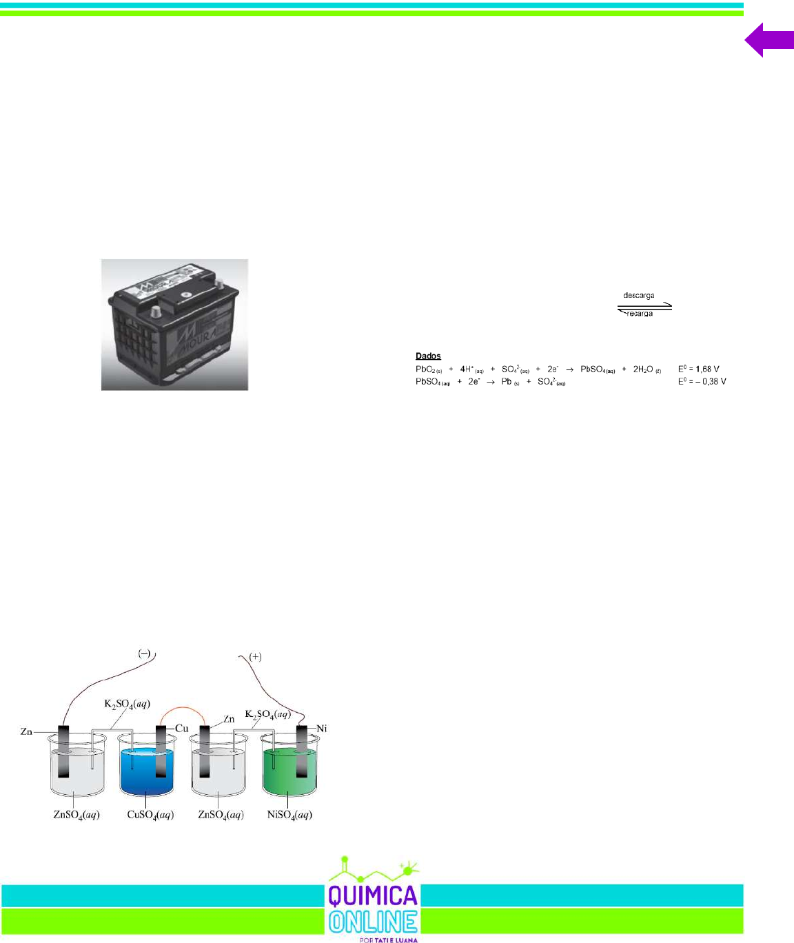 3000 QUESTÕES DE QUÍMICA 520 d) Conforme os potenciais padrões apresentados para a as semirreações, a diferença de potencial desta bateria é, em condições padrão, Eº = –2,51 V. e) No sentido espontâneo, a semirreação (A) acontece no ânodo, a semirreação (B) acontece no cátodo. Desta maneira, na semirreação (A) ocorre oxidação e na semirreação (B) ocorre redução. 13 - (UNIFOR CE) Ao tentar ligar seu carro pela manhã, Paulo verificou que sua bateria estava em pane. Verificou a referência para poder comprar uma nova e na etiqueta constava 45 Ah. Esta medida se refere à: (Fonte: http://novoemelhor.com/wp- content/uploads/2011/07/bateria-carro.jpg) a) Energia Armazenada; b) Potência de Partida; c) Carga Armazenada; d) Corrente Máxima; e) Diferença de Potencial. 14 - (UEA AM) A imagem ilustra a bateria construida por um estudante, formada por duas pilhas ligadas em série. Todas as soluções aquosas utilizadas nessas pilhas estão a 25 ºC e apresentam concentração de 1,0 mol/L. Nas condições-padrão, a diferença de potencial produzida por essa bateria, em volt, foi próxima de a) 0,48. b) 1,10. c) 1,61. d) 2,78. e) 3,01. 15 - (UCS RS) A bateria de armazenamento de chumbo usada em automóveis consiste de placas de chumbo metálico e óxido de chumbo IV, imersas em uma solução aquosa de ácido sulfúrico. O funcionamento de cada placa pode ser descrito pela equação da reação global representada abaixo. PbO2(s) + Pb(s) + 4H+(aq) + 2SO4 2–(aq) 2PbSO4(aq) + 2H2O(l) Com base nessas informações, é correto afirmar que, na bateria automotiva, a) ocorre a oxidação do PbO2 durante o processo de descarga. b) são produzidos aproximadamente 2 V em cada placa, durante o processo de descarga. c) ocorre a redução do chumbo metálico durante o processo de recarga. d) durante o processo de recarga, em cada placa, estão envolvidos 4 elétrons. e) ocorre a redução do íon H+ durante o processo de descarga. 16 - (UEFS BA) A equação química, não balanceada, representa a reação global da pilha de chumbo e ácido que produz energia utilizada em veículos automotivos. A partir dessa equação química balanceada com os menores coeficientes estequiométricos inteiros, é correto afirmar: a) O Pb(s) é oxidado pelo hidrogeno-sulfato. b) O PbO2(s) é o agente redutor na equação química. )l(OH)S(PbSO)aq(HSO)S(Pb)S(PbO 2442 +→++ − 3000 QUESTÕES DE QUÍMICA 521 c) A soma dos elétrons recebidos e doados durante a reação química representada é igual a zero. d) A soma das cargas elétricas no primeiro membro é diferente daquela no segundo membro da equação química. e) A quantidade de matéria de átomos, no primeiro e no segundo membros da equação química, é igual, de acordo com o princípio de conservação de massa. 17 - (UNIFOR CE) Uma bateria chumbo-ácido é, basicamente, constituída de grades de chumbo preenchidas com chumbo esponjoso e de placas de chumbo preenchidas com óxido de chumbo(IV), PbO2, em uma solução aquosa de ácido sulfúrico, H2SO4. A reação global que ocorre durante o processo de descarga de uma bateria chumbo-ácido pode ser descrita como Pb(s) + PbO2(s) + 2 H2SO4(aq) → 2 PbSO4(s) + 2 H2O(l) Considerando-se estas informações, é CORRETO afirmar que a) a densidade da solução de ácido sulfúrico diminui no processo de recarga da bateria. b) o óxido de chumbo (IV), PbO2, sofre oxidação no processo de descarga da bateria. c) o pH da solução da bateria diminui durante o processo de descarga. d) no processo de recarga os elétrons migram do eletrodo que contém PbO2 para o eletrodo que contém Pb esponjoso. e) a concentração do eletrólito aumenta no processo de descarga da bateria. 18 - (UECE) As baterias da nova geração, desenvolvidas com íon-lítio são utilizadas em celulares, iPods e notebooks. Suas semirreações eletroquímicas são: C6(s) + xLi+ + xe– → LixC6(s) Li1MO2(s) → Li(1 – x)MO2(s) + xLi+ xe– A respeito dessas semirreações pode-se afirmar corretamente que a) o carbono é reduzido. b) o íon Li+ é o agente oxidante. c) o estado de oxidação do Li no composto LixMO2 é zero. d) o composto Li(1 x)MO2 é o agente redutor. 19 - (UNIRG TO) Pilhas a combustível, usadas em missões espaciais, devem ser leves, eficientes e capazes de operar em temperaturas elevadas de até 140 ºC, e produzirem voltagem de aproximadamente 0,9 volts. Nessas células, as semirreações que ocorrem são as seguintes: No compartimento I: 2 H2(g) + 4 OH–(aq) 4 H2O(l) + 4e– ; No compartimento II: 1 O2(g) + 2 H2O(l) + 4e– 4 OH–(aq) . Sobre esse assunto, assinale a única alternativa correta: a) Nessas pilhas, o hidrogênio atua como agente oxidante; b) Nessas pilhas, os elétrons fluem do cátodo para o ânodo; c) O compartimento I corresponde ao ânodo dessas pilhas; d) A utilização de pilhas a combustível gera emissões poluentes. 20 - (UNIFOR CE) Há tempos, o gás hidrogênio vem sendo considerado o combustível do futuro. Isso se deve, principalmente, ao fato de que os únicos produtos resultantes da queima desse gás são calor e água e, quando produzido (por eletrólise) a partir de fontes renováveis de energia, por exemplo solar e eólica, o mesmo também pode ser considerado como tal. Considere as reações e/ou semirreações a seguir: I. 2H2O 2H+(aq) + 2OH–(aq) II. 2H+(aq) + 2e– H2(g) III. 2OH–(aq) 2e– + H2O + 1/202(g) Como base nas reações e considerando os gases envolvidos como ideais, é correto o que se afirma em: → → 3000 QUESTÕES DE QUÍMICA 522 a) A semirreação II ocorre no ânodo. b) O gás oxigênio é produzido no polo negativo. c) O fluxo de elétrons se dá do cátodo para o ânodo. d) A reação I é a reação global do processo de eletrólise da água. e) O volume de gás hidrogênio produzido é o dobro do volume de gás oxigênio. 21 - (ITA SP) Considere as seguintes semirreações de oxirredução e seus respectivos potenciais padrão na escala d