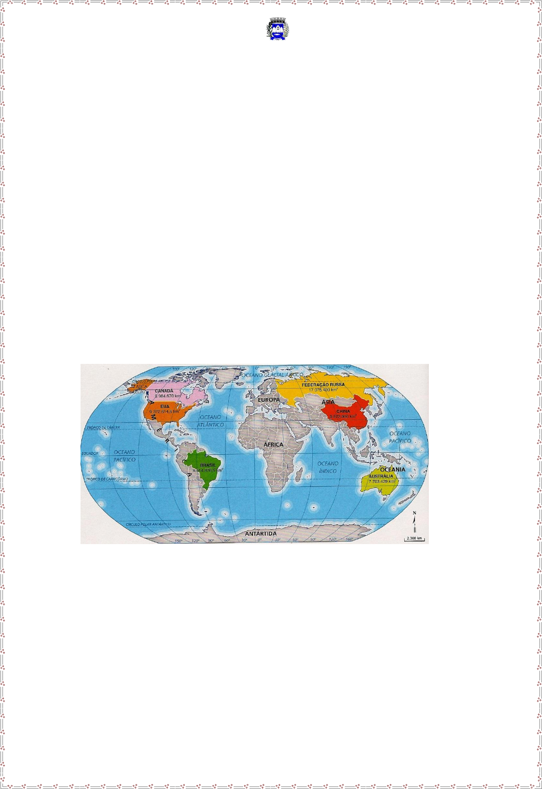 Prefeitura Municipal de Piúma Secretaria Municipal de Educação COLETÂNIA DE ATIVIDADES PEDAGÓGICAS PLANEJADAS PELOS DOCENTES DA REDE MUNICIPAL DE PIÚMA NOME DA ESCOLA Escola Municipal Portinho NOME DO ALUNO SÉRIE/TURMA:4º ano GEOGRAFIA Continentes e Oceanos Ao analisarmos a superfície da terra através de recursos como mapas e fotos, concluiremos que a porção de terra na superfície que chamamos de continentes e os continentes da terra são América, Europa, Ásia, África, Oceania e Antártida é inferior à quantidade de água. Os espaços ocupados pela água salgada chamamos de oceanos e mares e podemos notar que existem cinco oceanos: Atlântico, Índico, Pacífico, Glacial Ártico e Glacial Antártico, embora os dois últimos não sejam mais considerados como oceanos, e sim como grandes mares 1- Você sabe que o globo terrestre no planisfério representa as terras e as águas do nosso planeta. Agora vamos aprender um pouco mais utilizando o mapa abaixo: -Pinte de azul as áreas ocupadas pelos oceanos -Escreva o nome dos oceanos -Escreva os nomes dos continentes em seus respectivos lugares; -Pinte cada continente seguindo a legenda abaixo; Prefeitura Municipal de Piúma Secretaria Municipal de Educação COLETÂNIA DE ATIVIDADES PEDAGÓGICAS PLANEJADAS PELOS DOCENTES DA REDE MUNICIPAL DE PIÚMA América -amarelo Europa -vermelho Ásia -laranja África – verde Oceania – marrom Antártida – rosa 2- Observe no mapa e responda: a) Em qual continente moramos? ________________________________________________________________ b) Quais oceanos banham o nosso continente? ______________________________________________________________________________ c) Qual oceano banha o nosso país? ________________________________________________________________