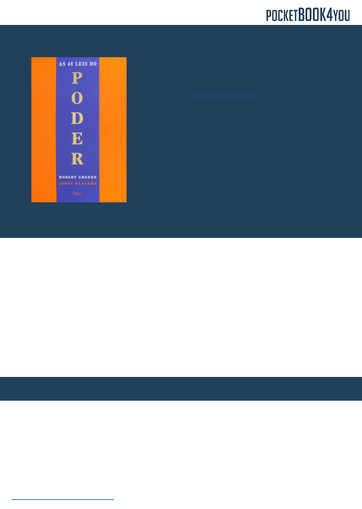www.pocketbook4you.com 1 de 5 As 48 Leis do Poder As 48 Leis do Poder Ano de publicação: 2000 Autor: Robert Greene 460 páginas Link para compra: https://amzn.to/30QhNhp Publicado pela primeira vez em 1998 com o título “The 48 Laws of Power” (em inglês), o livro traz uma coletânea completa de leis baseadas na análise de mais de 3000 anos de uso do poder pela humanidade. Em suas mais de 400 páginas são explicadas cada uma das leis, apresentando a interpretação do autor sobre ela, exemplos de onde e quando foi observada e as consequências de sua transgressão. Desde seu lançamento, a obra já vendeu mais de 1 milhão de exemplares, traduzidos em 24 línguas. No Brasil, a primeira edição do livro foi publicada no ano de 2000 pela Editora Rocco. Avaliação geral 8 8 Aplicabilidade 8 Inspiração 8 Inovação 9 Impacto no resultado 8 Estrutura Principais ideias do livro Uma famosa frase de Nicolau Maquiavel representa muito bem as ideias compartilhadas por Robert Greene: “O homem que tenta ser bom o tempo todo está fadado à ruína entre os inúmeros outros que não são bons. Por conseguinte, o príncipe que desejar manter a sua autoridade deve aprender a não ser bom, e usar esse conhecimento, ou abster-se de usá-lo, segundo a necessidade.” Se você está preparado para as 48 leis do poder, aqui estão elas. Esse livro é indicado para quem? As leis apresentadas pelo autor serão fascinantes para leitores interessados em chegar ao poder, independente dos métodos utilizados para conseguir. Mas calma, a obra também te ajudará a identificar e se defender das leis. Se você deseja conquistar o poder, com os fins justificando os meios, esse livro pode ser o seu guia. 1 de 11 http://www.pocketbook4you.com/ http://www.pocketbook4you.com/ https://amzn.to/30QhNhp www.pocketbook4you.com 2 de 5 Overview: Lei 1 – Nunca ofusque o mestre Sempre faça aqueles acima de você se sentirem confortavelmente superiores. Não faça nada que os deixem inseguros. Para conquistar o poder, você precisa que eles pareçam melhores e mais brilhantes do que eles são. Overview: Lei 2 – Nunca confie demais em seus amigos, aprenda como usar os inimigos Segundo Greene, as chances dos seus amigos te traírem são maiores. Eles têm uma tendência lamentável de esperar muito de você, por causa de sua amizade, e se tornarem perturbações exigentes. Visão geral do livro Em vez de contratar amigos você deve contratar inimigos. O inimigo que você perdoa sempre sentirá que ele tem que provar sua lealdade. Se você não tem inimigos, comece a trabalhar e faça alguns bons. Overview: Lei 3 – Não mostre suas intenções Se as pessoas não sabem qual objetivo você está buscando, elas não podem se defender contra você. Mantenha suas intenções em segredo. Para ter poder, você precisa ser capaz de deixar as pessoas perdidas e desinformadas. Overview: Lei 4 – Sempre fale menos que o necessário Os poderosos raramente falam. Quanto mais você fala, mais comum se torna. Ao se tornar comum, menos impressionante você parece. Fale com moderação. É importante que você seja vago e fale o mínimo possível. Quem fala pouco parece mais poderoso e intimida as pessoas com sua discrição. Overview: Lei 5 –Muitas coisas dependem da sua reputação, guarde-a com sua vida Sua reputação é a base do seu poder. Quanto mais reconhecido e respeitado você é, mais poderoso você se torna, mas uma vez danificada ela se torna inútil. Ter apenas uma boa reputação já te ajuda a vencer. Agora, se você deseja destruir seus inimigos, ataque a reputação deles. Feito o ataque, saia de perto e deixe que o público termine a desmoralização dos seus oponentes. Para ter sucesso no jogo do poder, você precisa dominar suas emoções. Mas mesmo se você conseguir obter esse autocontrole, nunca poderá controlar as disposições temperamentais das pessoas ao seu redor. E isso representa um grande perigo. 2 de 11 http://www.pocketbook4you.com/ http://www.pocketbook4you.com/ www.pocketbook4you.com 3 de 5 Overview: Lei 6 – Torne-se o centro das atenções As pessoas são julgadas pela sua aparência e, se você quer ter poder, atraia sempre a atenção das pessoas e nunca fique invisível na multidão. Seja misterioso, mas destaque-se da massa. Overview: Lei 7 – Faça os outros trabalharem para você, mas sempre pegue o crédito Segundo Greene, se você quer se tornar poderoso, precisa levar os créditos pelo trabalho das pessoas que trabalham para você e, sempre que possível, aproprie-se dos méritos das atividades que elas executarem. Ao fazer isso você parecerá um milagre de velocidade e competência, e ninguém se lembrará daqueles que tornaram possível o seu sucesso. Nunca faça você mesmo o que outras pessoas podem fazer para você. Overview: Lei 8 – Faça com que as pessoas venham até você, use uma isca se for necessário Ao forçar outras pessoas a agir, você fica no controle. É sempre melhor fazer seu oponente vir até você, dessa forma ele abandona seus próprios planos no processo. Ofereça iscas e promessas de grandes ganhos e, quando atraí-los, ataque. Overview: Lei 9 – Vença através de suas ações, não de argumentos Segundo Greene, discussões geram ressentimentos para a pessoa do outro lado, o que prejudica sua capacidade de influenciar. Para vencer você precisa tomar ações que mostrem o que você quer. Prove que você está certo através de atos, não de palavras. Overview: Lei 10 – Se afaste dos infelizes e azarados Estar próximo de pessoas infelizes e azaradas esgota sua capacidade mental e emocional, fazendo você falhar por contaminação. Evite-os, e se aproxime apenas dos vencedores. Overview: Lei 11 – Aprenda a manter as pessoas dependentes de você Quando as pessoas dependem de você, você está no controle. Nunca ensine a elas o necessário para pensarem que podem competir com você. Guarde alguns segredos que garantam seu poder. 3 de 11 http://w