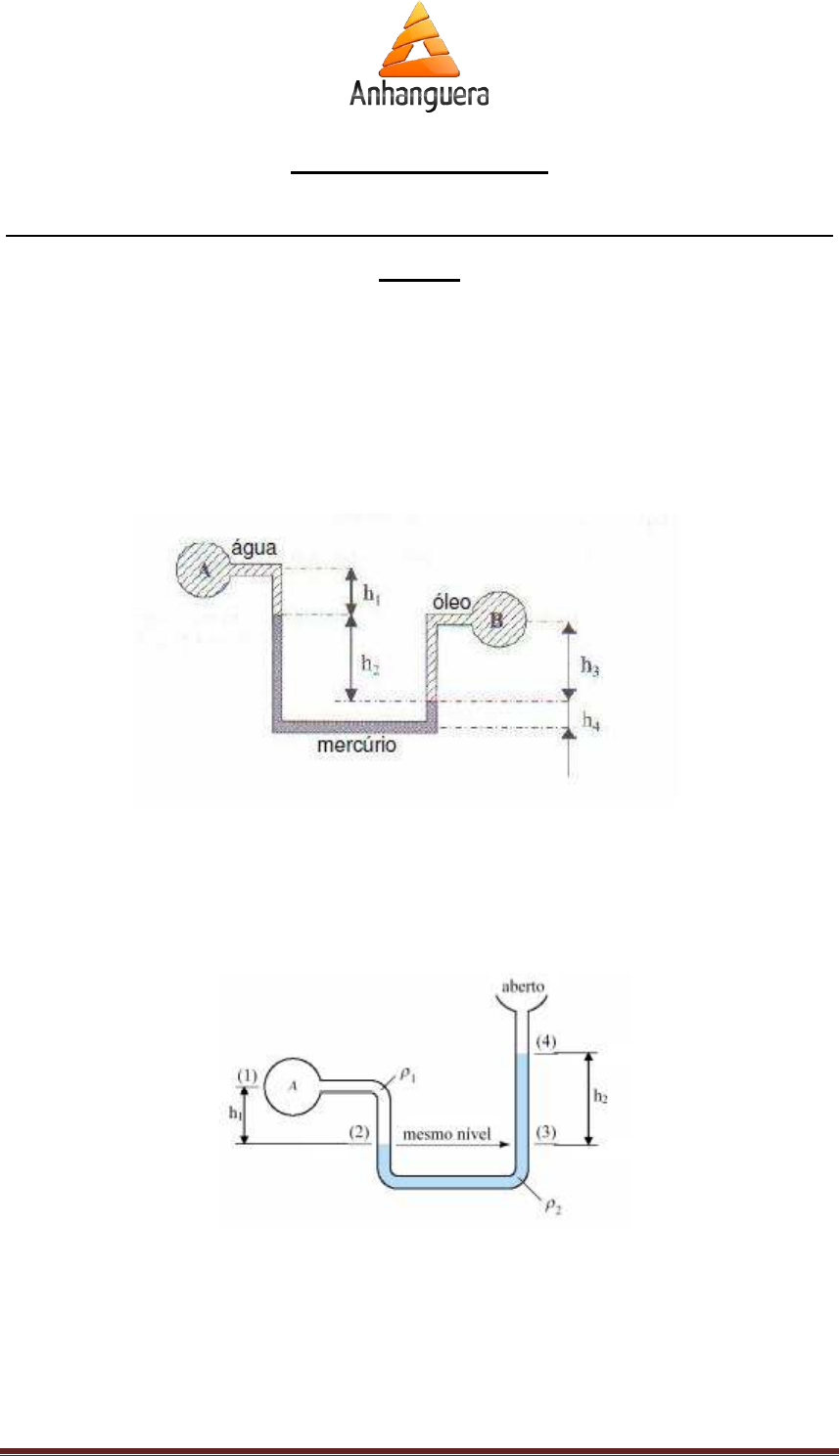 Fundamentos de Hidrostática e Calorimetria – Profa. Marcela Santos Página 1 Lista de Exercícios 3 Aplicação do Princípio de Stevin e Princípio de Arquimedes e de Pascal 1. No manômetro diferencial mostrado na figura, o fluido A é água, B é óleo e o fluido manométrico é mercúrio. Sendo h1 = 25cm, h2 = 100cm, h3 = 80cm e h4 = 10cm, determine qual é a diferença de pressão entre os pontos A e B. Dados: γH20 = 10000N/m³, γHg = 36 N/m³, γóleo = 8000N/m³ 2. Determine a pressão do ponto A em função das várias alturas das colunas presentes na figura, assim como das propriedades dos fluidos. Fundamentos de Hidrostática e Calorimetria – Profa. Marcela Santos Página 2 3. O manômetro em U mostrado na figura contém óleo, mercúrio e água. Utilizando os valores indicados, determine a diferença de pressões entre os pontos A e B. Dados: γH20 = 10000N/m³, γHg = 36 N/m³, γóleo = 8000N/m³ 4. Na figura abaixo, o tubo A contém óleo com massa especifica relativa igual a 0,80 e o tubo B, água. Calcular as pressões em A e em B. Dados: massa específica da água igual a 1000kg/m³ e massa específica do mercúrio igual a 13600kg/m³. Cotas expressas em m. Fundamentos de Hidrostática e Calorimetria – Profa. Marcela Santos Página 3 5. A figura abaixo apresenta esquematicamente um manômetro diferencial. Pede-se a diferença de pressões entre os pontos A e B em Pascal, conhecendo-se os seguintes dados de peso específico relativo e alturas: Peso específico relativo: γr1 = γr5 = 1; γr2 = 13,6; γr3 = 0,8; γr4 = 1,2. Alturas: z1 = 1,0 m; z2 = 2,0 m; z3 = 2,5 m; z4 = 5,0 m; z5 = 6,0 m. 6. Um corpo com volume de 2,0m³ e massa 3000kg encontra-se totalmente imerso na água, cuja massa específica é dH2O = 1000kg/m³. Determine a força de empuxo sobre o corpo. 7. Em um recipiente há um líquido de densidade 2,56g/cm³. Dentro do líquido encontra-se um corpo de volume 1000cm³, que está totalmente imerso. Qual o empuxo sofrido por este corpo? Dado g=10m/s² 8. Um corpo esférico flutuando em um líquido de densidade 0,80 g/cm com 4/5 de seu volume submerso. Qual é a densidade do corpo? Fundamentos de Hidrostática e Calorimetria – Profa. Marcela Santos Página 4 9. O esquema a seguir apresenta uma prensa hidráulica composta de dois reservatórios cilíndricos de raios R1 e R2. Os êmbolos desta prensa são extremamente leves e podem mover-se praticamente sem atrito e perfeitamente ajustados a seus respectivos cilindros. O fluido que enche os reservatórios da prensa é de baixa densidade e pode ser considerado incompressível. Quando em equilíbrio, a força F2 suportada pelo êmbolo maior é de 100 vezes superior à força F1 suportada pelo menor. Determine a razão entre os raios R2 e R1. 10. Na prensa hidráulica mostrada na figura, os diâmetros dos tubos 1 e 2 são, respectivamente, 4cm e 20cm. Sendo o peso do carro igual a 10000N, determine a força que deve ser aplicada no tubo 1 para equilibrar o carro.