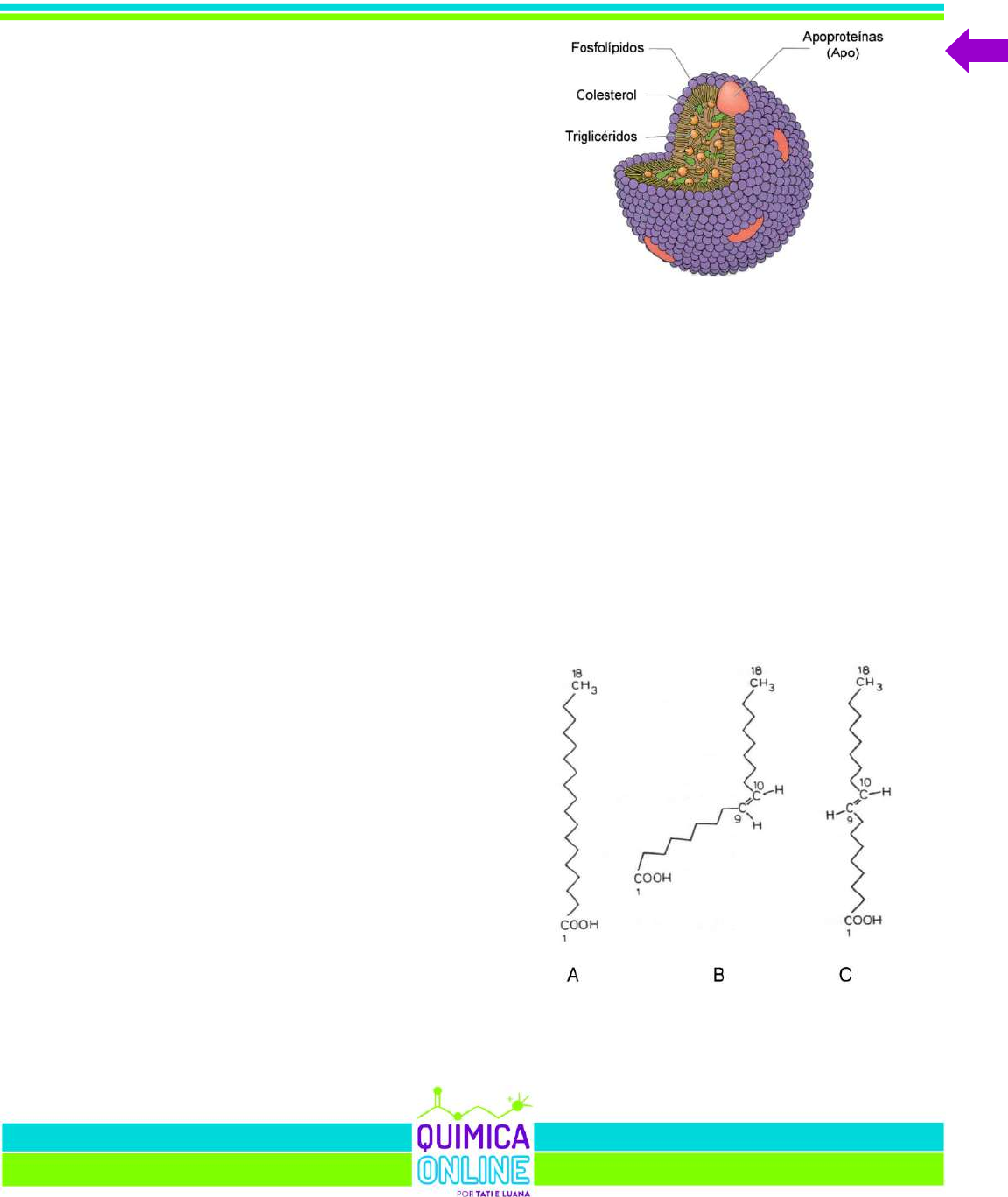 3000 QUESTÕES DE QUÍMICA 728 “Despertando pela manhã, alimentava-se de peixes exóticos; escrevia no diário de bordo e ficava a contemplar as ilhas”. (SCLIAR, Moacyr. Melhores contos. Seleção de Regina Zilbermann. São Paulo: Global, 2003. p. 105/106.) A carne do pescado apresenta um conteúdo de proteínas que pode variar, geralmente, entre 15 a 24%. No músculo do peixe existem proteínas, como por exemplo a actina e a miosina. Sobre as proteínas, são feitas as seguintes afirmações: I. São biomoléculas formadas por monômeros que apresentam caráter anfótero. II. A representação do grupo ácido ionizado nos monômeros citados no item anterior é –NH3 +. III. Actina e miosina são proteínas responsáveis por transporte de oxigênio às células. IV. Numa molécula de proteína, existem várias ligações peptídicas formadas a partir da reação entre grupo carboxila e grupo amino. Assinale a única alternativa que apresenta todos os itens verdadeiros: a) Apenas I. b) I, II, III. c) I, IV. d) II, IV. 106 - (FCM PB) O colesterol e os triglicerídeos são lipídios muito importantes na composição dos organismos vivos pois eles são componentes das membranas plasmáticas, ajudam na absorção de impactos e no controle da temperatura corporal e como matéria-prima para síntese de hormônios esteroides. Devido a natureza apolar, essas substâncias são transportadas na corrente sanguínea em estruturas denominadas de lipoproteínas. A estrutura básica das lipoproteínas é idêntica, variando somente de tamanho e proporção entre os seus componentes. A fração proteica é composta por apoproteínas, enquanto que a parte lipídica é formada por colesterol, triglicerídeos e fosfolipídios, conforme mostra a figura a seguir. Fonte: https://conceptodefinicion.de/lipoproteinas/ Esse arranjo característico se deve ao fato de os fosfolipídios da lipoproteína: a) Serem inteiramente solúveis em água, ou seja, polar. b) Serem solúveis em solução aquosa, ou seja, apolar. c) Possuírem uma parte hidrofílica e outra hidrofóbica, ou seja, anfipática. d) Comportassem como ácidos e bases, ou seja, serem anfotérica. e) Possuírem duplas ligações em sua estrutura, ou seja, serem insaturados. 107 - (UNIFOR CE) Observe as estruturas dos ácido graxos abaixo denominados A, B e C. Considerando a estrutura dos três ácidos graxos acima (A, B e C), pode-se afirmar que 3000 QUESTÕES DE QUÍMICA 729 a) o ácido graxo “A” tem o ponto de fusão mais alto e, por isso, encontra-se no estado líquido a temperatura ambiente. b) o ácido graxo “B” apresenta estrutura trans e é o mais saudável para a dieta humana, sendo comumente encontrado em azeite de oliva. c) os ácidos graxos A e C são estruturalmente semelhantes, portanto têm exatamente os mesmos efeitos sobre o organismo humano. d) o ácido graxo “B” apresenta ponto de fusão mais baixo que o ácido graxo “C” e apresentam impactos diferentes sobre a saúde humana. e) o ácido graxo “C” apresenta estrutura cis e pode ser encontrado em produtos alimentícios como margarinas, gordura vegetal hidrogenadas e sorvetes. 108 - (UECE) Em nossa alimentação, é comum ingerirmos alimentos fritos em gorduras e óleos de origem animal e vegetal, tais como: banha, óleo de milho, óleo de caroço de algodão, etc. Atente ao que se diz a respeito de gorduras e óleos a seguir, e assinale com V o que for verdadeiro e com F o que for falso. ( ) Possuem, em suas estruturas, a mistura de parafina e glicerina. ( ) São constituídos por hidrocarbonetos não saturados. ( ) Pertencem à família dos glicídios. ( ) São ésteres de ácidos carboxílicos de número de carbonos variável e glicerina. ( ) Em geral são ésteres de ácidos graxos com os mais variados álcoois. A sequência correta, de cima para baixo, é: a) F, F, V, V, V. b) V, F, V, V, F. c) F, F, F, V, V. d) F, V, F, F, V. 109 - (UEM PR) A respeito de gorduras, óleos vegetais, biodiesel, ácidos graxos e sabões, assinale a(s) alternativa(s) correta(s). 01. As gorduras trans são produzidas a partir de um processo de oxidação catalítica. 02. Sabões podem ser produzidos a partir de uma reação ácido-base entre uma base forte e um ácido graxo. 04. As gorduras de origem animal são constituídas essencialmente de ácidos graxos saturados, e os óleos vegetais apresentam cadeias saturadas, monoinsaturadas e poli- insaturadas. 08. Óleos vegetais poli-insaturados são sólidos e a partir do processo de hidrogenação se tornam líquidos, em temperatura ambiente. 16. A partir de uma reação de transesterificação é possível produzir biodiesel. Para isso, reage-se um óleo vegetal na presença de um álcool de cadeia curta e de um catalisador. 110 - (UFES) A reação esquematizada abaixo exemplifica a formação do sabão a partir de um triacilglicerol na presença de NaOH. Essa reação é a maneira pela qual muitos sabões são fabricados. a) Determine quantos carbonos primários, secundários, terciários e quaternários, respectivamente, o composto 1 apresenta. b) Escreva o nome sistemático (IUPAC) dos compostos 2 e 3. 3000 QUESTÕES DE QUÍMICA 730 c) Identifique o tipo de reação química que ocorre na formação dos compostos 3, 4, 5 e 6 a partir dos compostos 1 e 2. d) Escreva a função química a que pertence o composto 1. e) Escreva a estrutura química e a fórmula molecular do composto 4. 111 - (UNITAU SP) O composto químico 2,6 diisopropilfenol é um anestésico muito popular, aplicado via intravenosa, e utilizado na forma de um sistema coloidal tipo emulsão. Uma formulação típica utilizada na emulsão do anestésico contém, em massa, 1,0% de 2,6 diisopropilfenol, 10% de óleo de soja (composto em grande parte por ácido linoleico), 1,0% de fosfatidilcolina e o restante de água. As estruturas químicas dos compostos da emulsão estão apresentadas abaixo. Essa emulsão é classificada como óleo em água, onde o óleo é a fa