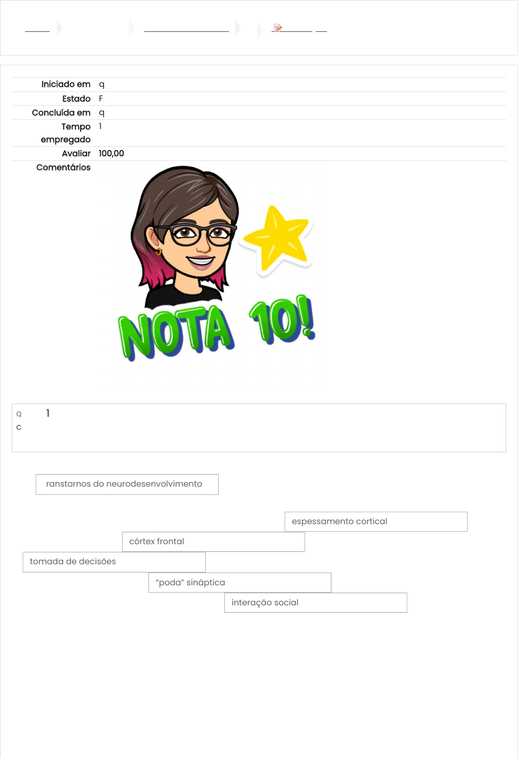 Painel Meus cursos 10152002-T01-2024-1 📝 Avaliação Iniciado em quinta, 15 ago 2024, 08:19 Estado Finalizada Concluída em quinta, 15 ago 2024, 08:31 Tempo empregado 11 minutos 31 segundos Avaliar 100,00 de um máximo de 100,00 Comentários Questão 1 Correto Atingiu 10,00 de 10,00 Os resultam de alterações no processo esperado de desenvolvimento do sistema nervoso. No caso do transtorno do déficit de atenção/hiperatividade (TDAH), por exemplo, existe um atraso na maturação nervosa, com menor e prejuízo em funções do , estrutura importante para a atenção e . Já no transtorno do espectro do autismo (TEA), parece haver um prejuízo nos processos de , resultando em redes neuronais hiperconectadas em regiões associadas com a , como a amígdala. transtornos do neurodesenvolvimento espessamento cortical córtex frontal tomada de decisões “poda” sináptica interação social https://ava.ufms.br/my/ https://ava.ufms.br/course/view.php?id=58260 https://ava.ufms.br/mod/quiz/view.php?id=823167 Questão 2 Correto Atingiu 10,00 de 10,00 Questão 3 Correto Atingiu 10,00 de 10,00 Questão 4 Correto Atingiu 10,00 de 10,00 O transtorno do espectro do autismo (TEA) acompanha prejuízos em algumas funções cognitivas e emocionais. Dentre as alternativas abaixo, assinale as opções que os incluem: Obs.: Cada alternativa errada que for marcada anula a pontuação que seria recebida por uma alternativa correta. Escolha uma ou mais: a. Comunicação e interação sociais b. Impulsividade e hiperatividade c. Padrão de comportamentos repetitivos ou restritivos d. Prejuízo atencional O sistema nervoso foi moldado ao longo da evolução para se adaptar a um ambiente em mudança constante. As memórias facilitam essa adaptação, armazenando informações que podem ser úteis no futuro. Por esse motivo, memórias que carregam um componente emocional tendem a ser armazenadas prioritariamente, já que eventos que geraram respostas emocionais costumam ser mais relevantes para a sobrevivência. Escolha uma opção: Verdadeiro Falso Os neurônios apresentam morfologia muito característica: o é onde se localiza o seu núcleo, material genético e toda a maquinaria metabólica necessária para a sua sobrevivência. Também é dessa região neuronal que partem os , prolongamentos que se expandem como galhos, com a função de estabelecer contato com outros neurônios e receber estímulos. Informações recebidas são transmitidas adiante pelo , um prolongamento longo, que permite a conexão desse neurônio com vários outros, mais distantes. Os pontos de interação entre neurônios distintos estabelecem , que permitem a transferência de informações entre um neurônio e outro. corpo celular dendritos axônio sinapses Questão 5 Correto Atingiu 10,00 de 10,00 Questão 6 Correto Atingiu 10,00 de 10,00 Questão 7 Correto Atingiu 10,00 de 10,00 Algumas medidas simples podem otimizar o aprendizado em um contexto de ensino. Entre as opções abaixo, qual não apresenta evidências em neurociências como estratégia para potencializar o aprendizado? Escolha uma opção: a. Oferecer feedback e punições frente a erros b. Permitir pausas estruturadas para retomar a atenção c. Contextualizar a conteúdo a ser assimilado d. Manter duração e qualidade de sono adequados As emoções modulam a formação das memórias de forma linear. Ou seja, quanto maior o componente emocional, sempre maior será o aprendizado e o desempenho. Escolha uma opção: Verdadeiro Falso A se refere à capacidade biológica de adquirir, armazenar e resgatar informações. Ela é “representada no cérebro” pela ativação de uma específica. Quando recebemos uma nova informação, ela percorre um caminho neuronal para alcançar várias regiões distintas do e permitir a sua interpretação. Frente a uma nova informação, alguns dessa rede são ativados em um padrão específico. Se essa informação não for convertida em uma memória, as células são inativadas após a sua apresentação e retornam ao funcionamento usual. No entanto, se a informação for armazenada como uma memória, as conexões entre neurônios recrutados por ela serão reforçadas por processos de , reforçando a eficiência dessa rede neuronal específica em eventos biológicos que sustentam a representação dessa memória no cérebro. memória rede neuronal sistema nervoso neurônios plasticidade sináptica Questão 8 Correto Atingiu 10,00 de 10,00 Questão 9 Correto Atingiu 10,00 de 10,00 Questão 10 Correto Atingiu 10,00 de 10,00 Neurotransmissores são substâncias químicas produzidas pelos neurônios. Quando liberadas em sinapses, permitem a propagação da informação de um neurônio a outro. Uma vantagem em recrutar neurotransmissores é a possibilidade de ativar apenas neurônios que tenham proteínas capazes de detectar essas substâncias, garantindo a seletividade na ativação de redes neuronais específicas e um controle refinado no padrão de estimulação nervosa. Escolha uma opção: Verdadeiro Falso Em um contexto de mudanças drásticas nos ambientes de ensino, com o uso de tecnologias e métodos de ensino remoto, que tipos de estratégia baseada em neurociência pode otimizar o processo de aprendizagem? Assinale as alternativas corretas. Obs.: Cada alternativa errada que for marcada anula a pontuação que seria recebida por uma alternativa correta. Escolha uma ou mais: a. Assistir aulas na maior velocidade possível, para economizar tempo b. Ouvir podcasts e aulas enquanto dorme c. Fazer uso de ferramentas de interação com professores, tutores e outros estudantes d. Priorizar anotações manuscritas ou que exijam a síntese do conteúdo O sistema nervoso central é composto por diversas estruturas nervosas com organização e funções distintas. Entre as opções abaixo, qual NÃO faz parte do sistema nervoso central? Escolha uma opção: a. Nervos b. Medula espinal c. Cérebro d. Cerebelo e. Encéfalo Atividade anterior