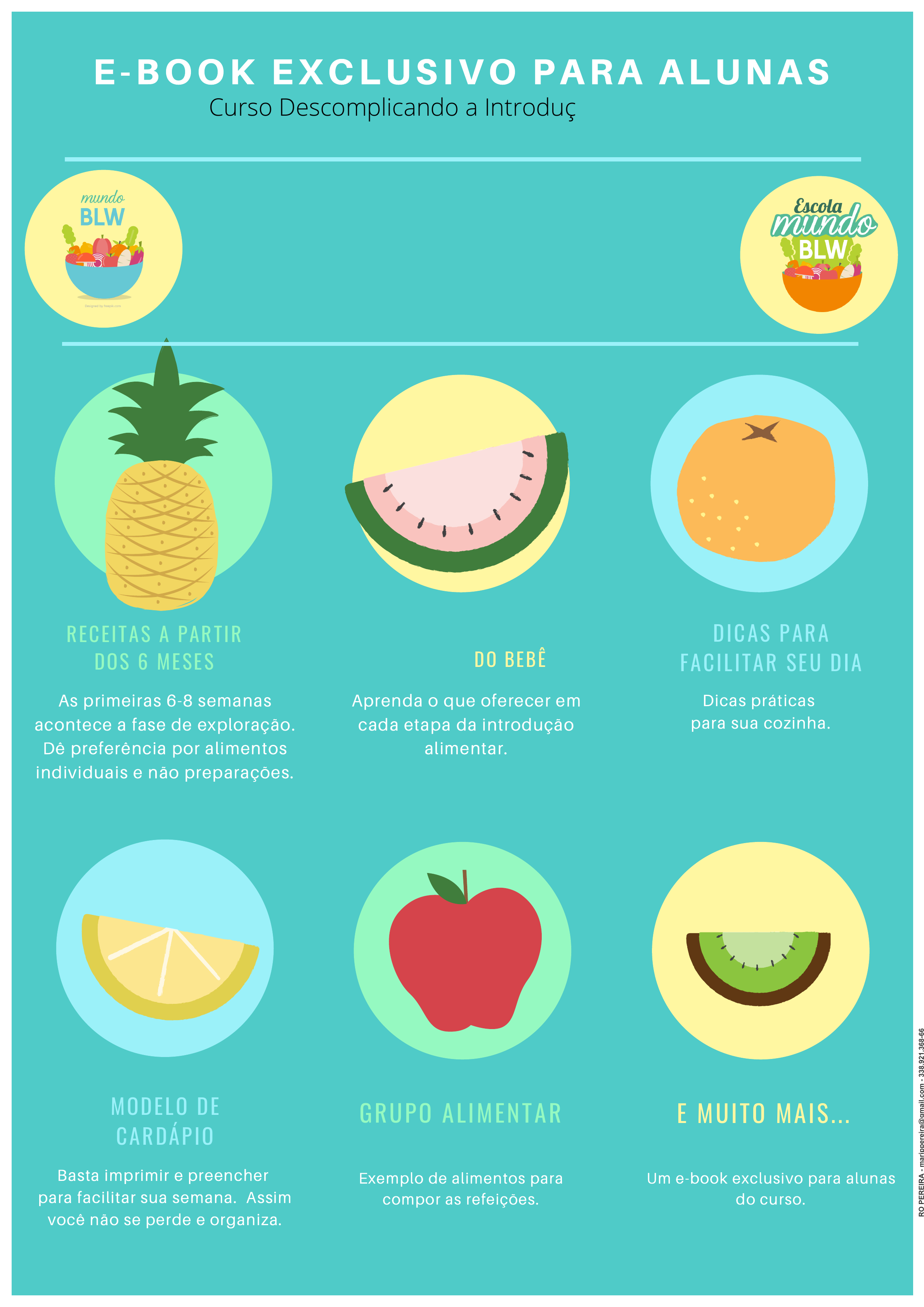 RECEITAS E DICAS PARA DESCOMPLICAR A INTRODUÇÃO ALIMENTAR E -BOOK EXCLUSIVO PARA ALUNAS RECEITAS A PARTIR DOS 6 MESES As primeiras 6-8 semanas acontece a fase de exploração. Dê preferência por alimentos individuais e não preparações. RECEITAS DIVIDIDAS POR FASES DO BEBÊ Aprenda o que oferecer em cada etapa da introdução alimentar. DICAS PARA FACIL ITAR SEU DIA Dicas práticas para sua cozinha. MODELO DE CARDÁPIO Basta imprimir e preencher para facilitar sua semana. Assim você não se perde e organiza. GRUPO AL IMENTAR Exemplo de alimentos para compor as refeições. E MUITO MAIS . . . Um e-book exclusivo para alunas do curso. Curso Descomplicando a Introdução Alimentar L ic en se d t o M A R IA N A P E D R O P E R E IR A - m ar ip p er ei ra @ g m ai l.c o m - 3 38 .9 21 .3 68 -6 6 DICAS PARA FACILITAR SEU DIA A DIA E NÃO GERAR DESPERDÍCIO. Você irá começar pelo seu freezer. Ter um freezer pequeno não é motivo para não se organizar ou congelar comida. A primeira etapa do processo é avaliar e limpar seu freezer. Veja o que há nele, observe a data de validade do que está armazenado e descarte o que já venceu. Jogue fora, também, aquilo que está há tempos guardado e não foi consumido. O que restar em seu freezer, procure consumir o quanto antes, não apenas para evitar o desperdício, mas, também, porque você precisa ter espaço. L ic en se d t o M A R IA N A P E D R O P E R E IR A - m ar ip p er ei ra @ g m ai l.c o m - 3 38 .9 21 .3 68 -6 6 VERIFIQUE OS INGREDIENTES QUE VOCÊ JÁ POSSUI. Você deve avaliar o que tem em seus armários e geladeira, assim, pode criar um cardápio baseado nos ingredientes que você já possui. Assista a aula sobre cozinha criativa que está na plataforma do curso e veja como desbloquear a mente para criar com ingredientes que já temos. CRIE SEU CARDÁPIO. Agora é hora de criar o cardápio. Já sabendo o que você irá reaproveitar em sua cozinha, você irá criar o cardápio de acordo com o que possui,adequado ao paladar de sua família. Imprima um modelo de cardapio na próxima página e depois é só colar na geladeira e elaborar seus pratos para a semana. L ic en se d t o M A R IA N A P E D R O P E R E IR A - m ar ip p er ei ra @ g m ai l.c o m - 3 38 .9 21 .3 68 -6 6 Cardápio Cardápio semanalsemanal Segunda Quarta Sexta Domingo Terça Quinta Sábado L ic en se d t o M A R IA N A P E D R O P E R E IR A - m ar ip p er ei ra @ g m ai l.c o m - 3 38 .9 21 .3 68 -6 6 GRUPOS ALIMENTARES. BRANQUINHO, AMANDA PAPINHA PRÁTICA: O GUIA COMPLETO DA ALIMENTAÇÃO COMPLEMENTAR BRASIL IA , 2019 ISBN: 978 -85 -921079 -0 -1 L ic en se d t o M A R IA N A P E D R O P E R E IR A - m ar ip p er ei ra @ g m ai l.c o m - 3 38 .9 21 .3 68 -6 6 Cebola e alho já picados Cebolinha, salsinha, manjericão, coentro... Espinafre, couve, vagem, cenoura ralada (você pode usar para turbinar o arroz, molho de tomate) Abóbora cabotiá e beterraba ralada picada pode ser usada para turbinar o feijão. Veja o que você mais usa e congele Congele em forminhas de gelo tudo que você sempre usa. Assim você vai otimizar seu tempo. Por Exemplo: PLANEJAMENTO E OTIMIZAÇÃO DO TEMPO. L ic en se d t o M A R IA N A P E D R O P E R E IR A - m ar ip p er ei ra @ g m ai l.c o m - 3 38 .9 21 .3 68 -6 6 CONGELAMENTO E ARMAZENAMENTO. Coloque a refeição na travessa, pote de vidro, pote de plástico (deve ser resistente ao congelamento e livre de bisfenol), sacos ziplock (próprios para alimentos e livres de bisfenol) e deixe esfriar (fora da geladeira não deve passar de 1 hora devido ao risco de contaminação). A travessa ou pote deve ser tampado e levado ao freezer após com o alimento ainda quente. Este processo evita a criação de gotículas de água e isto pode causar alteração de textura e sabor, principalmente em legumes. Caso a travessa não tenha tampa, enrole em papel filme antes do congelamento. L ic en se d t o M A R IA N A P E D R O P E R E IR A - m ar ip p er ei ra @ g m ai l.c o m - 3 38 .9 21 .3 68 -6 6 DESCONGELAMENTO. Retire do freezer no dia anterior e deixe descongelando na geladeira (12 horas). No dia do preparo, leve ao forno na temperatura indicada na receita. É possível, também, fazer o descongelamento diretamente no forno, sem realizar o pré descongelamento antes. Neste caso, o tempo de forno chega ao dobro do tempo normal. Outra forma segura é descongelar em banho maria. Ou em alguma panela no fogo. L ic en se d t o M A R IA N A P E D R O P E R E IR A - m ar ip p er ei ra @ g m ai l.c o m - 3 38 .9 21 .3 68 -6 6 ARMAZENAMENTO. Todos os alimentos devem ser lavados e higienizados antes do congelamento. Legumes e verduras: podem passar pelo processo de branqueamento após o cozimento para poder conservar a cor e evitar que passe do ponto de cocção. Arroz e feijão podem ser congelados diretamente depois do cozimento. Cubra com plástico filme para evitar que se formem pedrinhas de gelo. Carnes: devem ser congeladas sempre frescas e sem tempero (forma de manter os nutrientes da carne). Já congele porções para evitar que precise descongelar tudo e assim também se evita o desperdício. L ic en se d t o M A R IA N A P E D R O P E R E IR A - m ar ip p er ei ra @ g m ai l.c o m - 3 38 .9 21 .3 68 -6 6 TEMPERO IDEAL PARA CADA ALIMENTO. Louro: excelente para feijão, molho de tomate, sopa, carne suína e bovina. Alecrim: legumes (batata), carne bovina, carne suína e aves. Cheiro verde: combina com quase tudo. Utilizada para finalizar pratos como: abóbora catiá, omelete, sopa, saladas, legumes, carnes. Cúrcuma: dá cor, aroma e sabor. Frango, peixe, arroz, risotos. Coentro: muito usado em frutos do mar. Orégano: molho de tomate, saladas, queijos e ovos. Pimenta do reino: dá sabor para quase todos os pratos. Molhos, carnes e massas. Páprica: excelente para legumes assados. Alho poró: carnes, recheios, risotos. L ic en se d t o M A R IA N A P E D R O P E R E IR A - m ar ip p er ei ra @ g m ai l.c o m - 3 38 .9 21 .3 68 -6 6 ORIENTA