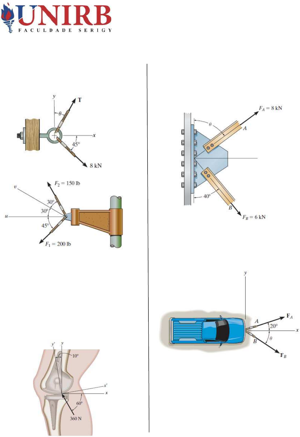 1 DISCIPLINA: Mecânica Básica PROFESSOR: Deybson Melo Lista de Exercícios – 01 1- Se o30 e T = 6 KN, determine a intensidade da força resultante que atua sobre a argola e sua direção, medida no sentido horário a partir do eixo x positivo. 2- a) Determine a intensidade da força resultante que atua sobre o suporte e sua direção, medida no sentido anti- horário a partir do eixo u positivo. b) Decomponha 1F em componentes ao longo dos eixos u e v, e determine suas intensidades. c) Decomponha 2F em componentes ao longo dos eixos u e v, e determine suas intensidades. 3- O dispositivo é usado para a substituição cirúrgica da articulação do joelho. Se a força que atua ao longo da perna é 360N, determine suas componentes ao longo dos eixos x, x´, y e y´. 4- Determine o ângulo para conectar o membro A à chapa de modo que a força resultante de AF e BF seja direcionada horizontalmente para a direita. Além disso, informe qual é a intensidade da força resultante. 5- A caminhonete precisa ser rebocada usando duas cordas. Determine as intensidade das forças AF e BF que atuam em cada corda para produzir uma força resultante de 950N, orientada ao longo do eixo x positivo. Considere o50 . 6- Se o30 e 2F = 6 kN, determine a intensidade da força resultante que atua sobre a chapa e sua direção, medida no sentido horário a partir do eixo x positivo. 2 7- Três correntes atuam sobre o suporte, de modo a criarem uma força resultante com intensidade de 500 lb. Se duas forças das correntes estão submetidas a forças conhecidas, como mostra a figura, determine o ângulo da terceira corrente, medida no sentido horário a partir do eixo x positivo, de modo que a intensidade da força F nessa corrente seja mínima. Todas as forças estão localizadas no plano xy. Qual é a intensidade de F? Dica: Determine primeiro a resultante das duas forças conhecidas. A força F atua nessa mesma direção. 8- A tora deve ser rebocada por dois tratores A e B. Determine as intensidades das duas forças de reboque AF e BF , levando-se em conta que a força resultante tenha uma intensidade KNFR 10 e seja orientada ao longo do eixo x. Considere o15 . 9- Se NF 6001 e o30 , determine a intensidade da força resultante que atua sobre a argola e sua direção, medida no sentido horário a partir do eixo x positivo. 10- Se a intensidade da força resultante que atua sobre a chapa precisa ser 6 KN e sua direção no sentido horário do eixo x positivo é o30 , determine a intensidade de 2F e sua direção . 3 11- Determine a intensidade e a direção de BF de modo que a força resultante seja direcionada ao longo do eixo y positivo e tenha uma intensidade de 1500 N. 12- Determine a intensidade e a direção medida no sentido anti-horário a partir do eixo x positivo da força resultante que atua sobre o anel em O se NFA 750 e o45 . 13- As três forças são aplicadas no suporte. Determine a faixa de valores para a intensidade da força P, de modo que a resultante das três forças não exceda 2400 N. 14- Expresse cada uma das forças que atuam sobre o suporte na forma vetorial cartesiana com relação aos eixos x e y. Determine a intensidade e direção de 1F de modo que a força resultante seja direcionada ao longo do eixo x’ positivo e tenha uma intensidade NFR 600 . 15- Determine a força em cada corda para o equilíbrio da caixa de 200 Kg. A corda BC permanece na horizontal devido ao rolete em C, e AB tem um comprimento de 1,5m. Considere y = 0,75m. 16- Se os cabos BD e BC podem suportar uma força de tração máxima de 20 KN, determine a massa máxima da viga que pode ser suspensa pelo cabo AB, de modo que nenhum cabo se rompa. O centro de massa da viga está localizado no ponto G. 4 17- O pendente de reboque AB está submetido à força de 50 KN exercida por um rebocador. Determine a força em cada um dos cabos de amarração, BC e BD, se o navio está se movendo para frente em velocidade constante. 18-Se o bloco B pesa 1 KN e o bloco C pesa 0,5 KN, determine o peso do bloco D e do ângulo para o equilíbrio. 19- Determine a tração desenvolvida nos cabos CA e CB necessária para o equilíbrio do cilindro de 10 Kg. Considere o40 . 20- Determine a tração desenvolvida em cada um dos fios usados para sustentar o candelabro de 50 kg.