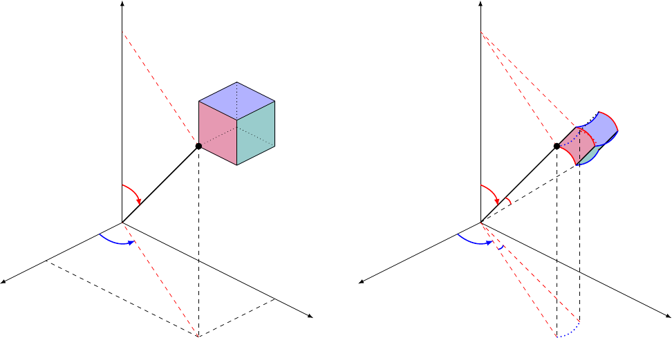 Apêndice E Coordenadas Esféricas Considere a Fig. E.1, que mostra a definição de coordenadas esféricas (r, θ, φ) em termos de co- ordenadas cartesianas (x, y, z) para qualquer ponto no espaço tri-dimensional. As coordenadas angulares θ e φ representam a longitude e latitude que caracterizam qualquer ponto em uma esfera de raio r. x y z r y r sin θ sinφx r si n θ cos φ z r sin θ r cos θ θ φ dy dx dz r sin θdφ x y z r z r sin θ r sin θ θ φ dθ dφ rdθ r sin θdφ dr r sin θdφ Figura E.1: Definição de coordenadas esféricas (r, θ, φ) em termos de coordenadas cartesianas (x, y, z). O elemento de volume é dado por dV = dxdydz em coordenadas cartesianas e dV = r2 sin θdθdφdr em coordenadas esféricas. Da figura temos: x = r sin θ cosφ y = r sin θ sinφ z = r cos θ (E.1) 127 128 APÊNDICE E. COORDENADAS ESFÉRICAS O elemento de volume em coordenadas cartesianas é dV = dxdydz (E.2) enquanto em coordenadas esféricas ele é dV = (r sin θdφ)(rdθ)dr = r2 sin θdrdθdφ (E.3) Podemos também usar o jacobiano da transformação de coordenadas para obter este resultado. Das Eqs. E.1, temos os diferenciais: dx = sin θ cosφdr + r cos θ cosφdθ − r sin θ sinφdφ (E.4) dy = sin θ sinφdr + r cos θ sinφdθ + r sin θ cosφdφ (E.5) dz = cos θdr − r sin θdθ (E.6) ou em termos matriciais dx dy dz = sin θ cosφ r cos θ cosφ −r sin θ sinφ sin θ sinφ r cos θ sinφ r sin θ cosφ cos θ −r sin θ 0 ︸ ︷︷ ︸ A= ∂(x,y,z) ∂(r,θ,φ) dr dθ dφ (E.7) onde a matrix de transformação A = ∂(x,y,z) ∂(r,θ,φ) . O jacobiano (J = detA = |A|) é J = detA = ∣ ∣ ∣ ∣ ∂(x, y, z) ∂(r, θ, φ) ∣ ∣ ∣ ∣ = (r cos θ cosφ)(r sin θ cosφ)(cos θ) + (−r sin θ sinφ)(−r sin θ)(sin θ sinφ) −(cos θ)(r cos θ sinφ)(−r sin θ sinφ)− (−r sin θ)(r sin θ cosφ)(sin θ cosφ) = r2 sin θ cos2 θ cos2 φ+ r2 sin3 θ sin2 φ +r2 sin θ cos2 θ sin2 φ+ r2 sin3 θ cos2 φ = r2(sin θ cos2 θ + sin3 θ) = r2 sin θ (E.8) Assim, dV = dxdydz = ∣ ∣ ∣ ∣ ∂(x, y, z) ∂(r, θ, φ) ∣ ∣ ∣ ∣ drdθdφ = r2 sin θdrdθdφ (E.9) Para problemas com simetria esférica, podemos ter uma função que dependa apenas da coor- denada radial r, i.e. f = f(r). Neste caso, a integral de volume desta função fica: ∫∫∫ f(r)dV = ∫∫∫ f(r)r2 sin θdrdθdφ = ∫ r 0 dr ∫ π 0 dθ ∫ 2π 0 dφf(r)r2 sin θ = ∫ 2π 0 dφ ︸ ︷︷ ︸ =2π ∫ π 0 sin θdθ ︸ ︷︷ ︸ =− cos θ|π0=2 ∫ r 0 f(r)r2dr = ∫ r 0 f(r) 4πr2dr (E.10) Ou seja, com simetria esférica o elemento de volume dV = 4πr2dr é simplesmente uma casca esférica de área 4πr2 e espessura dr. Coordenadas Esféricas