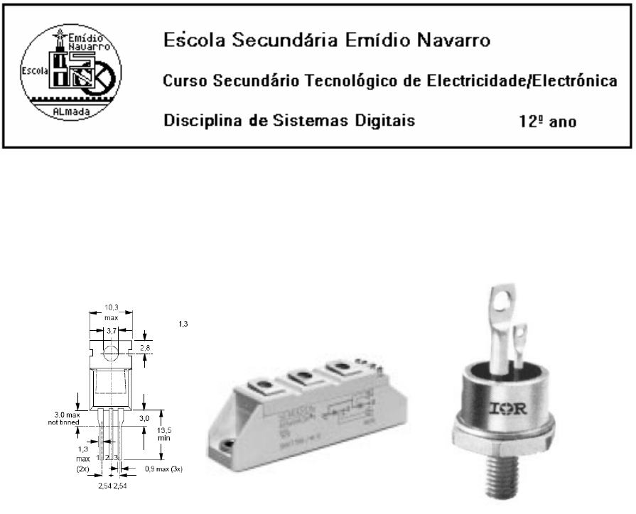 O SCR (Tiristor) O SCR é um rectificador de silício que funciona essencialmente como um interruptor estático unidireccional, isto é, abre ou fecha um circuito através da aplicação de uma pequena tensão num dos seus terminais, não possuindo por isso qualquer contacto mecânico, o que tem como vantagem um grande aumento do seu tempo de vida útil. Utiliza-se fundamentalmente no controlo de potência, quer em circuitos de corrente contínua quer de corrente alternada, 1.1 SIMBOLOGIA E PRINCÍPIO DE FUNCIONAMENTO O SCR é um dispositivo semicondutor de silício constituído por quatro camadas PN dispostas alternadamente conforme mostra a figura A. Na figura B apresenta-se o seu símbolo que se assemelha a um díodo com um terminal de controlo. Figura 1 – Estrutura de junções e símbolo de um SCR (Tiristor) Com efeito, o SCR, tal como um díodo, só conduz corrente no sentido do ânodo para o cátodo, mas apenas quando lhe aplicamos um sinal de tensão no terminal chamado GATE. Na figura seguinte podemos ver um esquema que representa o seu circuito equivalente. Figura 2 – Circuito equivalente de um SCR As quatro camadas estão dispostas por forma a que funcionem como dois transistores, um PNP e outro NPN, ligados de uma forma regenerativa. Para funcionar, o SCR deverá ser ligado num circuito tal como se mostra na figura de baixo. Figura 3 – Esquema de circuito para traçado das características de um SCR O ânodo deverá estar positivo em relação ao cátodo. Se não enviarmos qualquer sinal de GATE ao SCR, este permanecerá bloqueado pois nenhum dos transístores estará em condução. Enviando um curto impulso de tensão entre a GATE e o CÁTODO o transistor T1 receberá na sua base uma corrente que será amplificada β vezes no colector. Esta corrente de colector colocará o transistor T2 em condução. Por sua vez a condução de T2 (corrente no colector, IC2) fará com que exista corrente na base de T1 mantendo-o em condução. Figura 4 - Modelo do SCR por dois transístores bipolares (correntes) Verificamos assim que T1 mantém em condução T2 e T2 mantém em condução T1. Não é, portanto, necessário que a tensão na GATE esteja permanentemente aplicada. Estando T2 e T1 em condução fluirá uma corrente do ÂNODO para o CÁTODO cujo valor é limitado apenas pela resistência externa RS. O SCR em condução apresentará uma pequena queda de tensão aos seus terminais, cerca de 1,2 a 1,4 VOLTS ( VAK = VEC2 + VBEl ). S BEECS AK R VVV I )( 12 +− = Figura 5 – Modelo do SCR por dois transístores bipolares (tensões) De notar que se o SCR estiver inversamente polarizado, não entrará em condução de forma alguma pois a corrente não poderá contrariar o sentido das correntes dos transistores. RESUMO: Figura 6 – Símbolo e circuito equivalente de um SCR (Tiristor) • O SCR estará correctamente polarizado se o ÂNODO estiver mais positivo que o CÁTODO. • O SCR só entra em condução se lhe for aplicada uma tensão entre a GATE e o CÁTODO. • O SCR comporta-se como um interruptor unidireccional apresentando aos seus terminais uma pequena queda de tensão (1,2 a 1,4 VOLTS). 1.2 CARACTERÍSTICA TENSÃO - CORRENTE A característica U/I de um SCR traça-se dando valores de tensão entre o ânodo e o cátodo e registando a evolução dos valores da corrente que atravessam o SCR. O SCR tanto pode estar directa como inversamente polarizado, sendo o seu comportamento completamente distinto numa e noutra situação. Assim vamos analisar a característica U/I do SCR dividida em duas: CARACTERÍSTICA DIRECTA 0≥AKV CARACTERÍSTICA INVERSA 0<AKV 1.2.1 CARACTERÍSTICA DIRECTA Para o traçado da característica directa do SCR utilizaremos o circuito da figura seguinte. Figura 7 – Esquema de circuito para traçado da característica directa Com o interruptor do circuito da gate aberto, verifica-se que, para baixas tensões ânodo-cátodo, designadas por VD, o SCR conduz apenas uma pequena corrente, ID, chamada corrente de fugas. Figura 8 – Curva característica directa (corrente de fuga directa) Continuando a aumentar o valor de VF, a corrente ID mantém-se praticamente constante, conforme se vê no gráfico. Só quando alcança um determinado valor de VD é que o SCR entra em condução e observamos então que circula uma corrente ID elevada, limitada apenas pela resistência de carga, RS. A tensão aos terminais do SCR cai para valores muito baixos. Ao valor da tensão que colocou o SCR em condução sem necessitar de impulso de gate chama-se TENSÃO DE RUPTURA NO SENTIDO DIRECTO e designa-se por VBO Figura 9 – Curva característica directa completa Podemos ainda observar que para um grande aumento de ID o valor de VD aumenta ligeiramente, mantendo-se baixo (cerca de 1,4 V). Na página seguinte temos traçada a mesma característica, mas onde estão assinalados dois valores de corrente importantes. Figura 10 – Definição das Correntes IH e IL IH ( HOLDING CURRENT) É a mínima corrente necessária que deve circular no SCR para que este, estando em condução, não passe ao estado de bloqueio. Com efeito conforme se pode observar na característica, o SCR manter-se-á em condução desde que a corrente que o atravessa seja suficiente para manter o processo regenerativo dos dois transistores (circuito equivalente do SCR) na ausência de sinal de gate. Se a corrente se tornar inferior a IH, que é da ordem dos mA, então os dois transistores entrarão no corte e o SCR bloqueia, não deixando passar corrente. IL (LATCHING CURRENT) É a corrente mínima necessária que se estabelece no circuito no instante que o SCR vai passar de bloqueado a condutor. Esta corrente é normalmente superior a IH. APLICACÃO DA CORRENTE DE GATE O que até agora vimos foi a entrada em condução do SCR, sem necessitar do sinal de gate por aplicação de uma tensão ânodo-cátodo (V AK) igual ou superior a VBO. No entanto, este método não é o mais utilizado, uma vez que pode levar