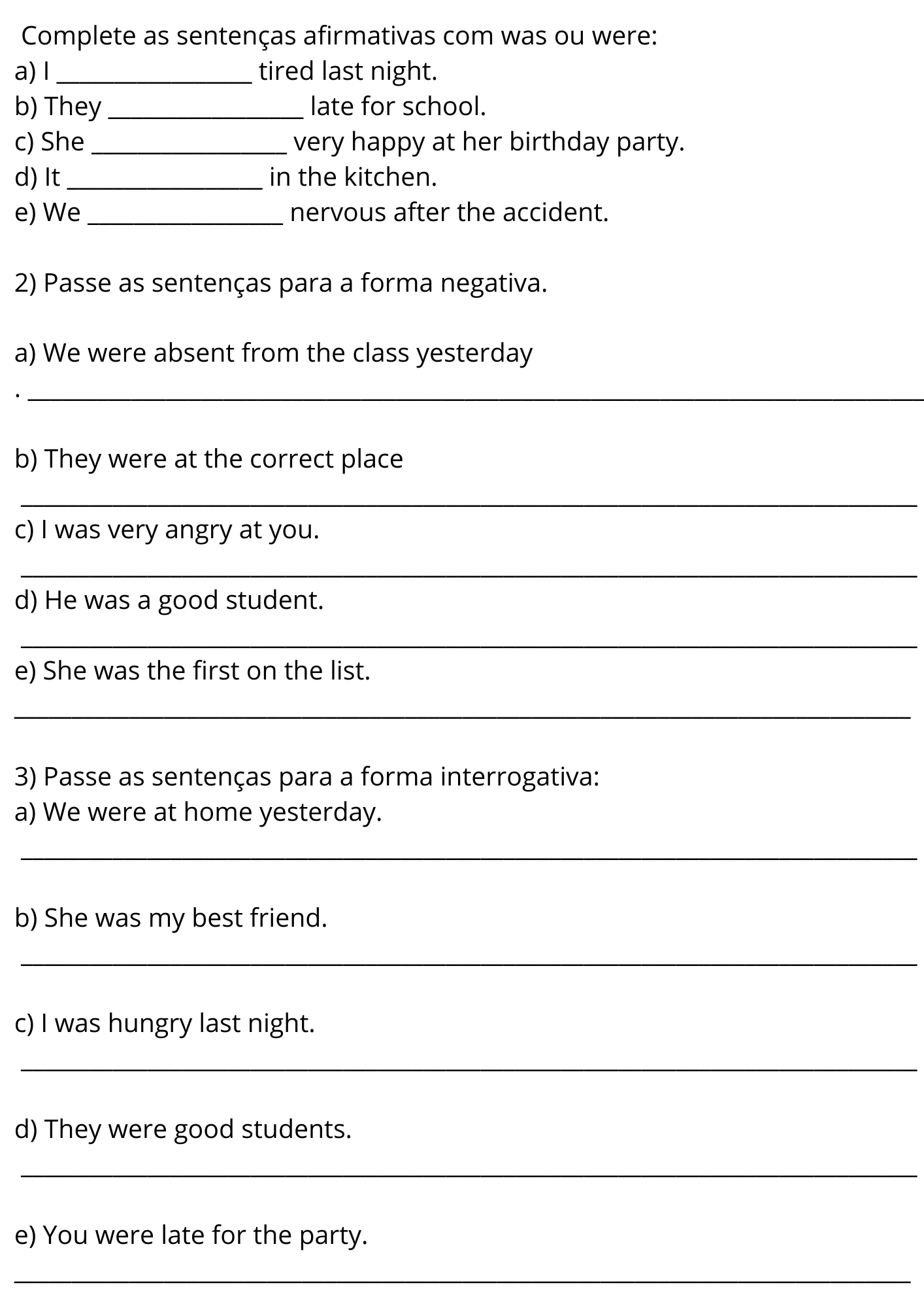 Complete as sentenças afirmativas com was ou were: a) I tired last night. b) They late for school. c) She very happy at her birthday party. d) It in the kitchen. e) We nervous after the accident. 2) Passe as sentenças para a forma negativa. a) We were absent from the class yesterday b) They were at the correct place c) I was very angry at you. d) He was a good student. e) She was the first on the list. 3) Passe as sentenças para a forma interrogativa: a) We were at home yesterday. b) She was my best friend. c) I was hungry last night. d) They were good students. e) You were late for the party.