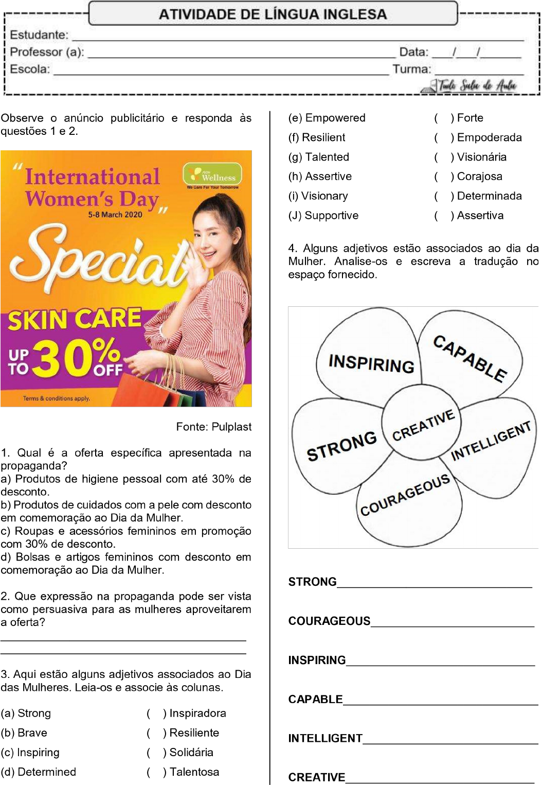 ATIVIDADE DE LÍNGUA INGLESA ALUNO: _________________________________________________________________ TURMA: _________ PROFESSOR: ___________________________________________________________ DATA: ___/___/_____ ESCOLA: _________________________________________________________________________________ 1. A partir da imagem abaixo, em que data o Dia da Mulher é celebrado? Fonte: LiveLaw a) Todo ano. b) 8 de março c) Mensalmente. d) Todo dia Leia o texto e responda às questões 2 e 3. International Women's Day International Women's Day celebrates women's achievements, highlights their struggles for equality, and emphasizes the importance of empowering women globally. It prompts reflection on gender equality issues and calls for solidarity in advocating for women's rights. This day serves as a reminder to strive for a more inclusive and equitable society where women have equal opportunities to thrive. TSA/2024 2. Marque as afirmações que falam do propósito do Dia Internacional da Mulher, de acordo com o texto. ( ) Promover a reflexão sobre questões de igualdade de gênero. ( ) Estabelecer divisões entre homens e mulheres. ( ) Celebrar as conquistas das mulheres. ( ) Destacar as lutas das mulheres por igualdade. 3. Cite alguns aspectos do papel das mulheres na sociedade enfatizados no texto. ____________________________________________________________________________________________________________________________________________________________________________________ Leia o texto e responda às questões 4, 5 e 6. Malala Yousafzai, born on July 12, 1997, in Mingora, Pakistan, rose to prominence as a global symbol of education and girls' rights advocacy. Growing up in the Swat Valley under Taliban rule, Malala defied the oppressive regime by speaking out for the right to education, particularly for girls. Her activism gained international attention when, at the age of 15, she survived an assassination attempt by the Taliban on her way home from school. Malala's unwavering determination and resilience propelled her onto the world stage, leading to numerous accolades, including the Nobel Peace Prize in 2014, making her the youngest Nobel laureate in history. She continues to champion education and social justice, inspiring millions around the world through her memoir "I Am Malala" and her ongoing advocacy efforts. Fonte: Mundo Educação. Adaptado por TSA/2024 4. Qual mulher está sendo retratada na biografia? Escreva também sua nacionalidade e data de nascimento. _______________________________________ _______________________________________ _______________________________________ 5. Como essa personalidade se tornou um símbolo global da defesa da educação e dos direitos das meninas? _______________________________________ _______________________________________ _______________________________________ 6. Que prêmio Malala recebeu em 2014? Por quê? _______________________________________ _______________________________________ _______________________________________ _______________________________________ _______________________________________ image6.jpeg image1.jpg image2.png image3.jpg image4.jpg image5.jpeg