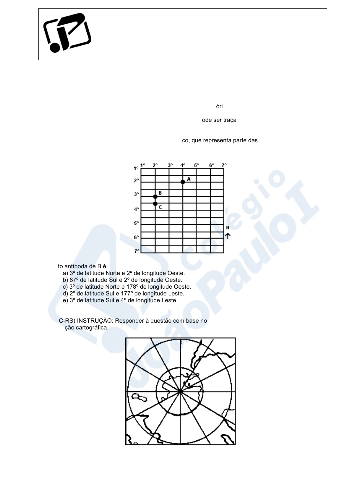 COLÉGIO JOÃO PAULO I GEOGRAFIA - EXERCÍCIOS PARA TRIMESTRAL 1 Professor(a): Richard 1) Sobre as coordenadas geográficas, assinale a alternativa correta. a) A longitude é determinada pelo ângulo formado pela posição de um determinado ponto e o plano meridional, podendo variar de zero a 90 graus. b) Coordenada geográfica é o ponto em que duas latitudes se cruzam. c) Tanto as latitudes quanto as longitudes são medidas em graus, minutos e segundos. d) Os principais paralelos e meridianos que cortam o território brasileiro são: Equador e Tordesilhas e) O paralelo é uma circunferência imaginária, que pode ser traçado até 180 vezes sobre a superfície terrestre. 2) (PUC-RS) Responder à questão com base no gráfico, que representa parte das coordenadas geográficas O ponto antípoda de B é: a) 3º de latitude Norte e 2º de longitude Oeste. b) 87º de latitude Sul e 2º de longitude Oeste. c) 3º de latitude Norte e 178º de longitude Oeste. d) 2º de latitude Sul e 177º de longitude Leste. e) 3º de latitude Sul e 4º de longitude Leste. 3) (PUC-RS) INSTRUÇÃO: Responder à questão com base no mapa e afirmativas abaixo, relacionadas à percepção cartográfica. I. Neste mapa aparece a porção meridional do Brasil e o Trópico de Câncer, localizado ao Sul do Equador. II. A área menos deformada deste mapa é o Pólo Sul, pois é uma Projeção Azimutal Polar. III. O mapa apresenta como ponto central o Pólo Norte, ficando em evidência o Círculo Polar Ártico. IV. Todos os continentes nessa projeção estão ao norte do seu centro. V. Entre os meridianos apresentados existem dois fusos horários. VI. Análise das afirmativas permite concluir que está correta a alternativa a) I, II e III b) I, III e V c) II, IV e V d) II e IV e) III e V 4) (UFMT) :"Linhas imaginárias traçadas de pólo a pólo, atravessando a linha do Equador, perpendicularmente." O texto define: a) latitudes b) longitudes c) paralelos d) meridianos e) círculos polares 5) (UFRN) Uma cidade está localizada a 5cm de outra, medidos sobre um mapa de escala 1:200.000. Desprezando as distorções normais de uma projeção, marque a opção que indica a distancia real (no terreno) entre as cidades. a) 5km. b) 100km. c) 10km. d) 50km . e) 1000km 6) (PUC-PR) Sobre a orientação, pode-se afirmar corretamente. a) O espaço entre o sudeste e o noroeste tem dois pontos cardeais, dois pontos colaterais e cinco subcolaterais, partindo de qualquer direção. b) A representação gráfica da orientação é feita através da coordenadas geográficas. c) A distância sudoeste-sudeste é de 180°. d) A distância leste-oeste é de 180°. e) O espaço entre o ponto colateral noroeste e o ponto colateral sudeste, sentido horário, tem dois pontos colaterais e seis pontos subcolaterais. 7) (UEPG-PSS) Se, em determinado mapa, a distância de 250 km entre duas cidades é representada com 10 cm, qual é a escala desse mapa? a) 1: 2.500 b) 1: 25.000 c) 1: 250.000 d) 1: 2.500.000 e) 1: 25.000.000 8) (UNICANTO) A cartografia pode ser entendida como uma disciplina que abrange o desenvolvimento científico e a melhoria das técnicas usadas na comunicação dos dados relacionados espacialmente”. (SMALL, J.;WITHERICK, M. Dicionário de Geografia) Sobre cartografia, marque V (verdadeiro) ou F (falso) ( ) A indicação da escala utilizada é indispensável para a leitura adequada de produtos cartográficos. ( ) Na escala 1:20.000, 1 cm no mapa corresponde a 200 km na dimensão real. ( ) A escala 1:1 é denominada escala natural, porque a dimensão no desenho é a mesma da realidade. ( ) Quanto menor a escala de um a representação cartográfica, maiores e mais visíveis serão os detalhes de cada fenômeno representado. 9) (UEM) Os mapas ou cartas são formas de representação cartográfica da superfície terrestre e dos diversos aspectos naturais, econômicos, demográficos, sociais que nela ocorrem, elaborados em diversas escalas. Sobre esse tema, é correto afirmar que a) um mapa elaborado na escala 1:5.000.000 é considerado de grande escala, porque possibilita o detalhamento das informações. b) as curvas de nível ou isoetas, representadas em mapas, são linhas que unem pontos de diferentes altitudes. c) o mapa que representa a geologia é considerado um mapa ou carta base e o que representa a densidade demográfica é um mapa temático. d) o mapa topográfico é uma representação os rios e a altimetria da superfície terrestre. e) a escala do mapa indica a relação entre o tamanho representado e o tamanho real na superfície terrestre. 10) (UEM) Em um mapa na escala 1:1.000.000, três cidades brasileiras são representadas pelos pontos A, B e C. A distância do ponto A ao ponto B, localizado a leste de A, é 6 cm. Ao norte de A, localiza-se o ponto C, a uma distância de 8 cm. Assinale o que for correto. a) A distância real entre as cidades representadas pelos pontos B e C é 100 km. b) A distância real entre as cidades representadas pelos pontos A e B é 60 km. c) A distância real entre as cidades A e C é de 8km. d) A cidade C esta a sudoeste da cidade B e) Se a escala fosse 1:2000000, a distância real entre as cidades A e C seria de 16km. 11) (UFPR) A escala é definida como a relação da distância real entre dois pontos quaisquer na superfície da Terra com a distância entre esses dois pontos num documento cartográfico. Se, em uma carta, na escala 1:50.000, a distância em linha reta entre duas cidades for de 10 cm, no terreno essa distância será de: a) 5 km. b) 0,5 km. c) 1 km. d) 100 km. e) 500 km. 12) (UFRGS) Numa competição de balonismo, os competidores devem sair de Torres (RS) e chegar a Osório (RS), perfazendo uma distância de 102 km, em linha reta. A coordenação da competição distribuiu às equipes um mapa, em folha A4 (210 mm x 297 mm), com o trajeto e pontos de referência. Qual a escala apropriada para representar no mapa todo o trajeto percorrido em linha reta e os pontos de referê