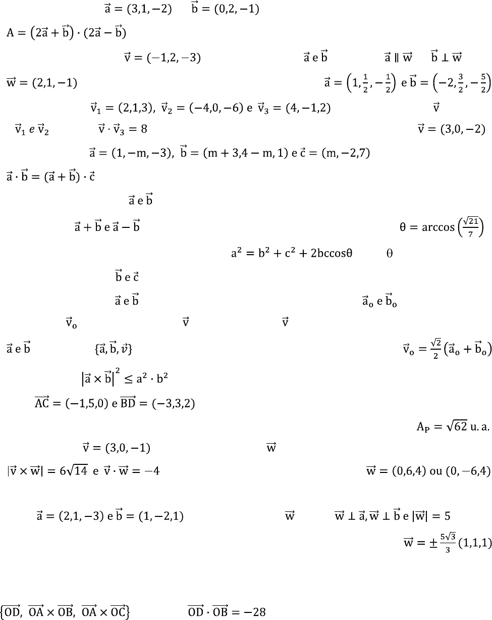 1 LISTA DE EXERCÍCIOS DE GEOMETRIA ANALÍTICA 01) Dados os vetores e , determine o valor da expressão vetorial . RResp: A=51 02) Decomponha o vetor em dois vetores tais que e , com . Resp: 03) Dados os vetores , determine o vetor ortogonal a e tal que . Resp: 04) Sejam os vetores . Determine m para que . Resp: m=2 05) Os módulos dos vetores são, respectivamente, 4 e 2. O ângulo entre eles é 60o. Calcule o ângulo entre . Resp: 06) Demonstre vetorialmente a lei dos co-senos: , onde é o ângulo entre as direções dos vetores . 07) São dados os vetores ortogonais entre si, tendo como versores , respectivamente. Determine , o versor do vetor , sabendo-se que tem projeções algébricas iguais sobre e ainda que são LD. Resp: 08) Demonstre que . Verificar quando ocorre a igualdade. 09) Sejam as diagonais de um paralelogramo ABCD. Calcule a área do paralelogramo. Resp: 10) Dado o vetor , determine o vetor ortogonal ao eixo Ox, sabendo-se que . Resp: 11) Demonstre vetorialmente que a área do losango é igual ao semi-produto das diagonais. 12) Dados , determine o vetor tal que . Resp: 13) São dados no espaço os pontos A(2,-1,0), B(1,-2,1) e C(1,0,2). Determine o ponto D, tal que sejam LD, e o volume do tetraedro OABD seja igual a 14, onde O é a origem do sistema. Resp: D(0,0,-28) ou D(12,24,8) 2 14) Calcule a distância do ponto A(3,-1,2) à reta determinada pelos pontos B(1,1,3) e C(5,3,-1). RResp: 15) Determine um vetor unitário ortogonal aos vetores . Resp: 16) Determine a distância do ponto D(2,3,3) ao plano determinado pelos pontos A(3,3,1), B(1,1,-3) e C(-1,-3,0). Resp: 17) Determine o valor de m de modo que o tetraedro determinado pelos vetores , e , tenha volume . Resp: m=1 ou m=5 18) Dois vértices de um triângulo são os pontos A(4,1,4) e B(5,6,1). Achar o vértice C sabendo que ele está sobre o eixo Oy, e a área do triângulo ABC é . Resp: C(0,4,0) ou C(0,6,0) 19) Achar um vetor paralelo ao vetor que tenha o mesmo módulo do vetor . Resp: 20) Achar um vetor de mesma direção e sentido do vetor e módulo . Resp: 21) Escreva as equações paramétricas da reta (r) que passa pela origem dos eixos coordenados e é paralela à reta (s): . Resp: 22) Escreva as equações simétricas da reta do feixe de centro A(5,-3,2) e paralela ao eixo Oz. Resp: 23) Determine os pontos de furo em relação aos planos coordenados da reta definida pelos pontos P(-1,1,3) e Q(4,-2,1). Resp: 24) Verificar o paralelismo entre as retas (r) e (s) nos seguintes casos: a) Resp: a) paralelas b) Resp: b) paralelas c) Resp: c) não paralelas 25) Determine as equações simétricas e o comprimento da mediana AM do triângulo ABC com A(-3,-1,4), B(2,4,5) e C(0,-2,1). Resp: 3 26) Verifique se os pontos A(3,-2,1) e B(-1,2,0) pertencem à reta (r) determinada pelos pontos C(2,1,-1) e D(4,-5,3). Resp: 27) Verificar se as retas e (s): e , são coplanares e determinar a interseção, se houver. Resp: coplanares e 28) Determine a equação vetorial da reta (r) que passa por P(1,-2,3) e intercepta a reta e cujo vetor diretor da reta (r) é ortogonal ao vetor . Resp: (r): X=(1,-2,3)+t(17,9,10) 29) Determine o ponto O', simétrico da origem O dos eixos coordenados, em relação à reta. . Resp: 30) Decomponha o vetor em dois vetores e , sendo (r) a reta X=(2,-1,5)+t(-1,4,2). Resp: 31) Determine os co-senos diretores da reta definida pelos pontos A(3,-3,2) e B(4,-1,0). Resp: 32) Determine o ângulo da reta (r): X=(2,0,1)+t(-1,-2,-2) com a reta definida pelos pontos A(4,0,-1) e B(-2,-3,1). Resp: 33) Determine as equações simétricas da reta definida pelos pontos A(2,-1,4) e com . Resp: 34) Um vetor diretor de uma reta (r) é o vetor e tal que e . Sendo , determine o ângulo entre a reta (r) e o vetor . Resp: 35) Dados os pontos médios M(2,1,3), N(5,3,-1) e P(3,-4,0) dos lados de um triângulo ABC, determine as equações paramétricas do lado deste triângulo, cujo ponto médio é o ponto M. Resp: 36) Determine o ângulo entre as retas, cujos vetores diretores e são parcelas do vetor diretor da reta AB, na qual A(2,3,-1) e B(4,-3,5), sabendo-se que e . Resp: 37) Escreva a equação cartesiana do plano determinado pelas retas e . Resp: ( ): 7x-3y-9z+13=0 4 38) Determine na forma simétrica a equação da reta que passa pelo ponto P(2,3,-1) e é paralela aos planos ( 1): 2x-3y+z-1=0 e ( 2): x+2y+3z+8=0. RResp: 39) Ache a equação cartesiana do plano que passa pelo ponto M(3,0,-4) e é perpendicular aos planos ( 1): 2x-y-z=0 e ( 2): x+3y-z+12=0. Resp: 4x+y+7z+16=0 40) Determine na forma simétrica a reta que passa pelo ponto P(3,-2,0) e é perpendicular ao plano ( ): 4x-8y+6z-7=0. Resp: 41) Determine a equação geral do plano que passa pela reta (r): e é paralelo à reta . Resp: 3x-2y-2z-1=0 42) Dê a equação da reta interseção dos planos ( 1): 3x-4y+z-16=0 e ( 2): 2x+4y-2z+4=0. Resp: 43) Determine a equação do plano que passa pelos pontos P(2,1,0) e Q(1,5,8) e é perpendicular ao plano ( ): x+2y+2z+5=0. Resp: 4x-5y+3z-3=0 44) Determine a equação do plano que passa pela reta (r) = 1 2, onde ( 1): 3x+2y+5z+6=0 e ( 2): x+4y+3z+4=0 e é paralelo à reta (s): X=(1,5,-1)+t(3,2,-3). Resp: 2x+3y+4z+5=0 45) Mostre que a reta é paralela ao plano ( ): 2x+2y-2z-4=0. 46) Mostre que a reta está contida no plano ( ): 4x-2y+5z-20=0. 47) Qual a posição relativa entre os planos ( 1): 5x+3y+13z-1=0 e ( 2): 3x+8y-3z+8=0 e determinea interseção, se houver. Resp: Perpendiculares e 48) A interseção das retas (r): X=(3,-1,2)+t(1,3,-2) e (s): X’=(1,-2,5)+t’(-3,-4,5) é um ponto P. Determine a distância de P ao plano ( ): x+y+z-2=0. Resp: 49) Determine a distância do ponto P, interseção dos planos ( 1): 2x+4y-5z-15=0, ( 2): x- y+2z+3=0 e ( 3): x+y+z-2=0 a reta (r): X=(0,1,-2)+t(3,2,-1). Resp: 50) Determine a equação da reta que é a interseção dos planos ( 1): 2x-y+4z-1=0 e ( 2): 3x+y- 2z+5=0. Resp: 51) Determine a equação do plano que contém o ponto P(2,-1,0) e a reta (r) = 1 2, onde ( 1): 2x-y-z+4=0