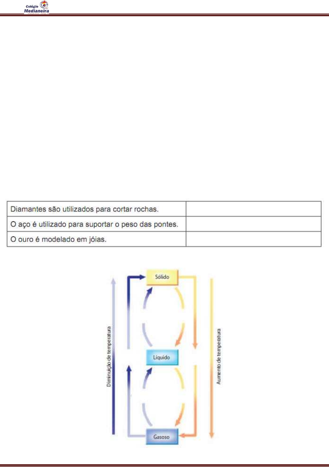 LISTA DE EXERCÍCIOS – QUÍMICA / 9º ANO Educador Rodrigo Marinho Fernandes – CIÊNCIAS / 9º ano – Colégio Medianeira, Santiago / RS Página 1 1. Ao colocar uma pedra de gelo em um copo com água, ou outra bebida qualquer, notamos que o gelo fica flutuando e que o nível da água no copo sobe proporcionalmente à quantidade de gelo que é adicionada. Explique o fenômeno descrito acima descrevendo as propriedades gerais e específicas da matéria envolvida. _______________________________________________________________________________________ _______________________________________________________________________________________ _______________________________________________________________________________________ _______________________________________________________________________________________ _______________________________________________________________________________________ 2. Explique por que, considerando materiais com mesmo volume, é a densidade de cada material que determinará suas massas. _______________________________________________________________________________________ _______________________________________________________________________________________ _______________________________________________________________________________________ _______________________________________________________________________________________ _______________________________________________________________________________________ 3. Complete a tabela abaixo com as propriedades dos sólidos citados. 4. Complete o esquema abaixo indicando as mudanças de estado físico em cada caso ilustrado. LISTA DE EXERCÍCIOS – QUÍMICA / 9º ANO Educador Rodrigo Marinho Fernandes – CIÊNCIAS / 9º ano – Colégio Medianeira, Santiago / RS Página 2 5. Por que a panela de pressão permite que se cozinhem mais rapidamente os alimentos em água? _______________________________________________________________________________________ _______________________________________________________________________________________ _______________________________________________________________________________________ _______________________________________________________________________________________ _______________________________________________________________________________________ 6. Explique, utilizando como critério o nível de vibração das moléculas, os três estados da matéria. Sólido:__________________________________________________________________________________ _______________________________________________________________________________________ Líquido:_________________________________________________________________________________ _______________________________________________________________________________________ Gasoso:_________________________________________________________________________________ _______________________________________________________________________________________ 7. A água que nos bebemos é pura? Quando dizemos, no dia a dia, que a água é pura, o que isso significa de fato? _______________________________________________________________________________________ _______________________________________________________________________________________ _______________________________________________________________________________________ 8. Analise os tipos de separação de misturas expostos abaixo. I. Método de separação que se baseia na diferença de densidade. II. Método de separação que se baseia na diferença de tamanho das partículas. III. Método de separação que se baseia na diferença da temperatura de ebulição. As definições acima se referem, respectivamente, a: *MARQUE A ÚNICA ALTERNATIVA CORRETA a) destilação, filtração, decantação b) filtração, destilação, decantação c) decantação, filtração, destilação d) decantação, destilação, filtração 9. Um cubo de pau-brasil com 2,0 cm de aresta tem massa igual a 3,5 g. Com base nessa informação, responda: a) Qual a densidade do pau-brasil? b) Essa madeira flutua em água? Justifique. (Densidade da água = 1,0 g/cm 3 ) _______________________________________________________________________________________ _______________________________________________________________________________________ _______________________________________________________________________________________ LISTA DE EXERCÍCIOS – QUÍMICA / 9º ANO Educador Rodrigo Marinho Fernandes – CIÊNCIAS / 9º ano – Colégio Medianeira, Santiago / RS Página 3 10. O gráfico abaixo representa a variação de temperatura observada ao se aquecer uma substância A durante cerca de 80 minutos. a) A faixa de temperatura em que a substância A permanece sólida é ___________________. b) A faixa de temperatura em que a substância A permanece líquida é ___________________. c) A temperatura de ebulição da substância A é _____________________________________. 11. Considere a tabela a seguir, onde estão relacionados os pontos de fusão e de ebulição de algumas substâncias sob pressão de 1 atm (lê-se uma atmosfera ). Qual o estado físico dessas substâncias à temperatura ambiente (25 °C)? a) Oxigênio: ______________________________________________________________________ b) Fenol: _________________________________________________________________________ c) Pentano: _______________________________________________________________________ 12. Considere as seguintes tarefas realizadas no dia-a-dia de uma cozinha. Indique com (F) aquelas que envolvem transformações físicas e com (Q) as que envolvem transformações químicas. ( ) Aquecer uma panela de alumínio. ( ) Cozer um ovo. ( ) Adoçar o café. ( ) Queimar o gás na boca do fogão. ( ) Ferver a água. 13. Assinale a alternativa correta: a) No alto de uma montanha, a água deve ferver acima de 100 °C. b) Se a pressão sobre a água for suficientemente reduzida, o líquido poderá ferver a 25 °C. c) Abaixo do nível 