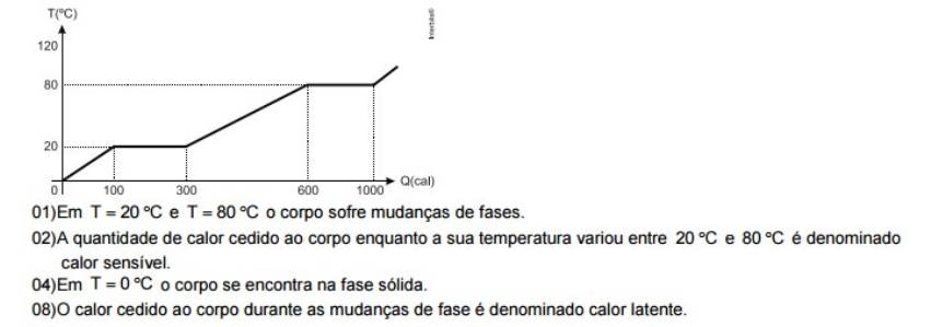 Lista de Exercicios Revisão de Calorimetria diagrama de fases e termodinâmica 1) Com relação aos conceitos de calor, capacidade térmica e calor específico, é correto afirmar: 01) A capacidade térmica de um corpo corresponde à quantidade de calor que ele absorve para aumentar de 1 ºC a sua temperatura. 02) A capacidade térmica de um corpo não depende da sua massa. 04) O calor específico de um material não depende da sua massa. 08) Quanto maior for o calor específico de um material, maior será a sua capacidade térmica. 16) O calor específico de um corpo depende do material de que é constituído. 32) Se dois corpos receberem a mesma quantidade de calor, aquele que tiver maior capacidade térmica sofrerá menor variação de temperatura. 2) (UNISINOS-RS) Nos dias de sol forte, à beira-mar, verifica-se que, durante o dia, a areia aquece muito mais rapidamente que a água do mar. À noite, a areia esfria mais rapidamente que a água do mar. Isso ocorre porque o calor específico da água do mar: a) é maior do que o da areia. b) é menor do que o da areia. c) é igual ao da areia. d) depende da massa de água. e) depende do volume de água. 3) (UFGO) Um bloco de cobre, de massa m = 200 g, é aquecido de 20 ºC até 70 ºC. a) Determine a quantidade de calor que foi cedida ao bloco. b) Se fornecermos a esse bloco 186 cal, de quanto se elevará sua temperatura? (Dado: calor específico do cobre c = 0,093 cal/g ºC) 4) (UEPB) A massa de um objeto é igual a 2 kg. Recebendo 10 kcal, a sua temperatura passa de 40 o C para 90 ºC. Qual calor específico desse corpo 5) (UF-MG) Um corpo tem capacidade térmica igual a 18 cal/°C e o calor específico do material que o constitui é igual a 0,12 cal/g°C. Qual massa desse corpo vale: 6) (Uepg 2013)O gráfico abaixo mostra a evolução da temperatura de um corpo de massa m, constituído por uma substância pura, em função da quantidade de calor que lhe é fornecida. Com base nas informações desse gráfico, assinale o que for correto. 7) (Unesp 2013) Por que o deserto do Atacama é tão seco? 8) (UFSM-RS) Um corpo de 400g e calor específico sensível de 0,20 cal/g°C, a uma temperatura de 10°C, é colocado em contato térmico com outro corpo de 200g e calor específico sensível de 0,10 cal/g°C, a uma temperatura de 60°C. A temperatura final, uma vez estabelecido o equilíbrio térmico entre os dois corpos, será de a) 14°C b) 15°C c) 20°C d) 30°C e) 40°C 9) Num calorímetro contendo 200g de água a 20°C coloca-se uma amostra de 50g de um metal a 125°C. Verifica-se que a temperatura de equilíbrio é de 25°C. Desprezando o calor absorvido pelo calorímetro, o calor específico sensível desse metal, em cal/g°C, vale: a) 0,10 b) 0,20 c) 0,50 d) 0,80 e) 1,00 10) (UNISA-SP) Tem-se 20 gramas de gelo a –20°C. A quantidade de calor que se deve fornecer ao gelo para que ele se transforme em 20 gramas de água a 40°C é:dado Calor específico sensível do gelo = 0,50 cal/g°C Calor específico sensível da água = 1,0 cal/g°C 11) (UNIFENAS-MG) 500g de água devem sofrer uma elevação de temperatura de 60°C em 5 minutos. Sabendo-se que 20% do calor gerado pelo aparelho é perdido, podemos afirmar que a potência elétrica necessária para que isto ocorra deve ser igual a: a) 200 watts b) 300 watts c) 500 watts d) 600 watts e) 1000 watts Dados: calor específico sensível da água= 1,0 cal/g°C; 1 cal=4,0J 12) (MACKENZIE) Quando misturamos 1,0Kg de água (calor específico sensível = 1 cal/g°C) a 70°C com 2,0Kg de água a 10°C, obtemos 3,0 kg de água a: a) 10°C b) 20°C c) 30°C d) 40°C e) 50°C 13) 14) O diagrama de fases apresentado abaixo é de uma substância hipotética. Clique para ampliar a) Em que fase a substância se encontra quando sob pressão de 300 mm Hg e à temperatura de 10 ºC? b) Em que fase a substância se encontra quando sob pressão de 300 mm Hg e à temperatura de 30 ºC? c) Qual é o nome da mudança de fase que ocorre quando a substância passa de B para A? d) Qual é o nome da mudança de fase que ocorre quando a substância passa de D para E? e) Em que fase a substância não poderá se encontrar se estiver submetida a uma pressão inferior à do ponto triplo T? f) Sendo C o ponto crítico, é possível liquefazer a substância, por meio de uma compressão isotérmica, estando à temperatura de 70 ºC? 15) (Uema) Sobre um sistema realiza-se um trabalho de 3.000 J e, em resposta, ele fornece 500 cal de calor durante o mesmo intervalo de tempo. Considerando 1 cal 4,2 J, a variação de energia interna do sistema durante esse processo é: a) 2.500 J b) 900 J c) 900 J d) 2.100 J e) 2.100 J image1.png image2.png image3.png image4.png